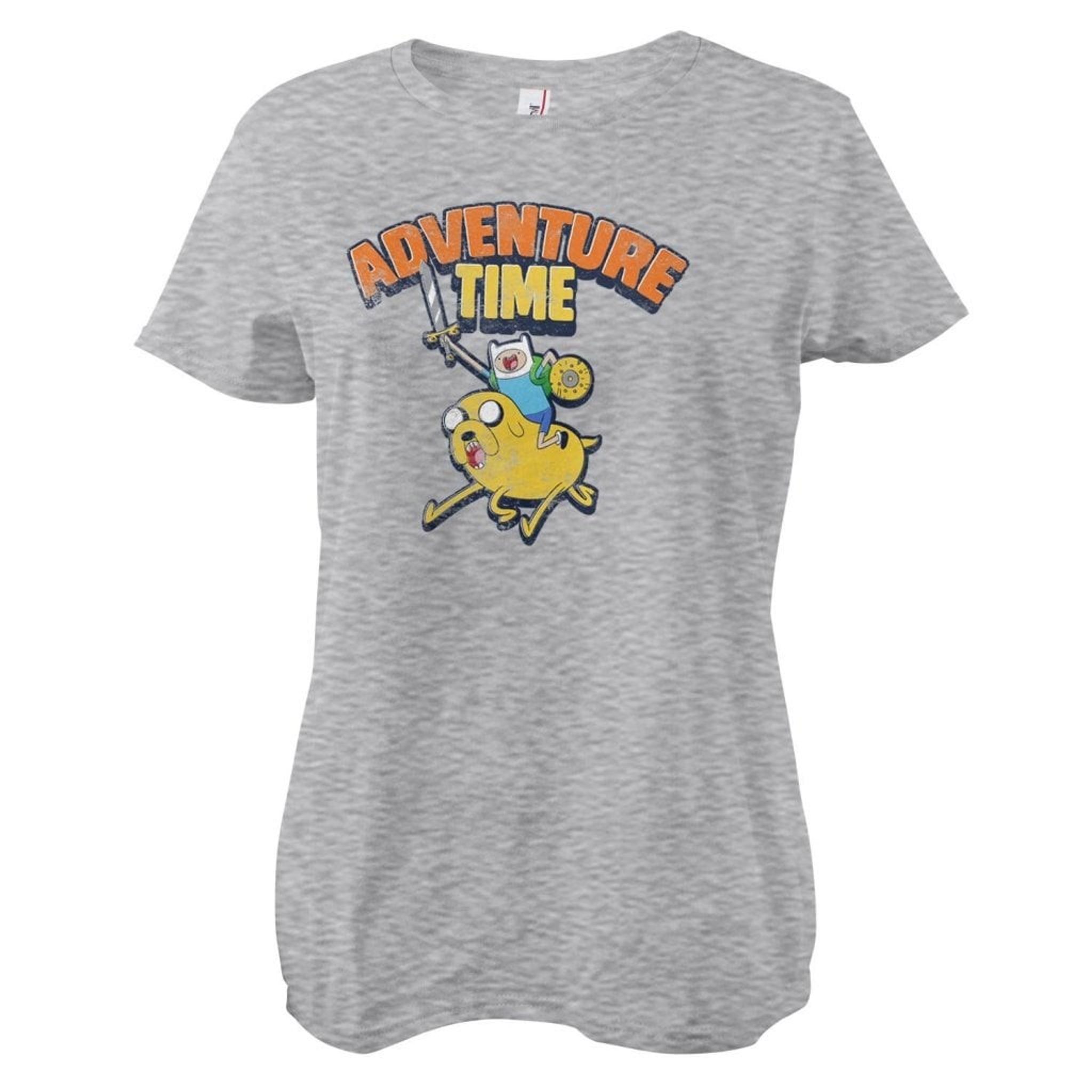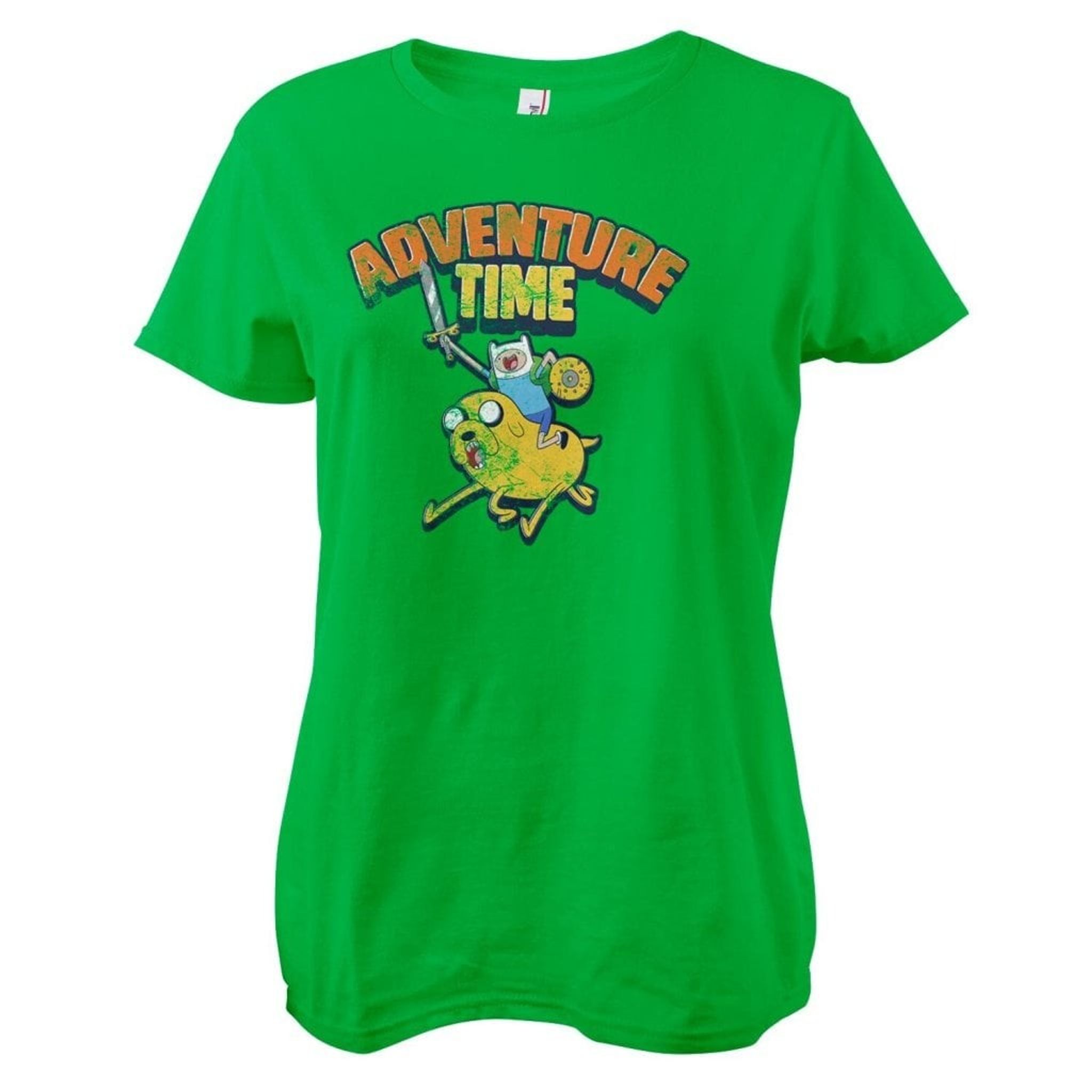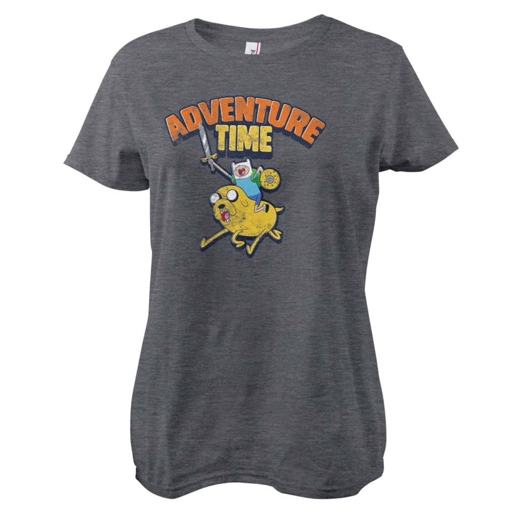 The motif on Adventure Time Washed Girly tee develops a nostalgic sense of childhood adventure. A human -like figure with a blue hue and a hat, armed with sword and shield, rides on the back of a yellow companion with big eyes and an open mouth. Above them, "Adventure Time" floats in robust fonts, as if the words were carved from a cliff in a country where each letter is an invitation to new discoveries. The characters appear to be on their way to new adventures or much needed rest, ready to take on what the world has to offer.