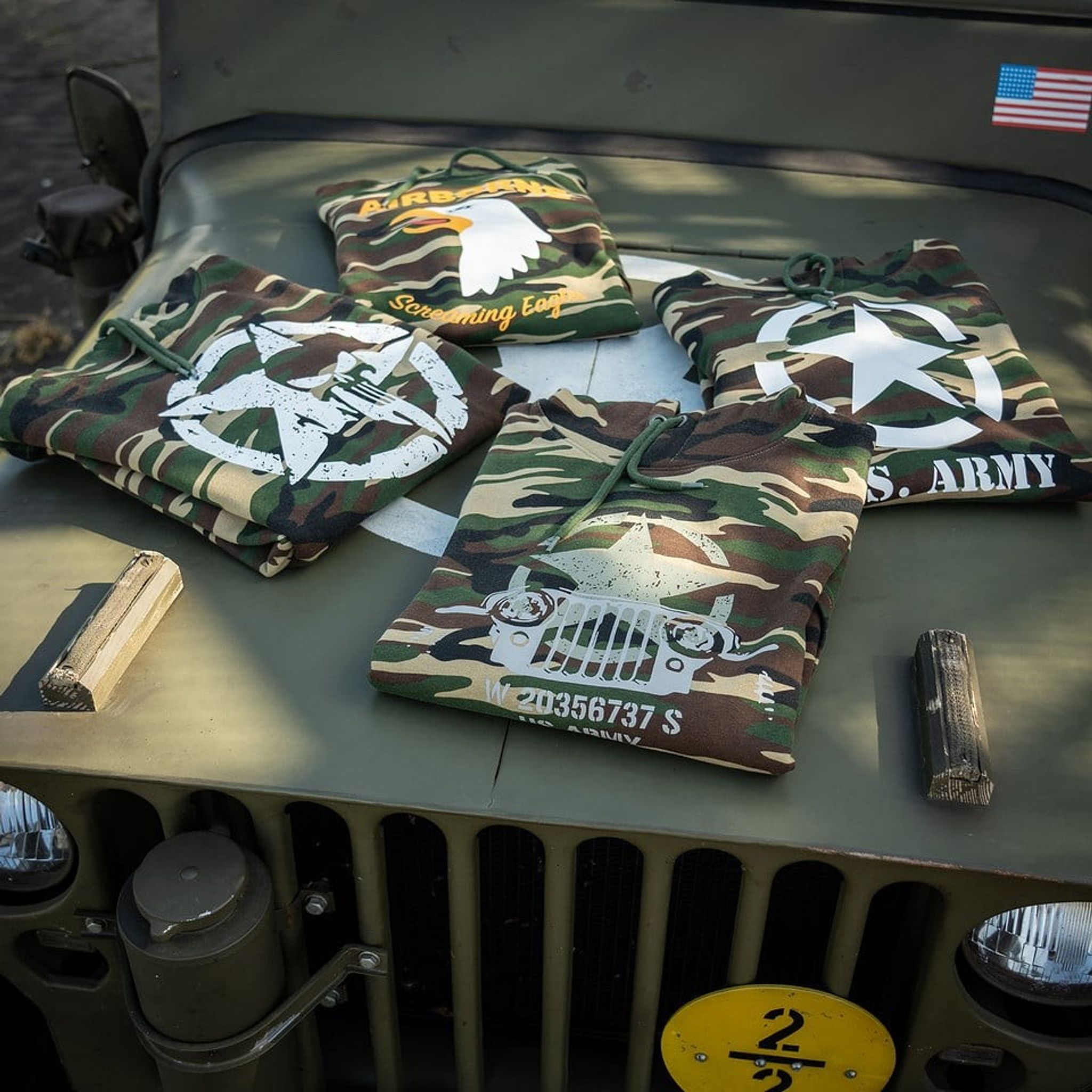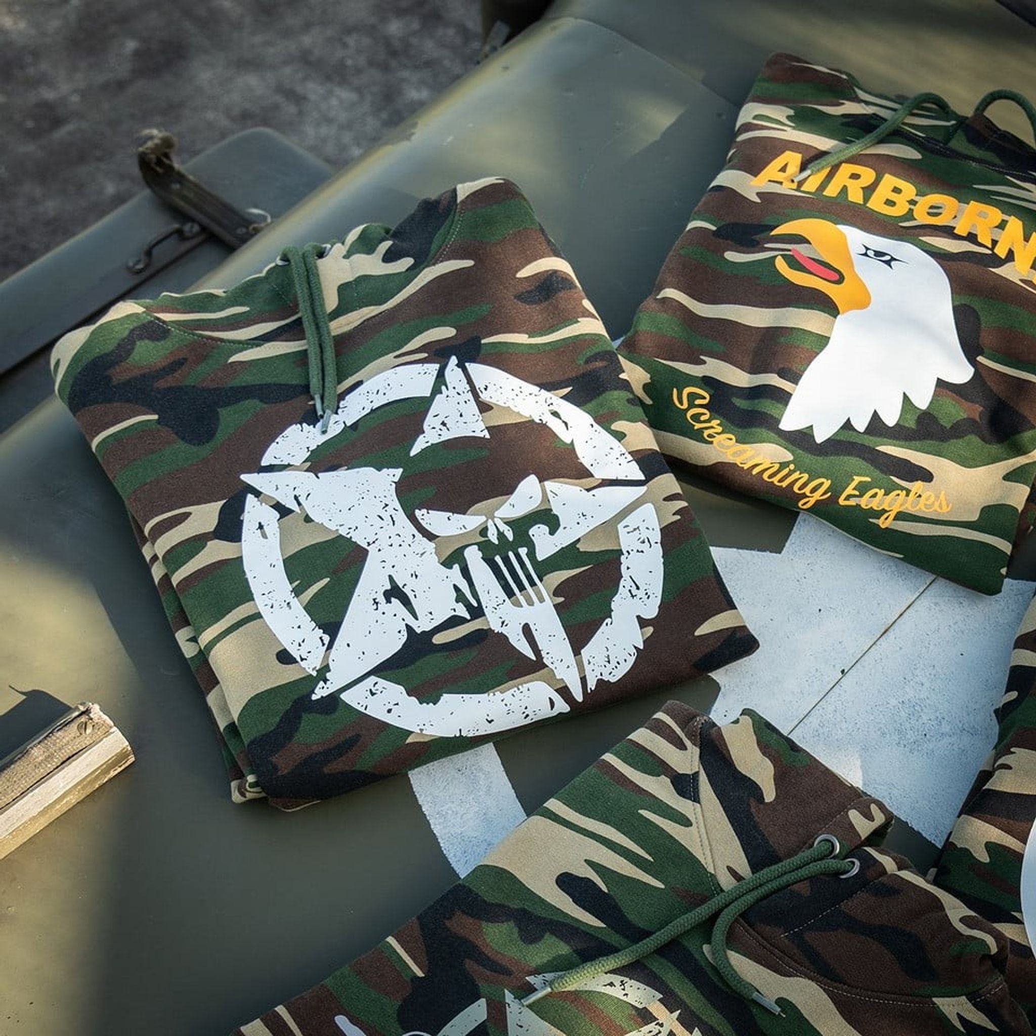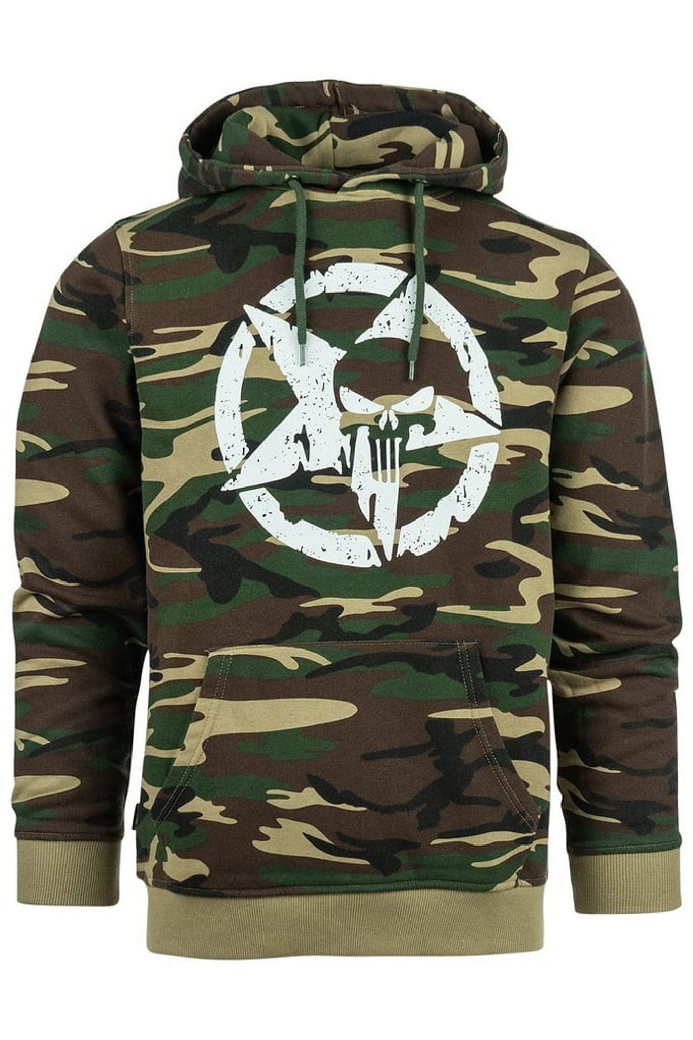 The hoodie has a stylish woodland camouflage pattern and is decorated with a US army star with the Punisher skull printed on the chest. This provides a unique and eye-catching detail that is suitable for both work and casual occasions.