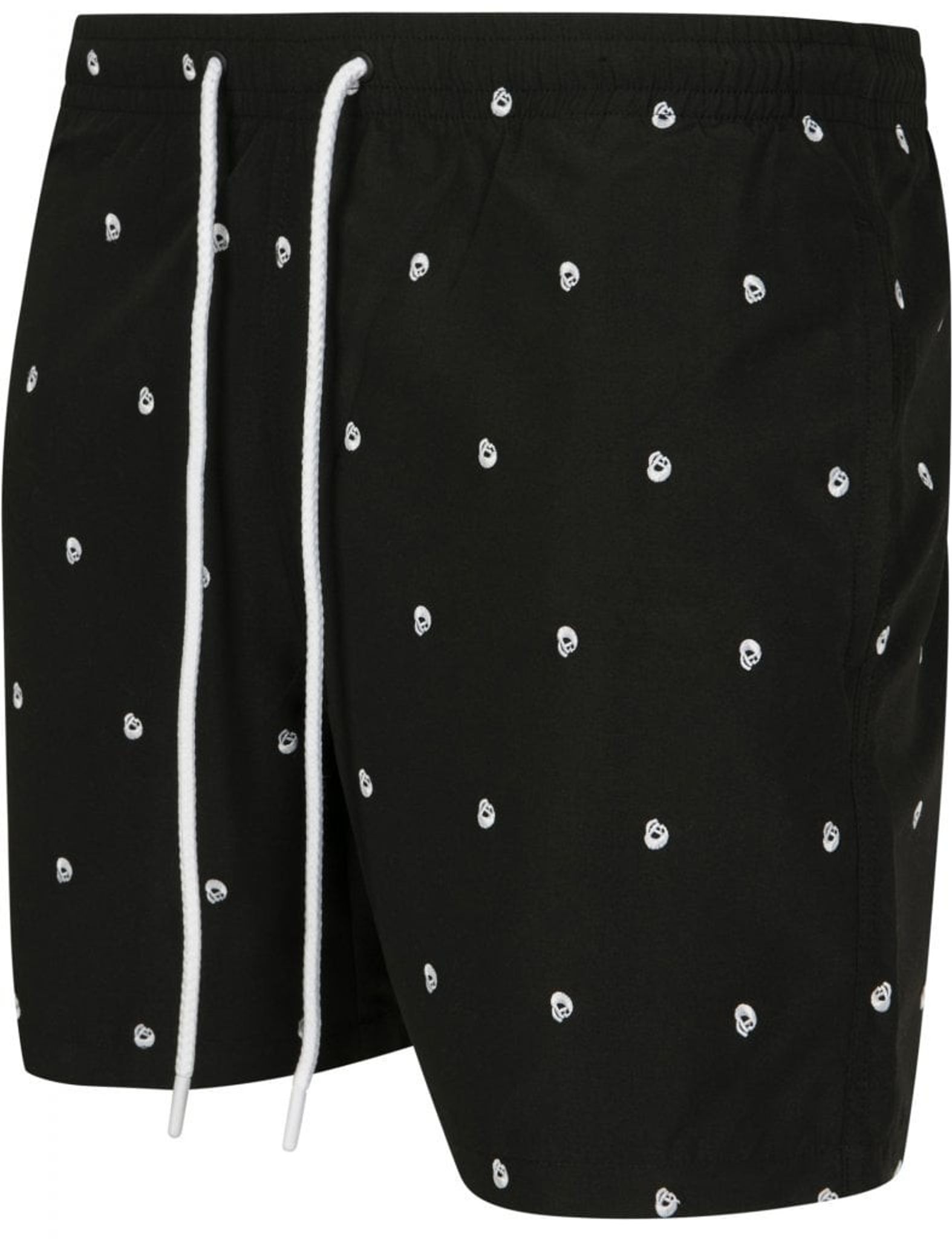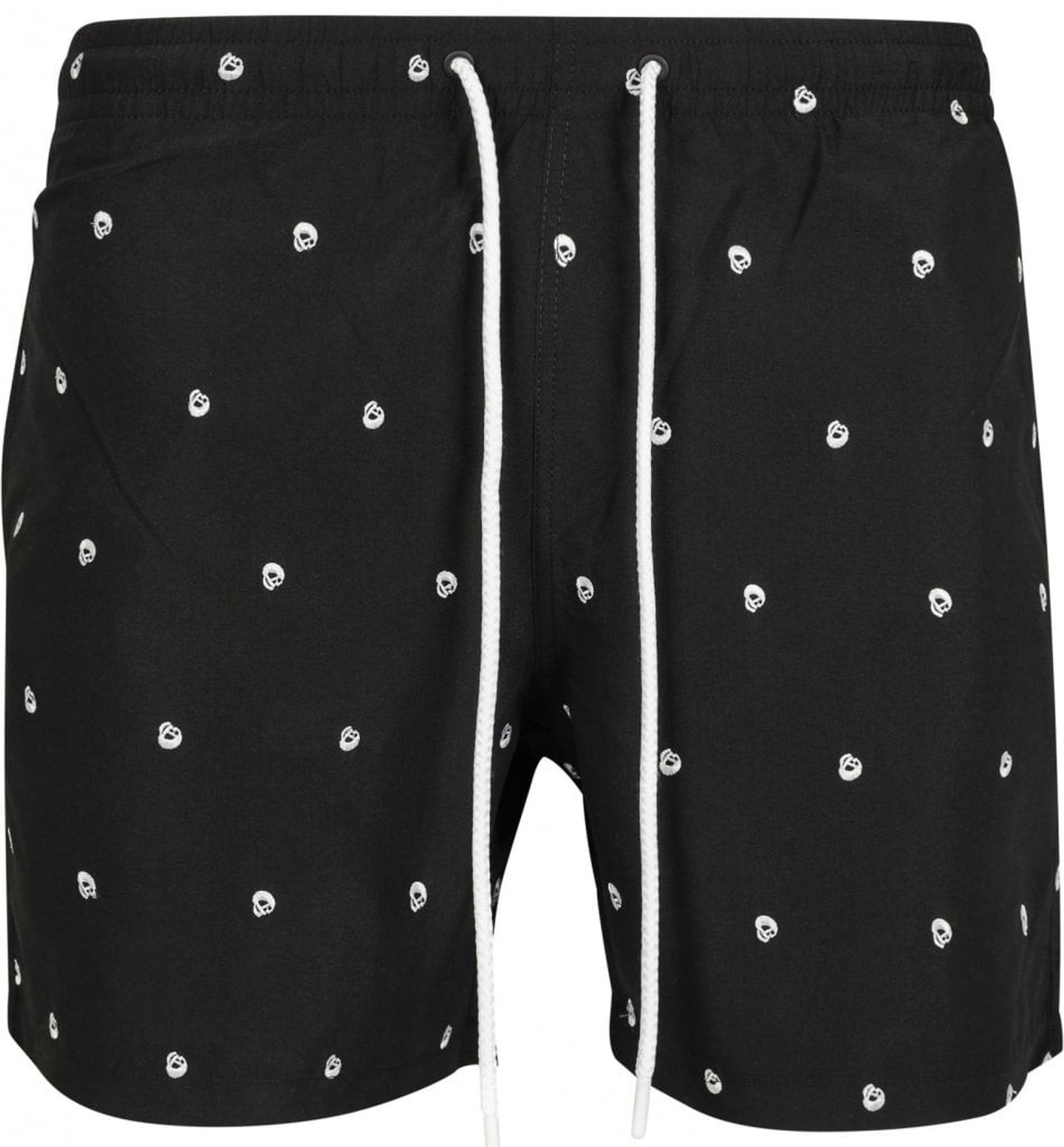 A pair of black shorts with small embroidered skulls all over the pants. In the waist, the bath shorts have a lacing with white string that matches the chalk-white skulls.