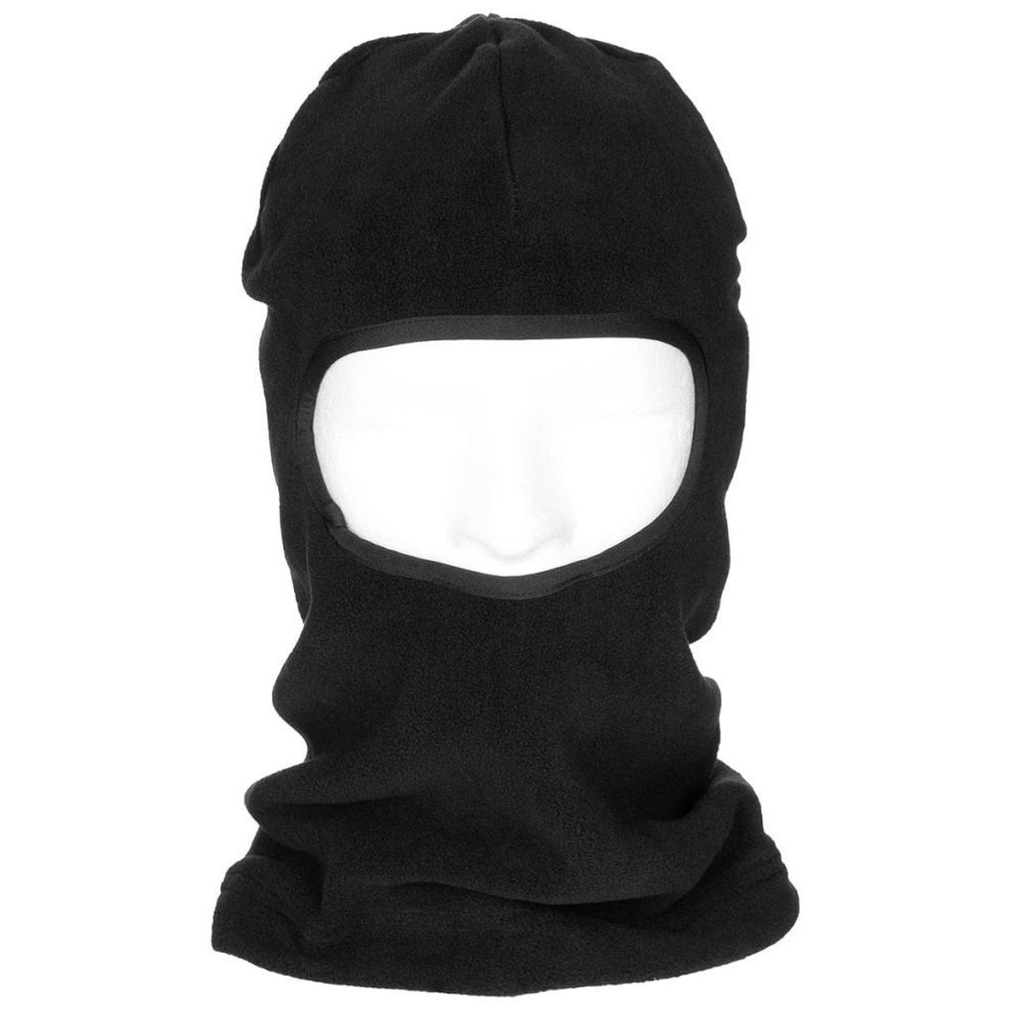 A balaclava in fleece fabric and with a large hole. The balaclava is elastic at the neck.
