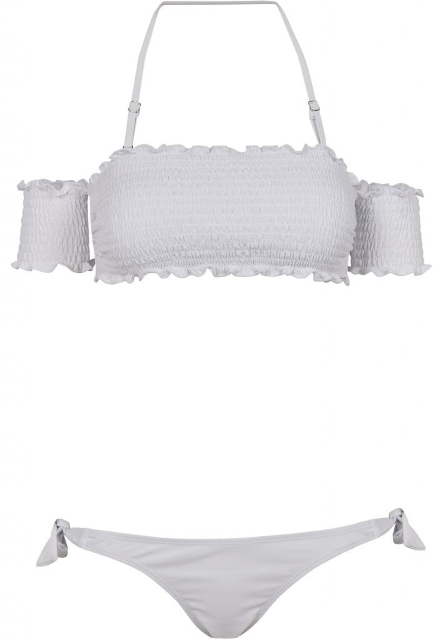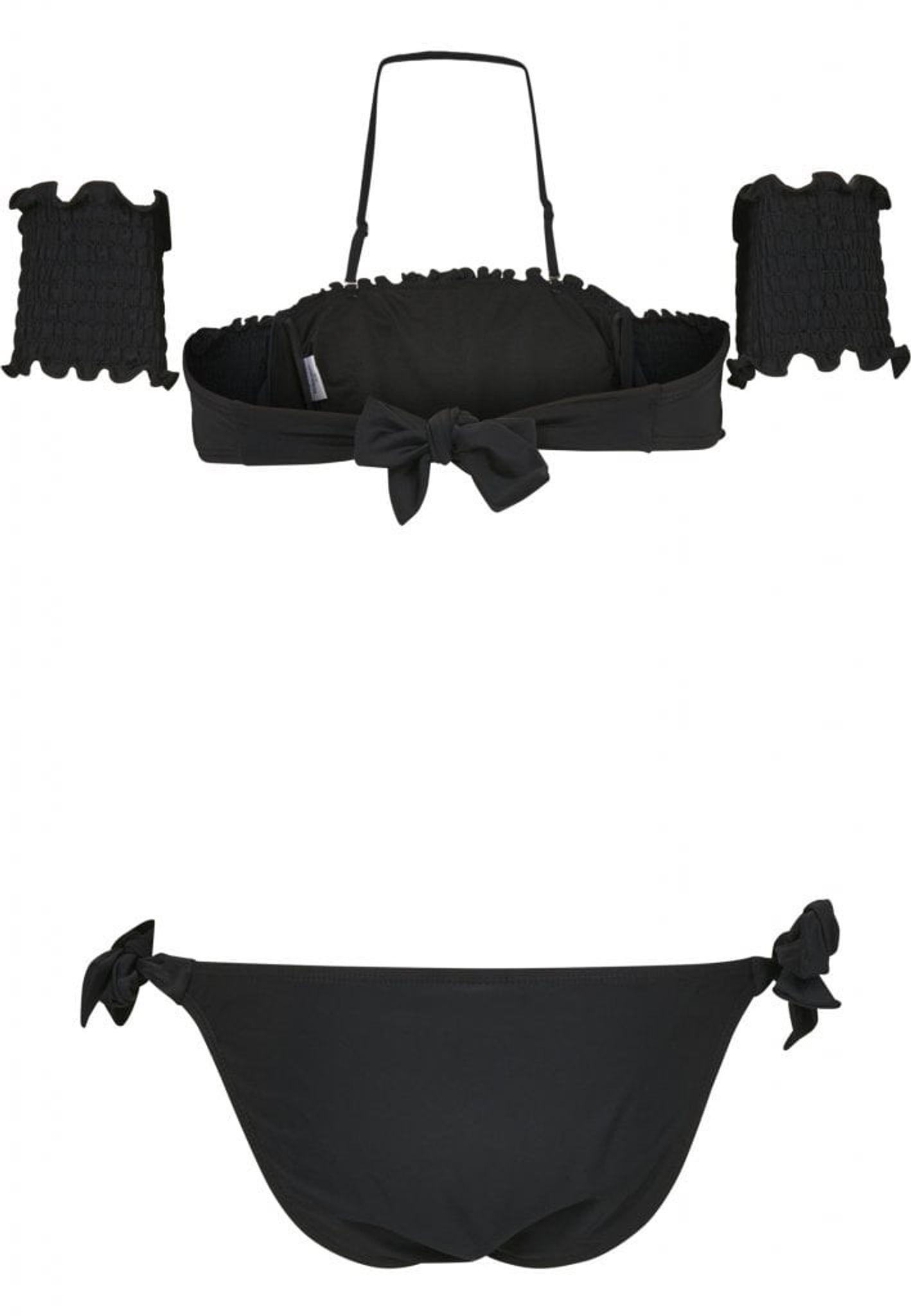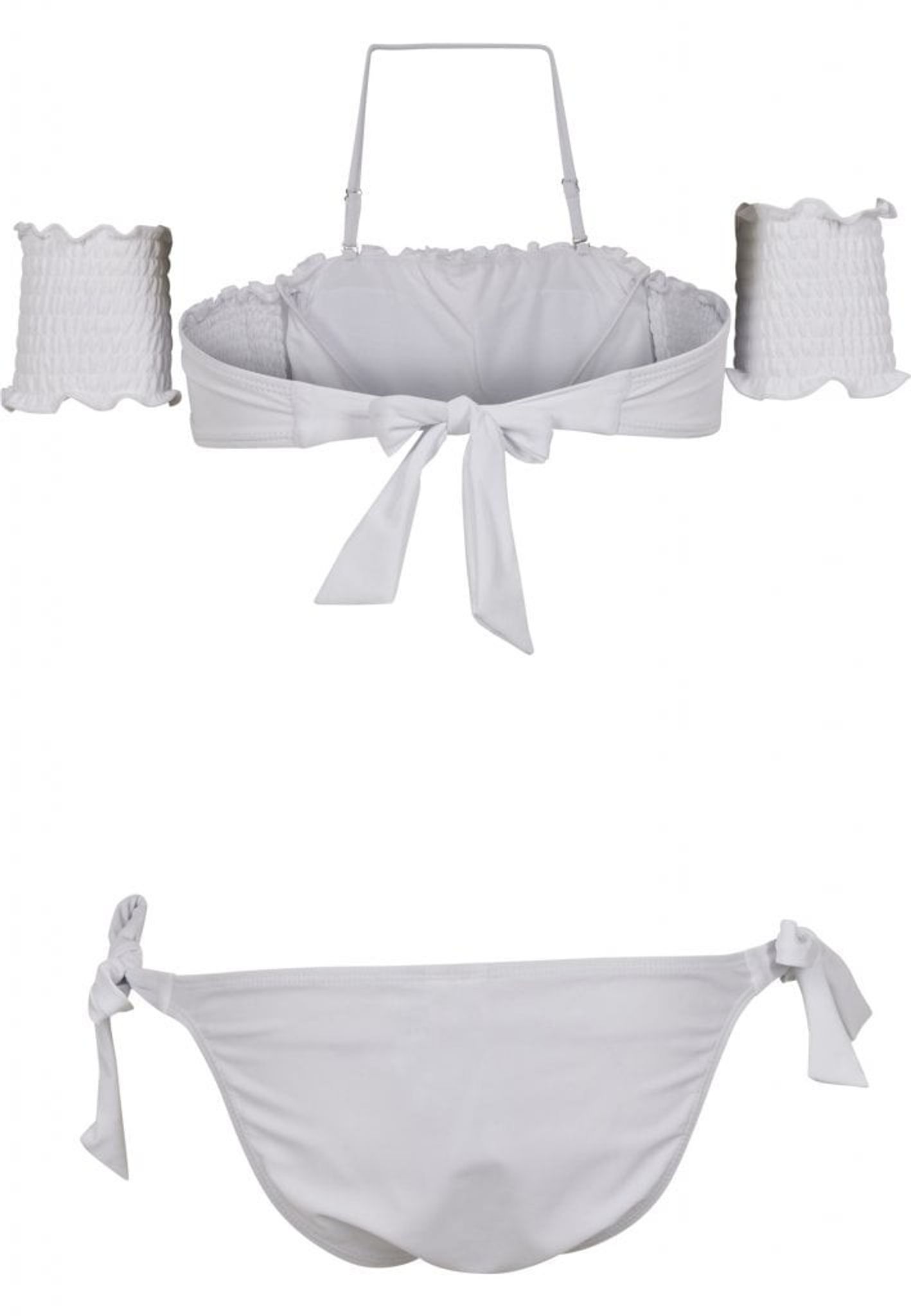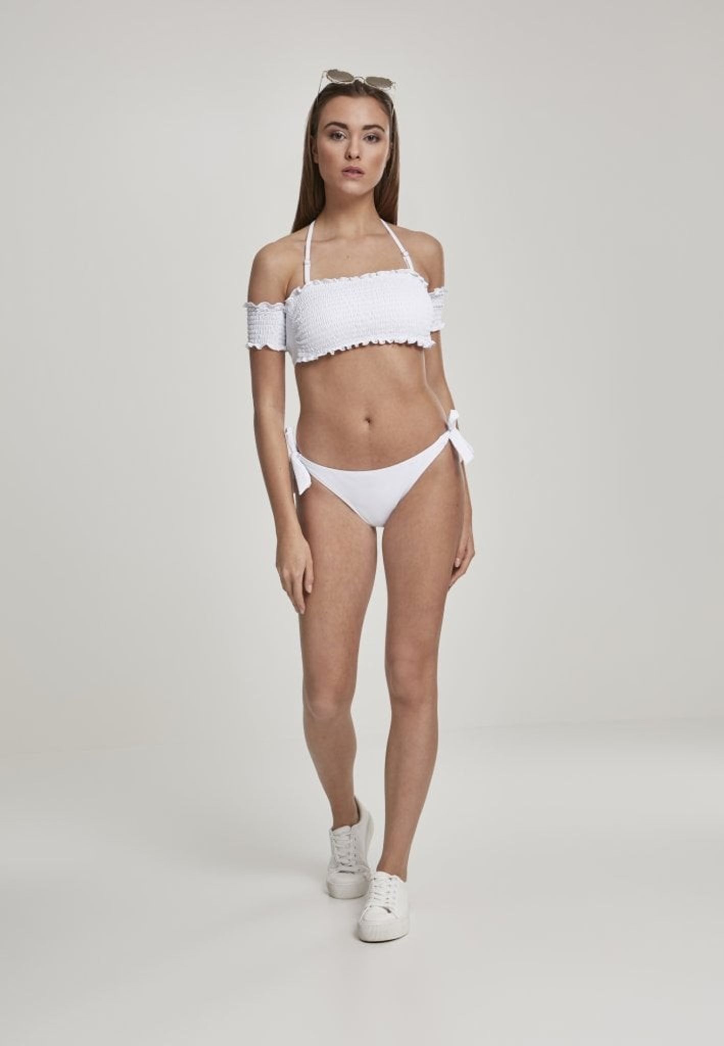 This is a bikini where the entire top is wrinkled and the top also has a small arm with smock.