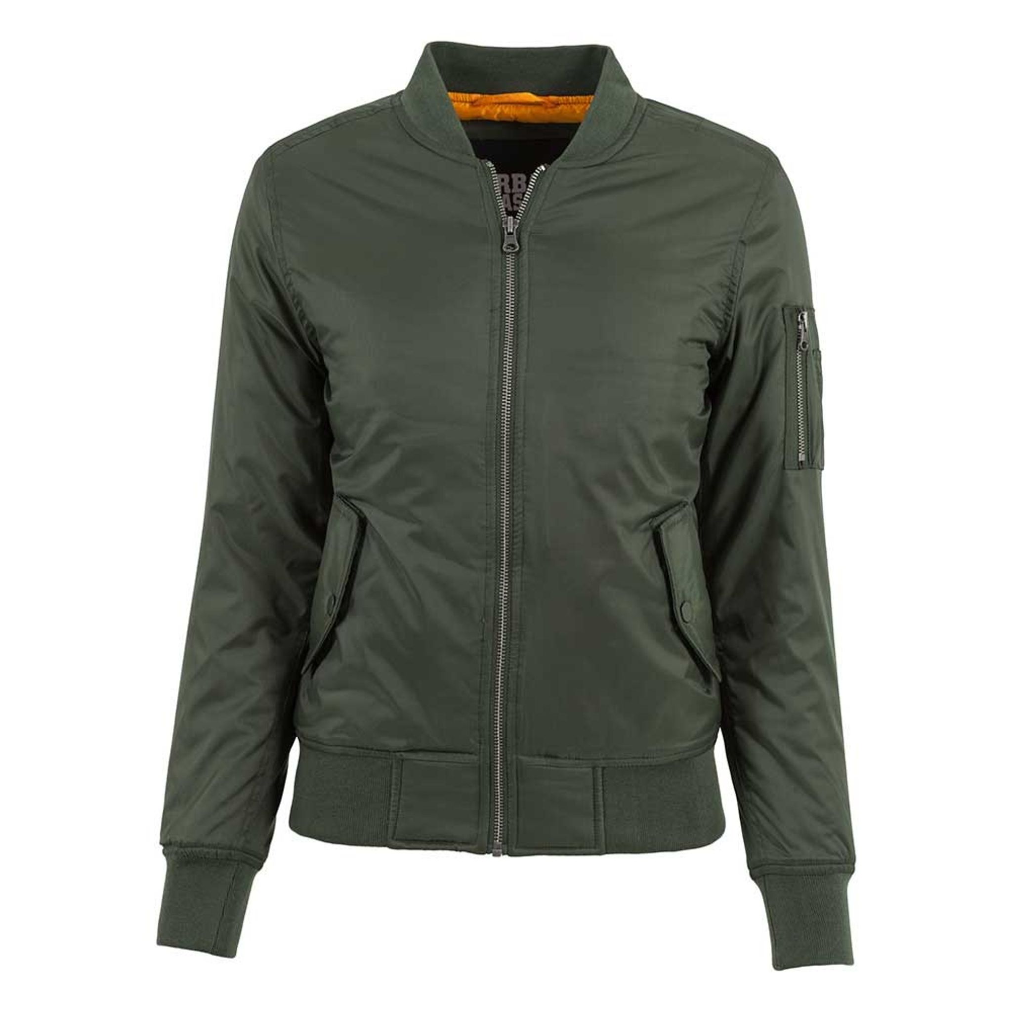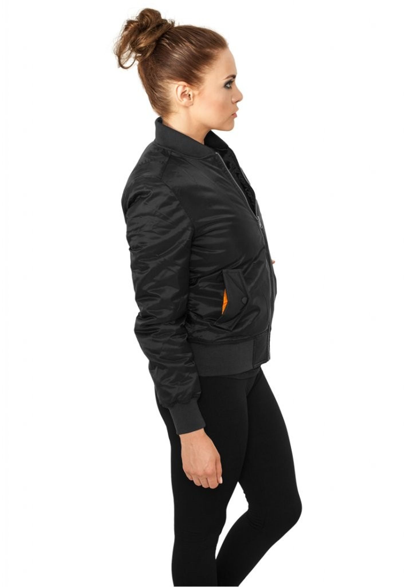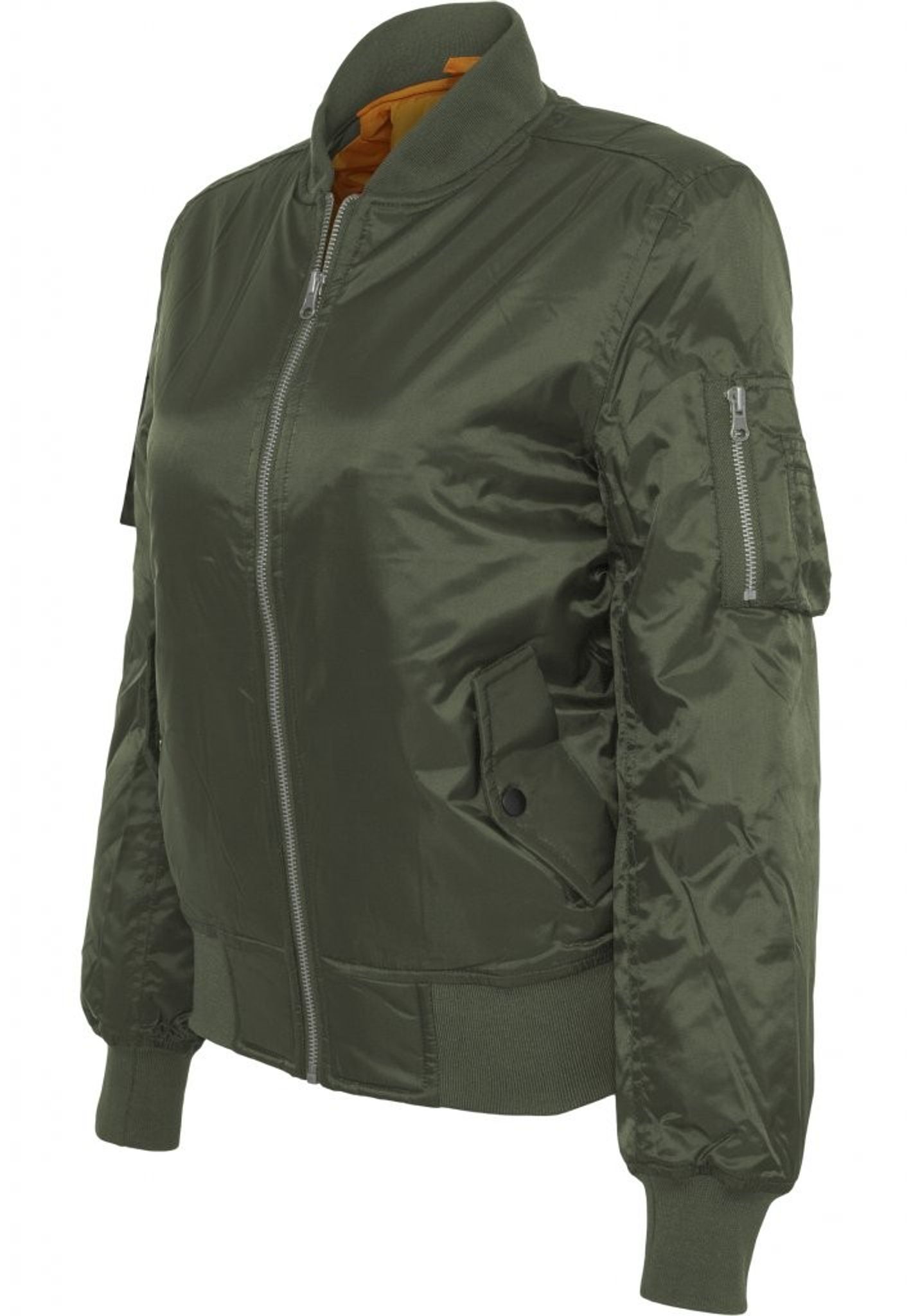 The inside is lined with the orange fabric that is classic for the bomber jacket.