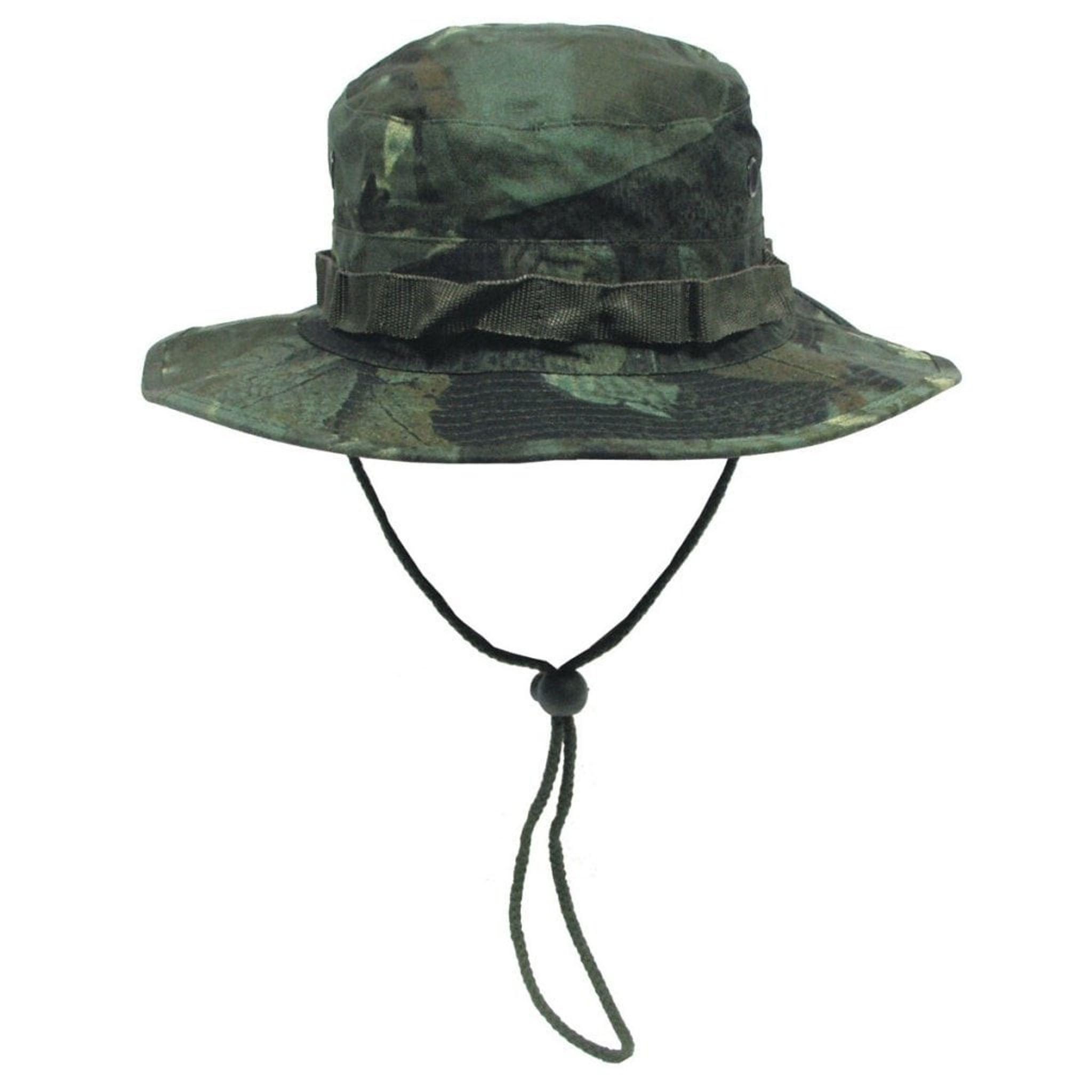 Fabric hat with a wide brim that protects the eyes from the sun and a fabric in a green photo camo.