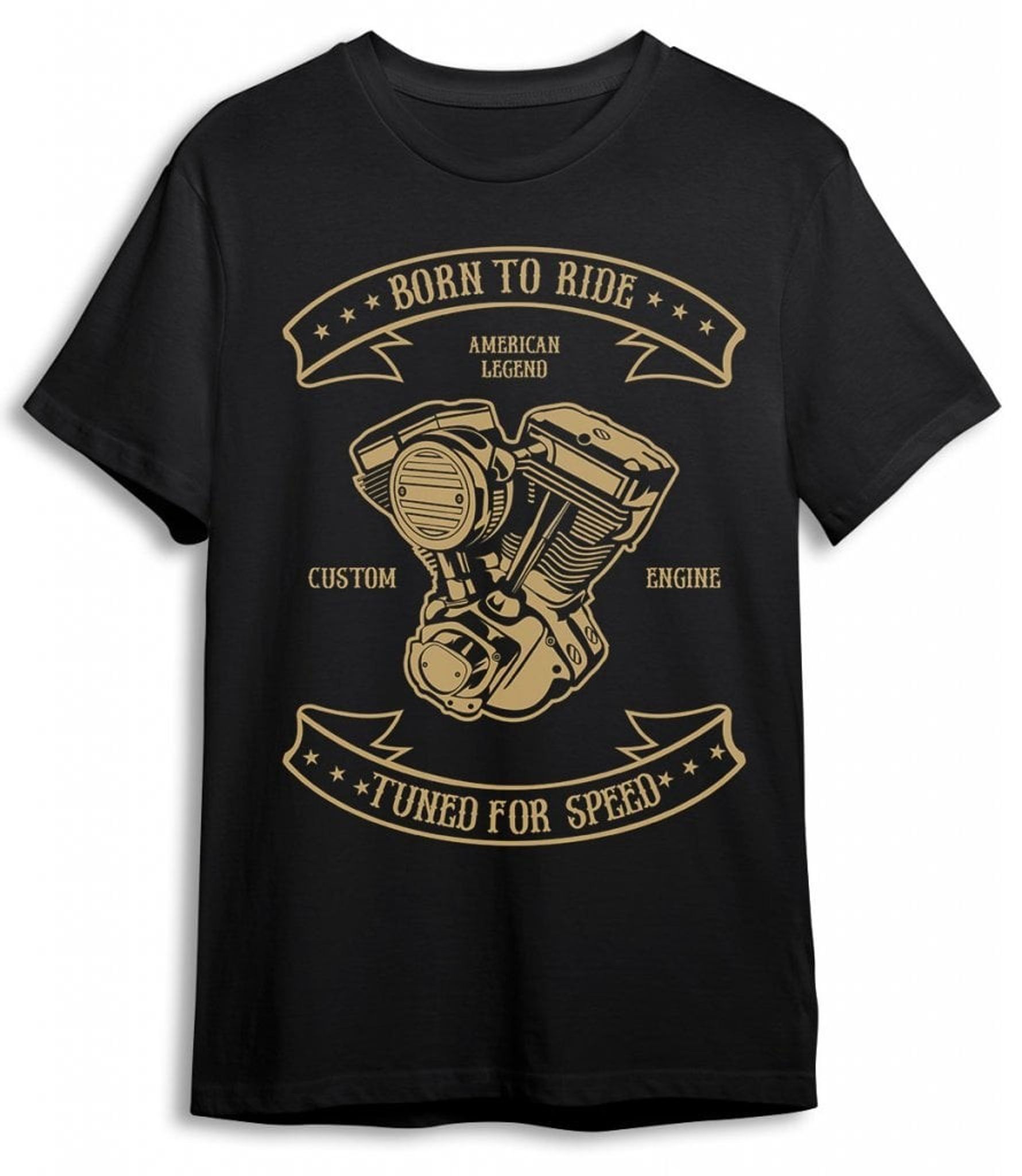 This Born to ride T-shirt is a must-have for anyone who loves motorcycles and speed. The design on the front includes an impressive image of a motorcycle engine along with the text "Born To Ride, Tuned For Speed" in banners, giving an inspiring sense of freedom and power.