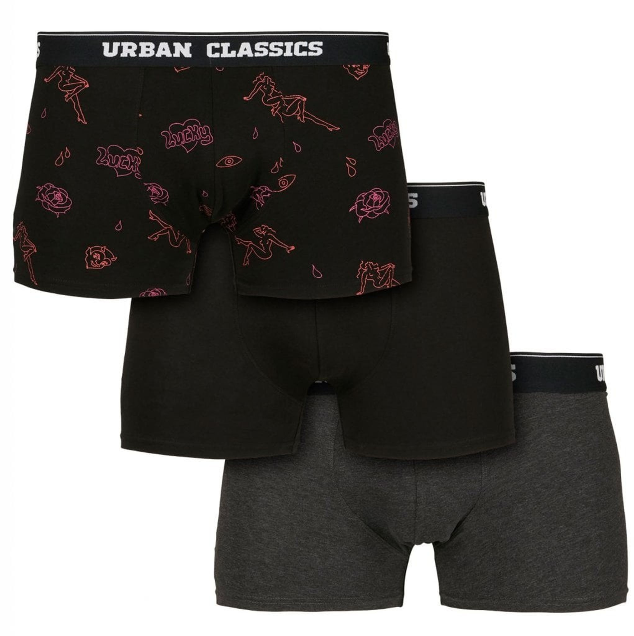 Here you have a 3-pack of boxer shorts where you have a pair of printed boxer shorts, a pair of black and a pair of dark gray.