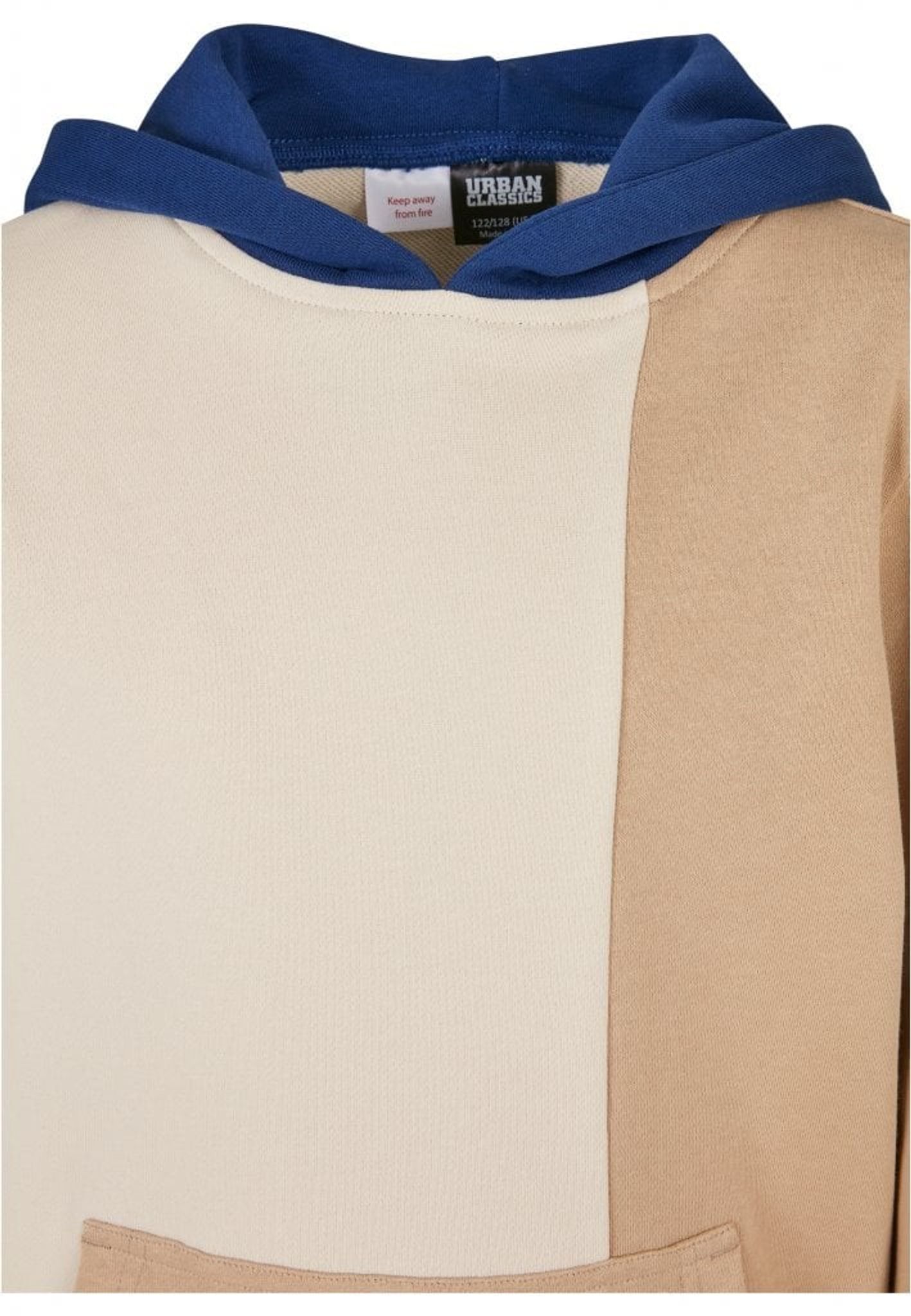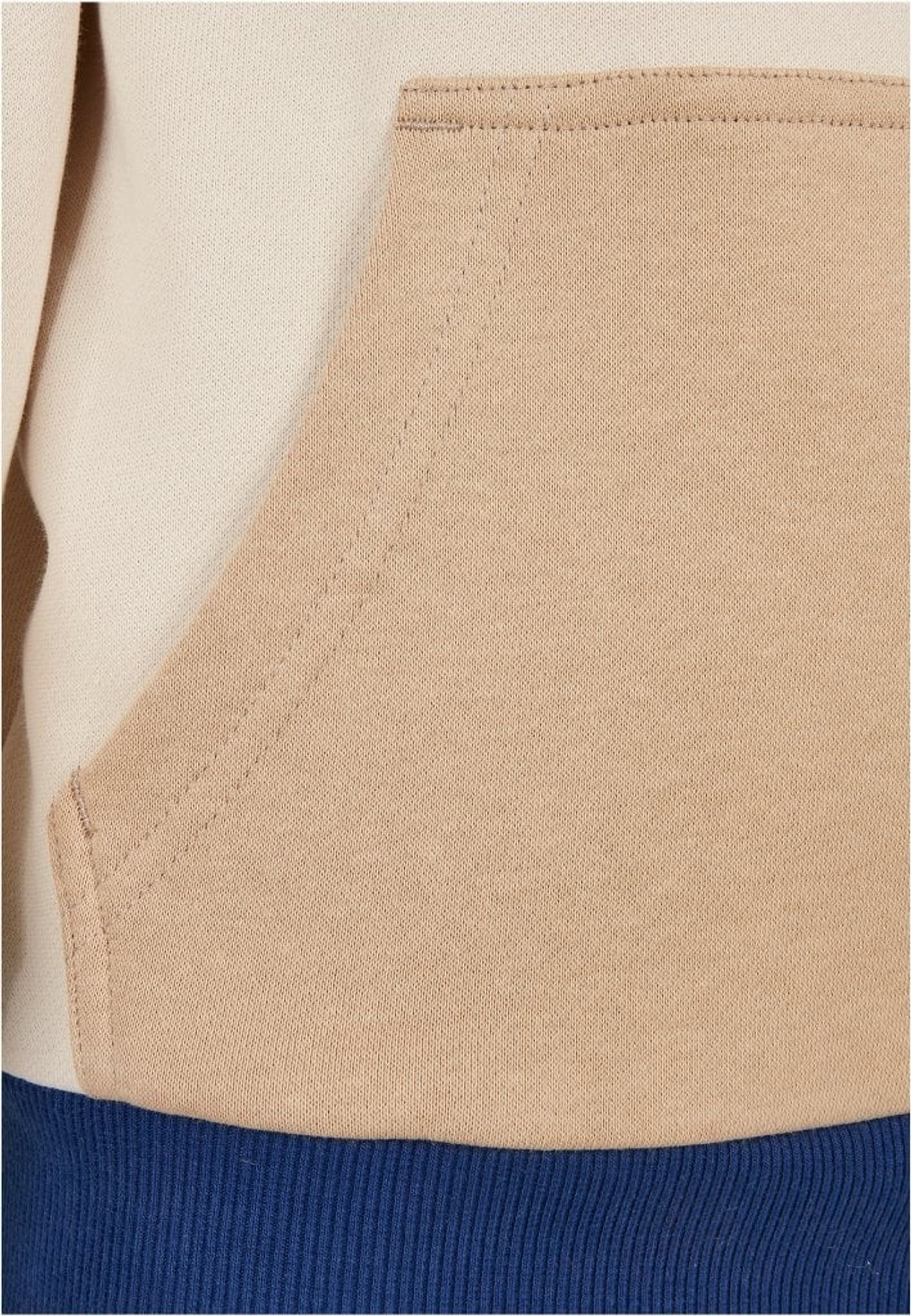 A hooded sweater that is divided with several colors. Where the hood and cuffs are in the blue and the sweater has two different colors of beige.