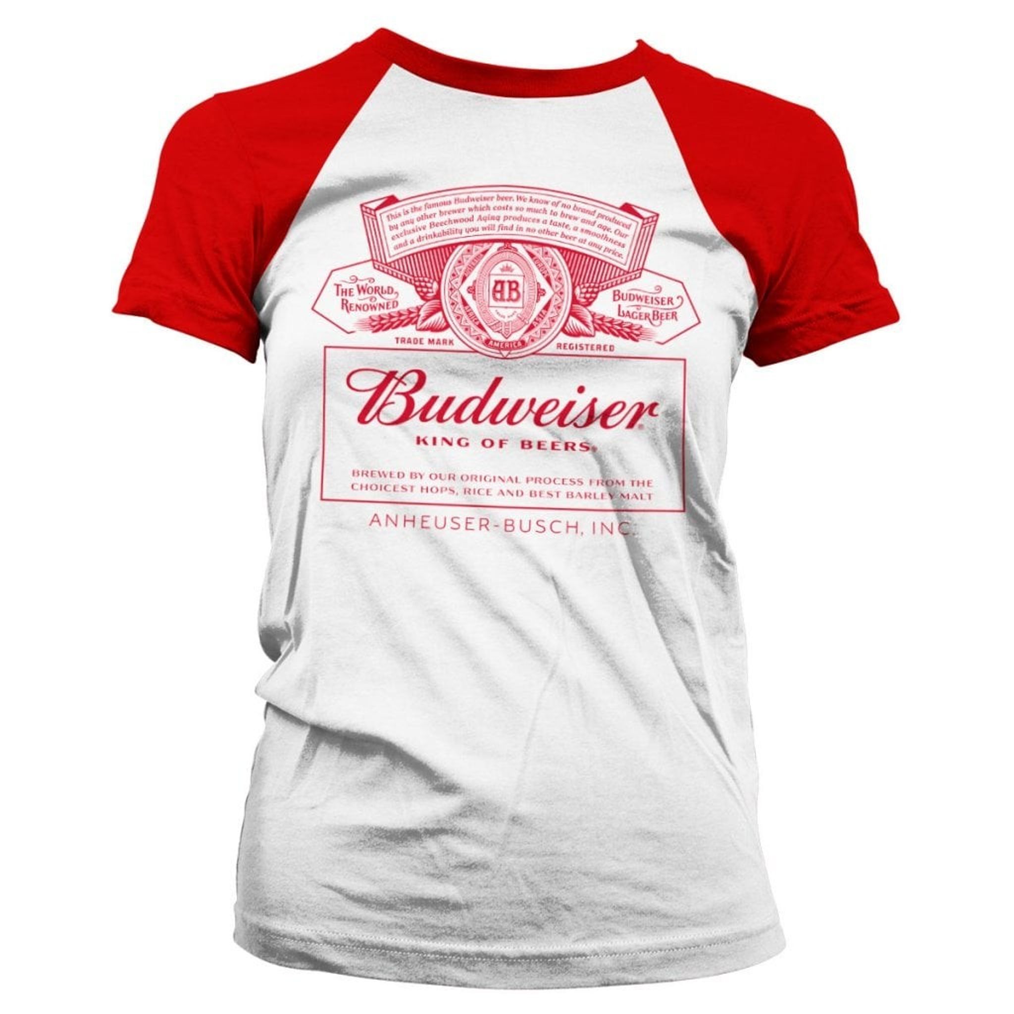 A baseball T-shirt with red sleeves and white body. Budweiser's red logo matches the sleeves.