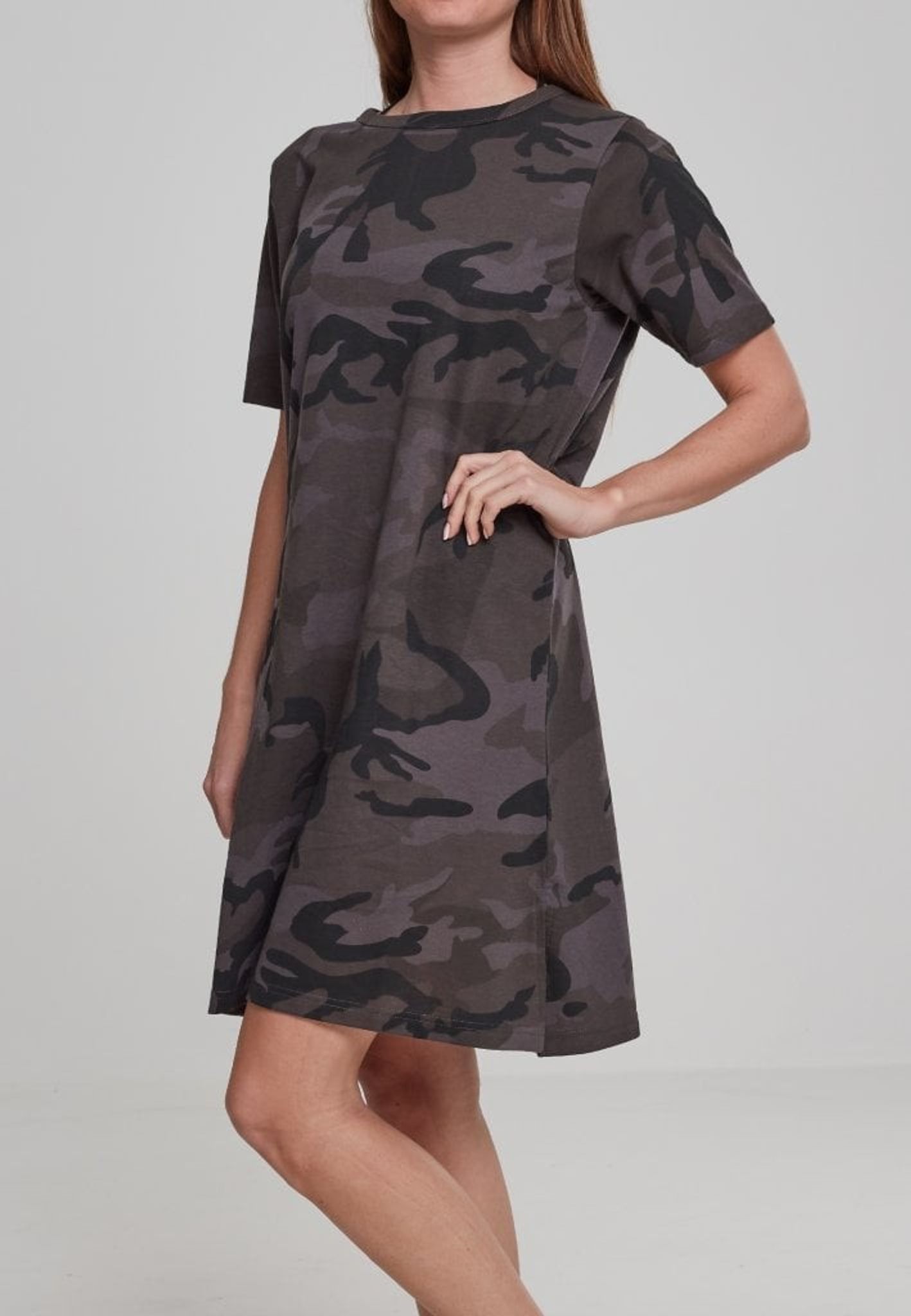 Here you have a dress in nice dark camouflage. The dress is made a bit like a long t-shirt with further collar and, of course, a modern shed so it's a really nice dress.