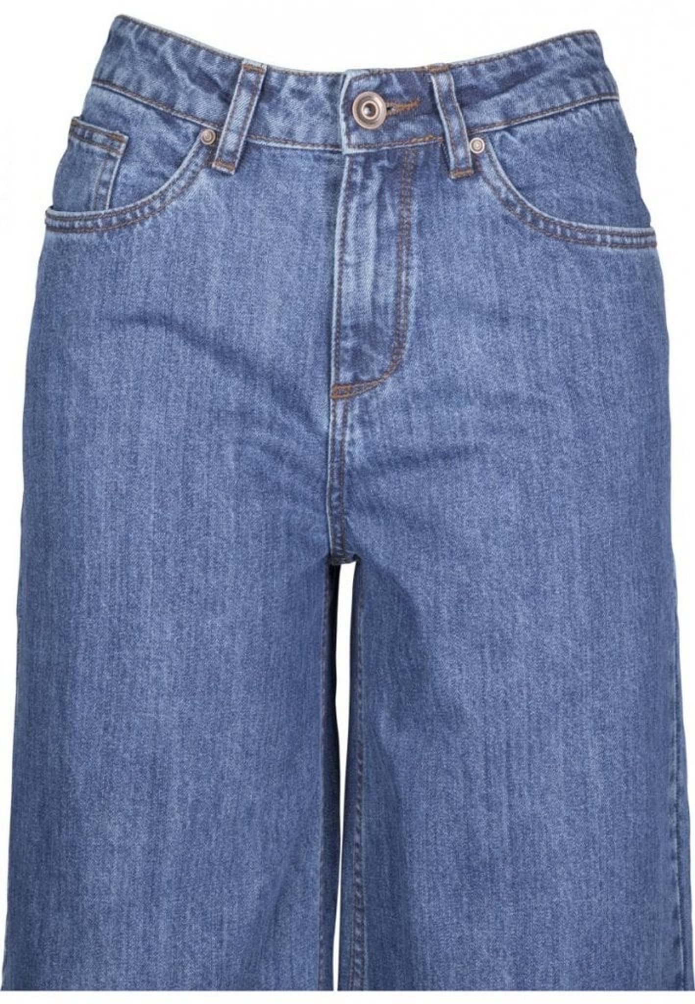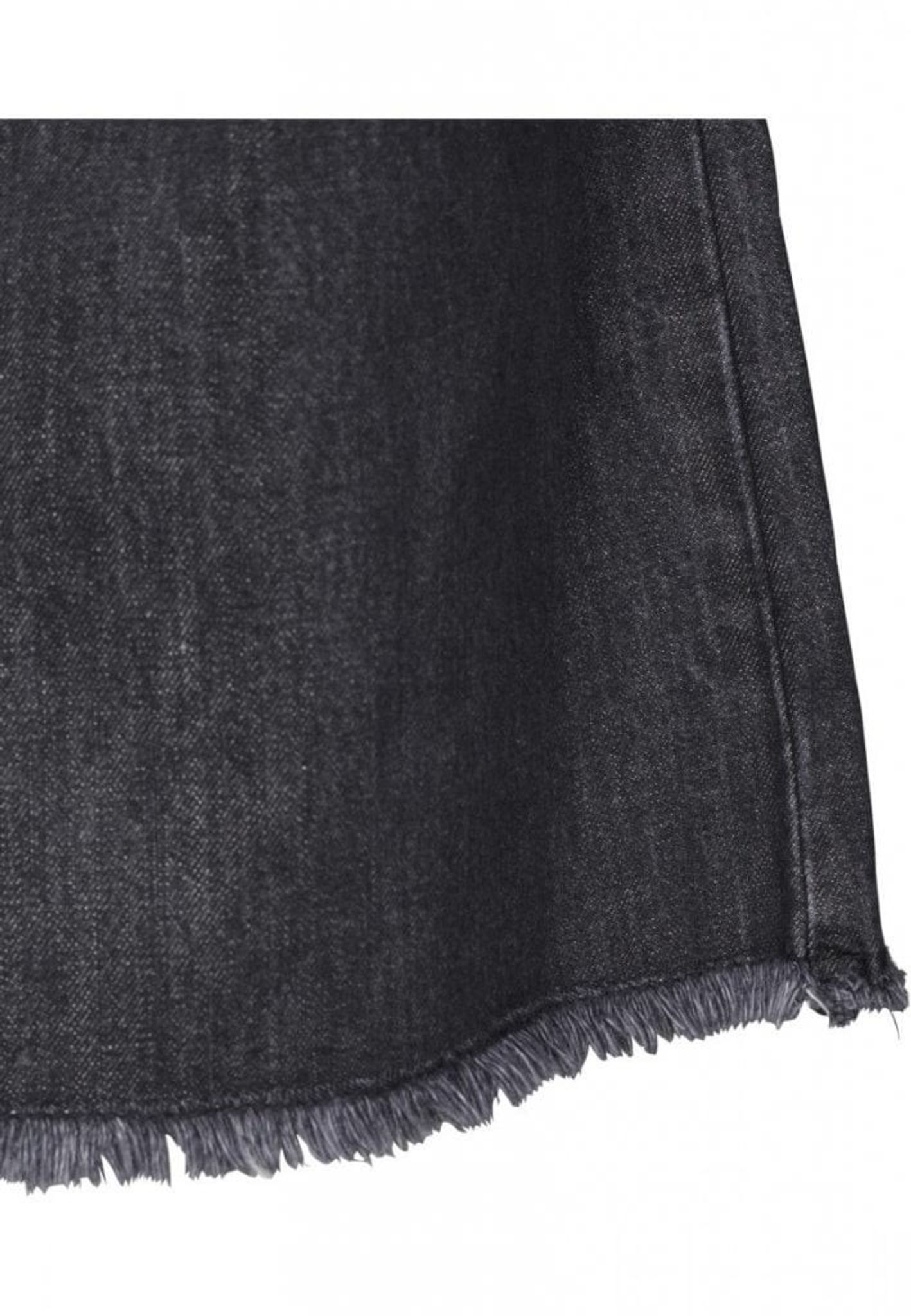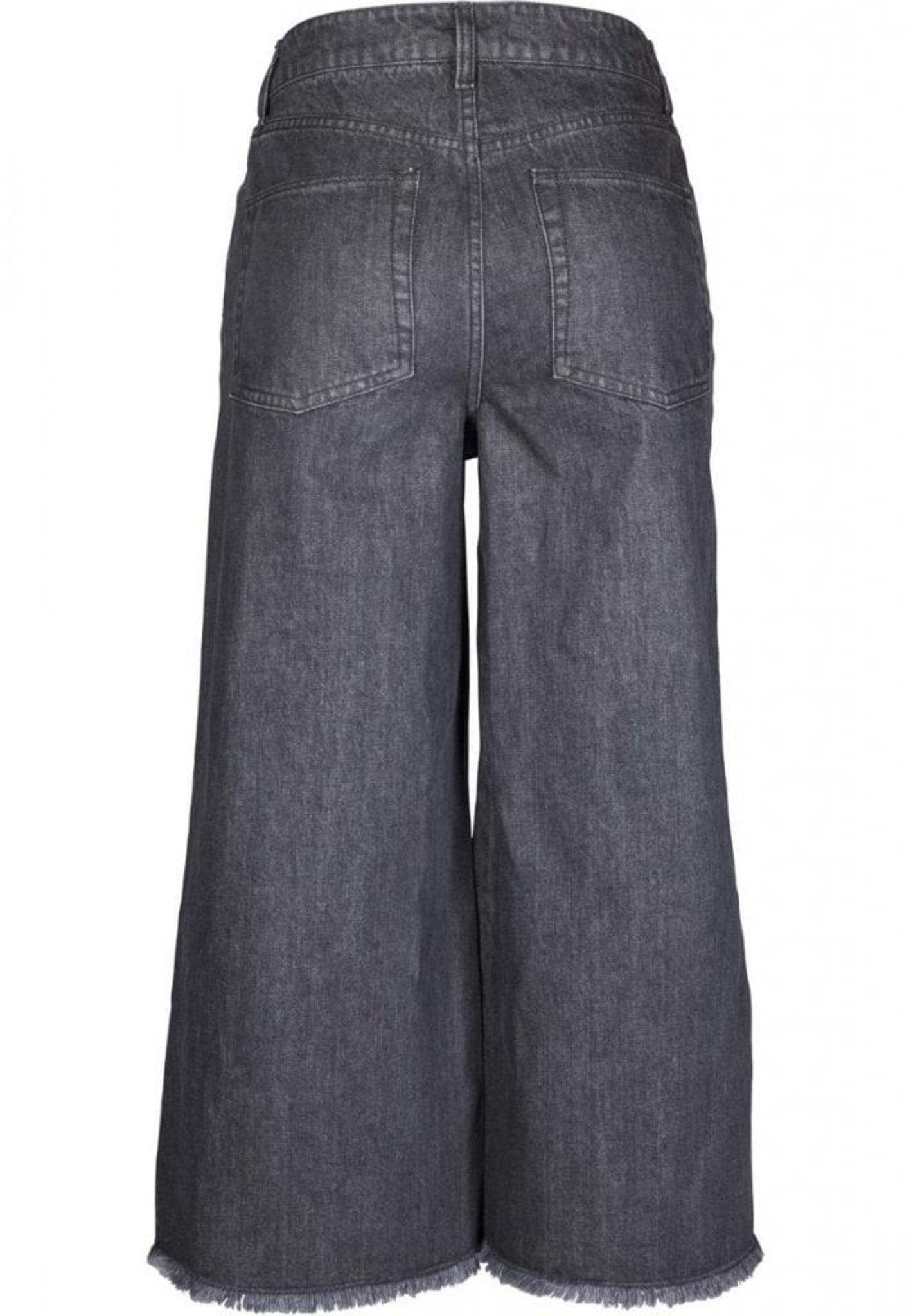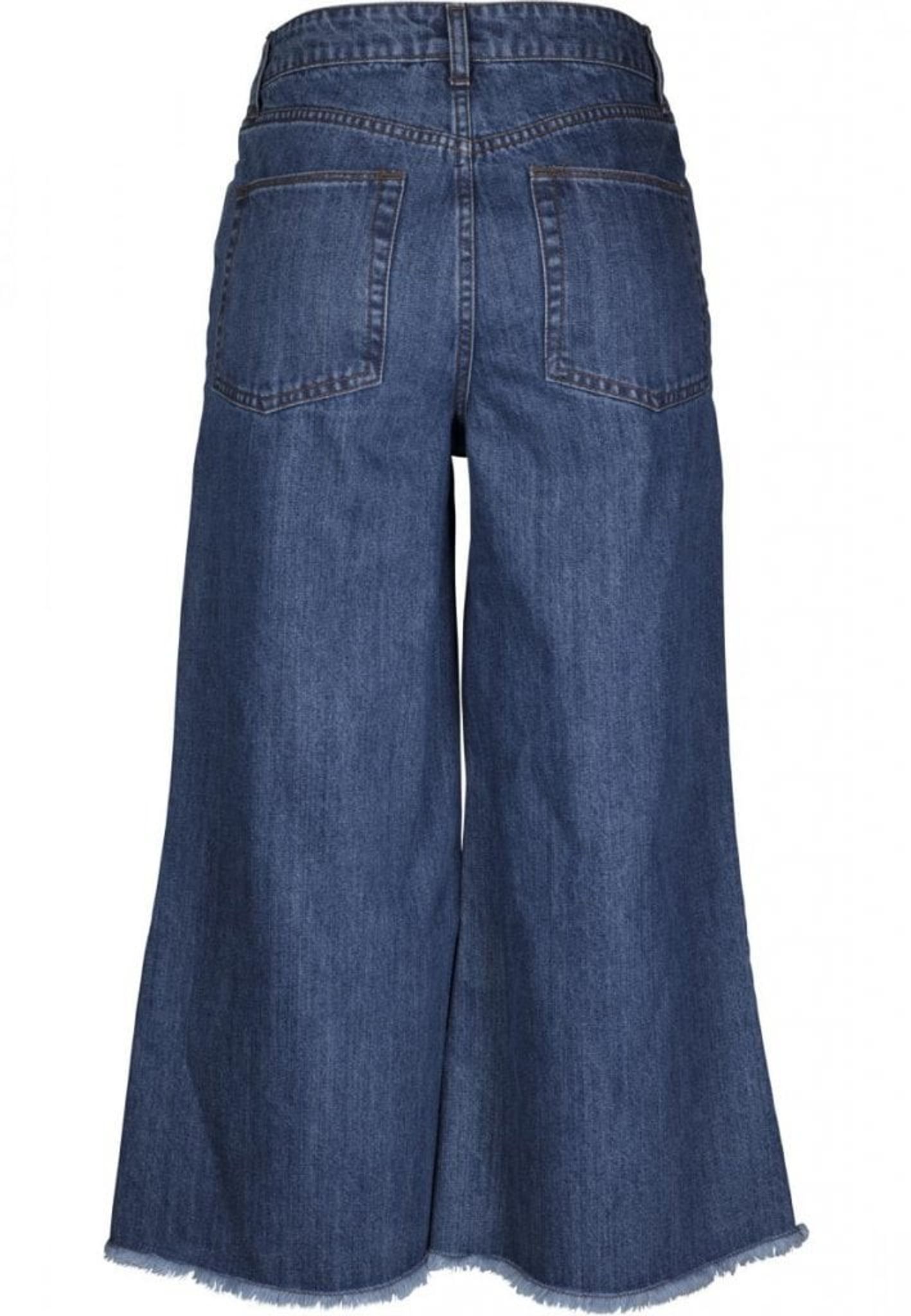 Three-legged pants in demin. A classic jeans model with high waist. The pants have a zipper, two side pockets and two back pockets. The pants are fringed and in Culott style.