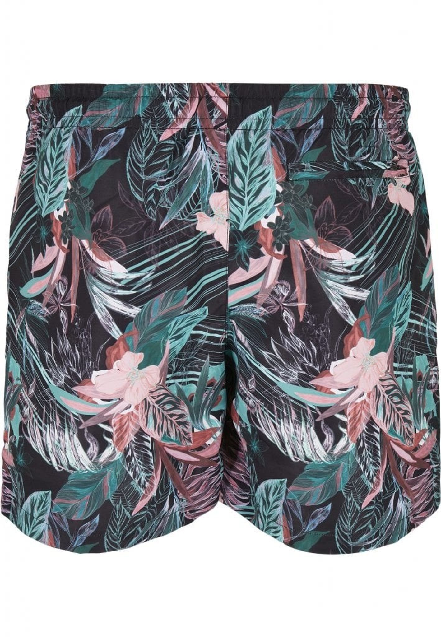 A pair of summery but dark swimming shorts where a black background is decorated with leaves and flowers.