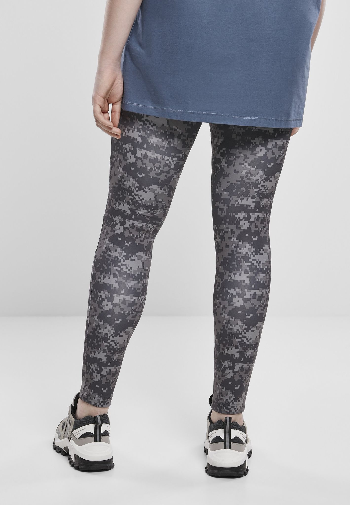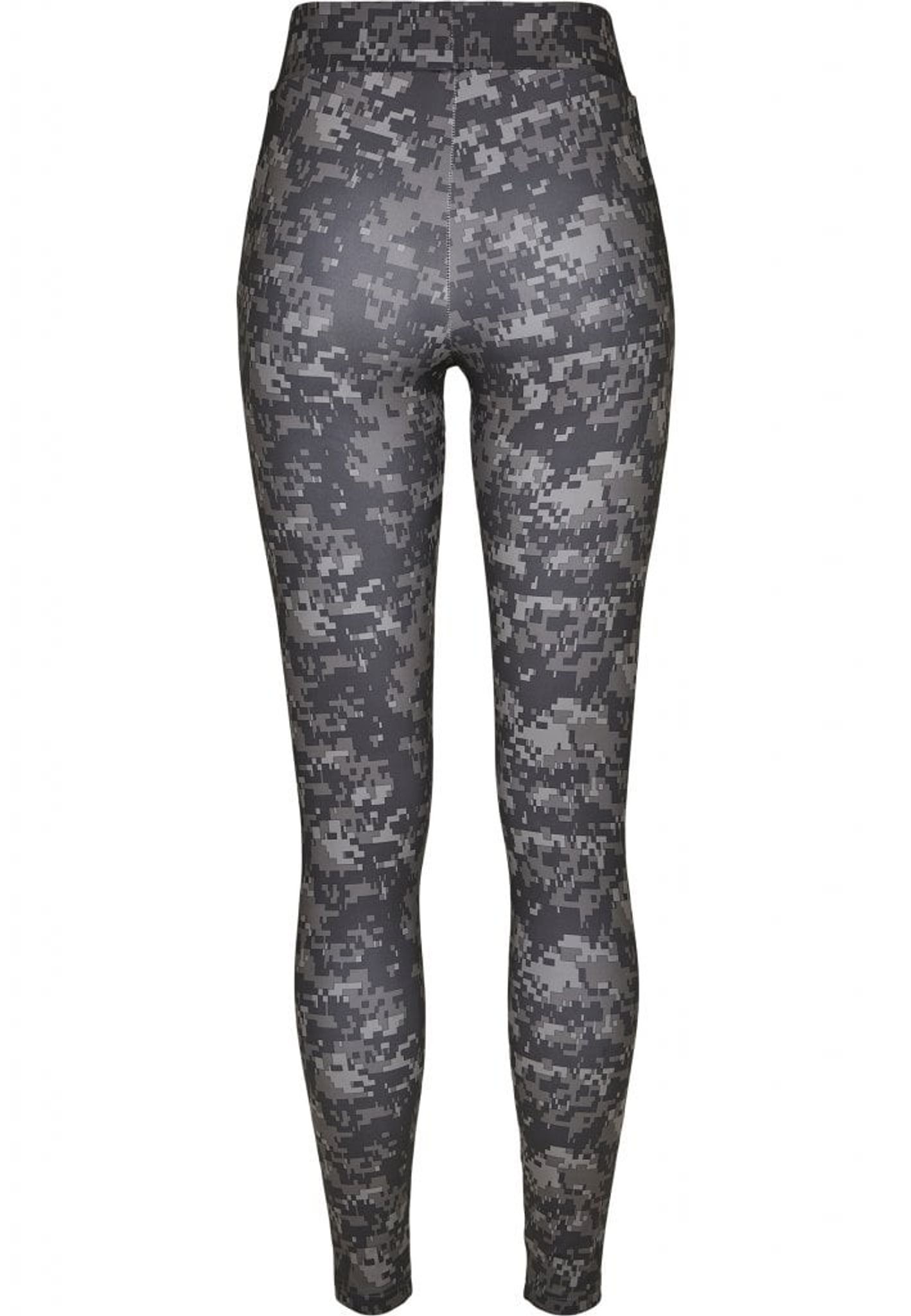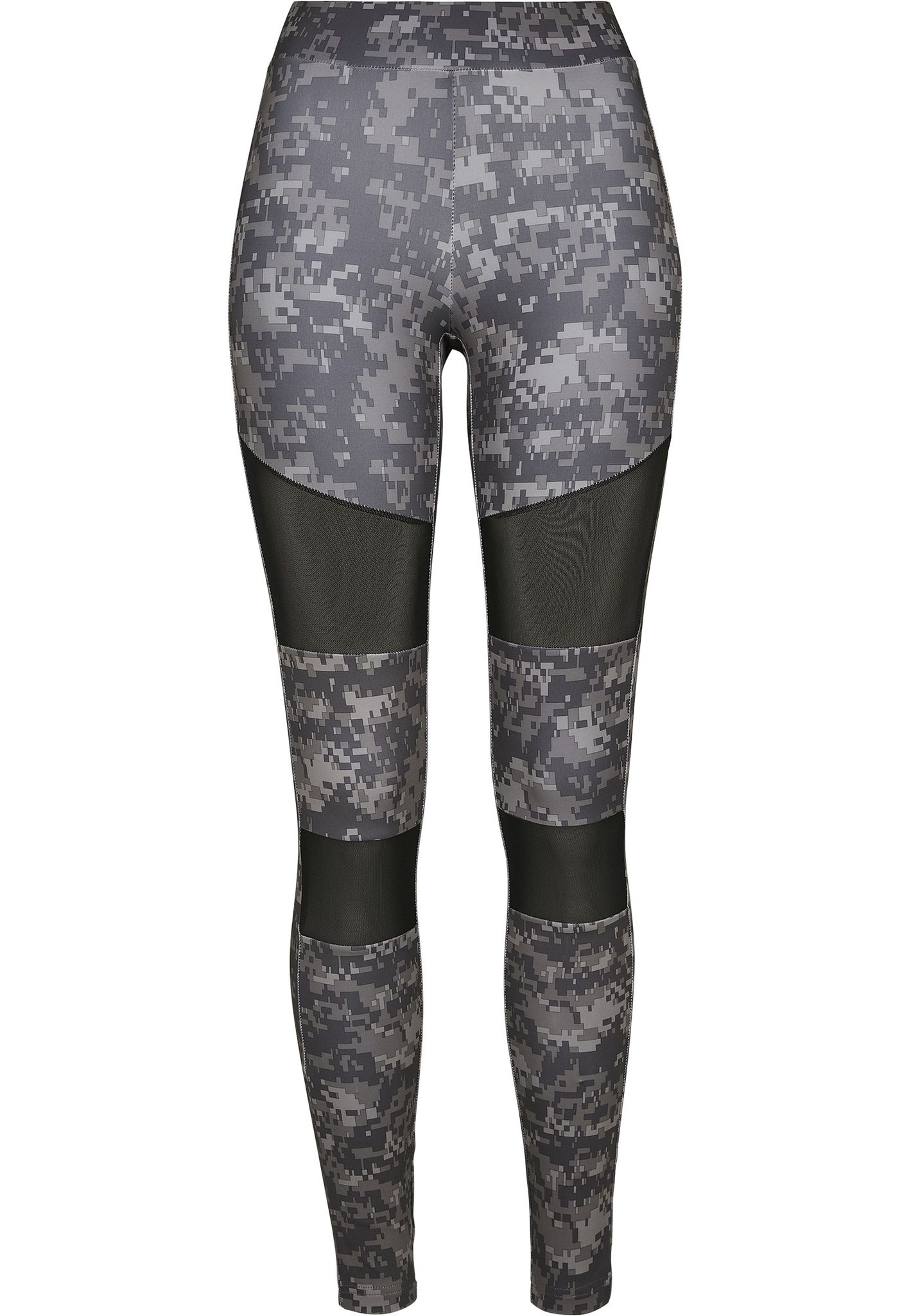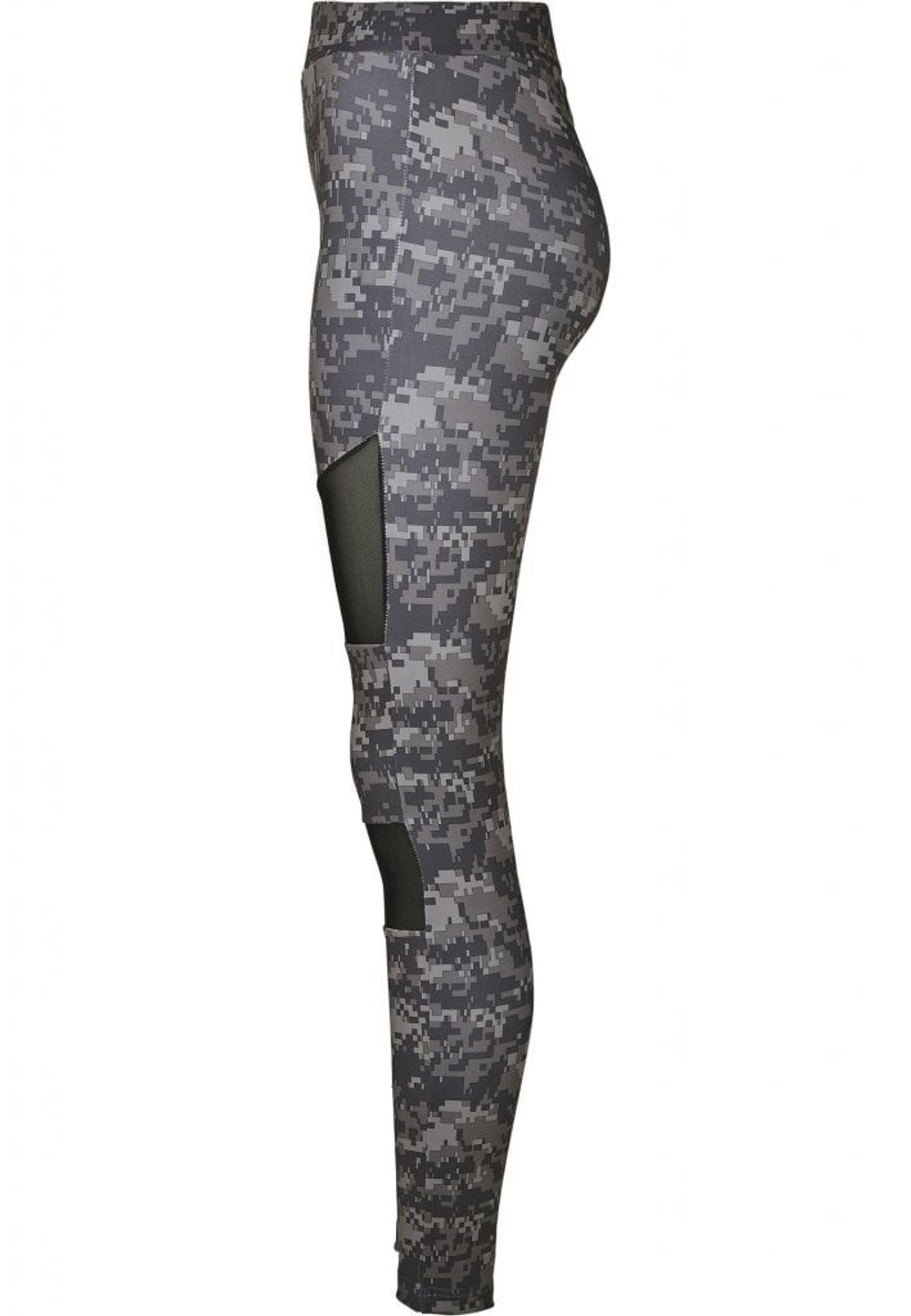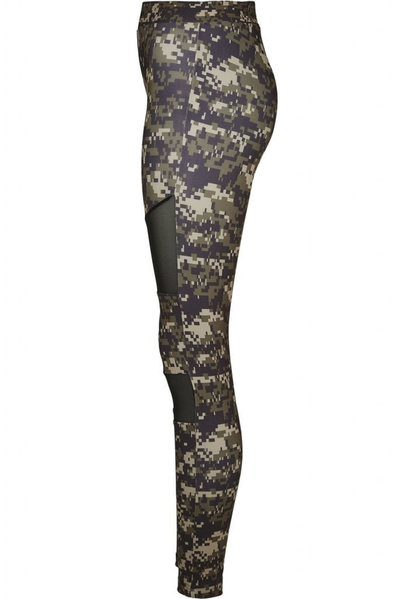 A pair of delicious leggings in digital camo with mesh fabric in two panels on each leg.