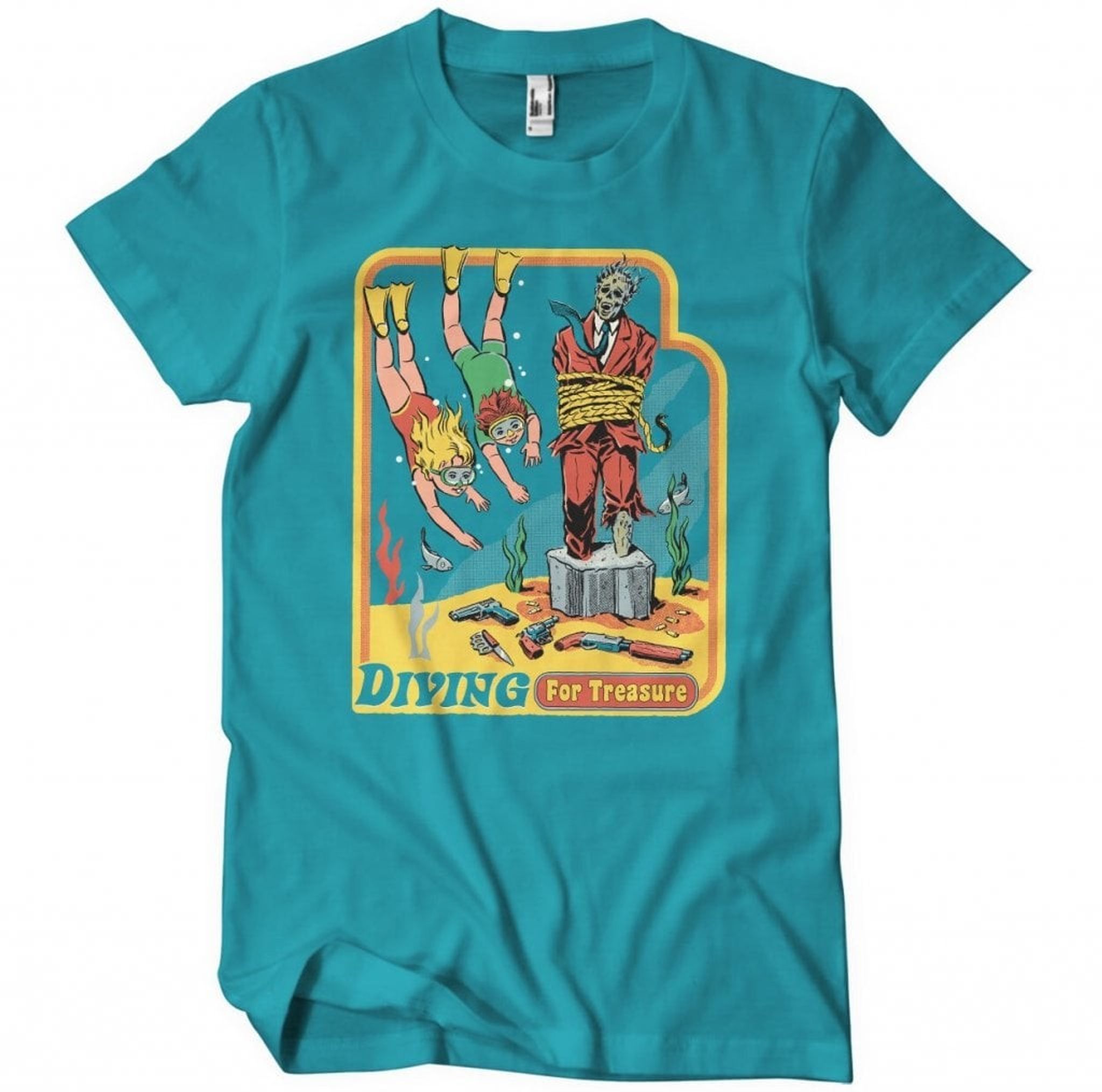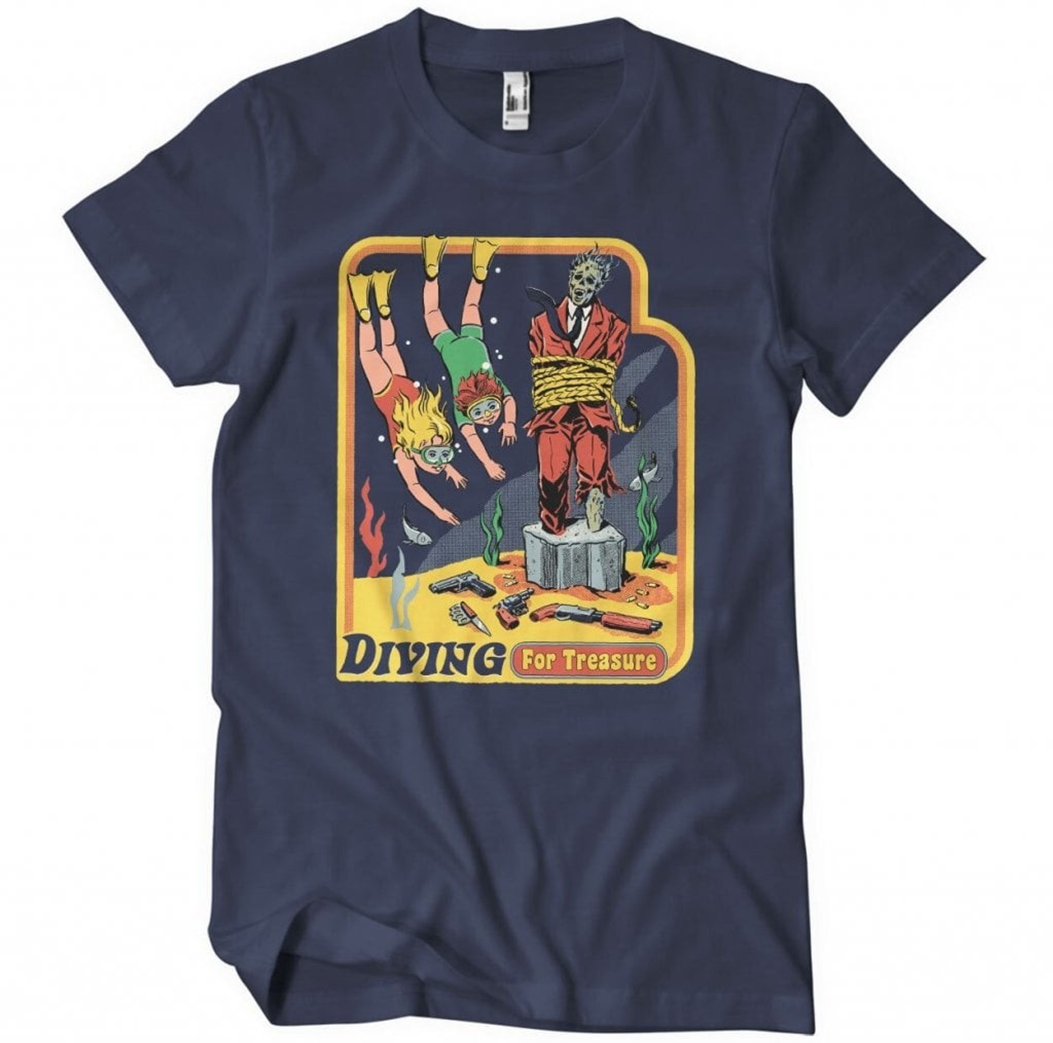 This T-shirt has a retro style and a typical dark humorous motif from Steven Rhodes, which takes you back to your childhood adventures but with a twist. The design, titled "Diving for Treasure", shows two children in diving gear diving towards the bottom of the sea, where a zombie-like figure awaits, tied to a concrete block surrounded by treasures such as coins and jewels. It's like an adventure from one's worst nightmares, but with a humorous touch that can't fail to put a smile on your face.