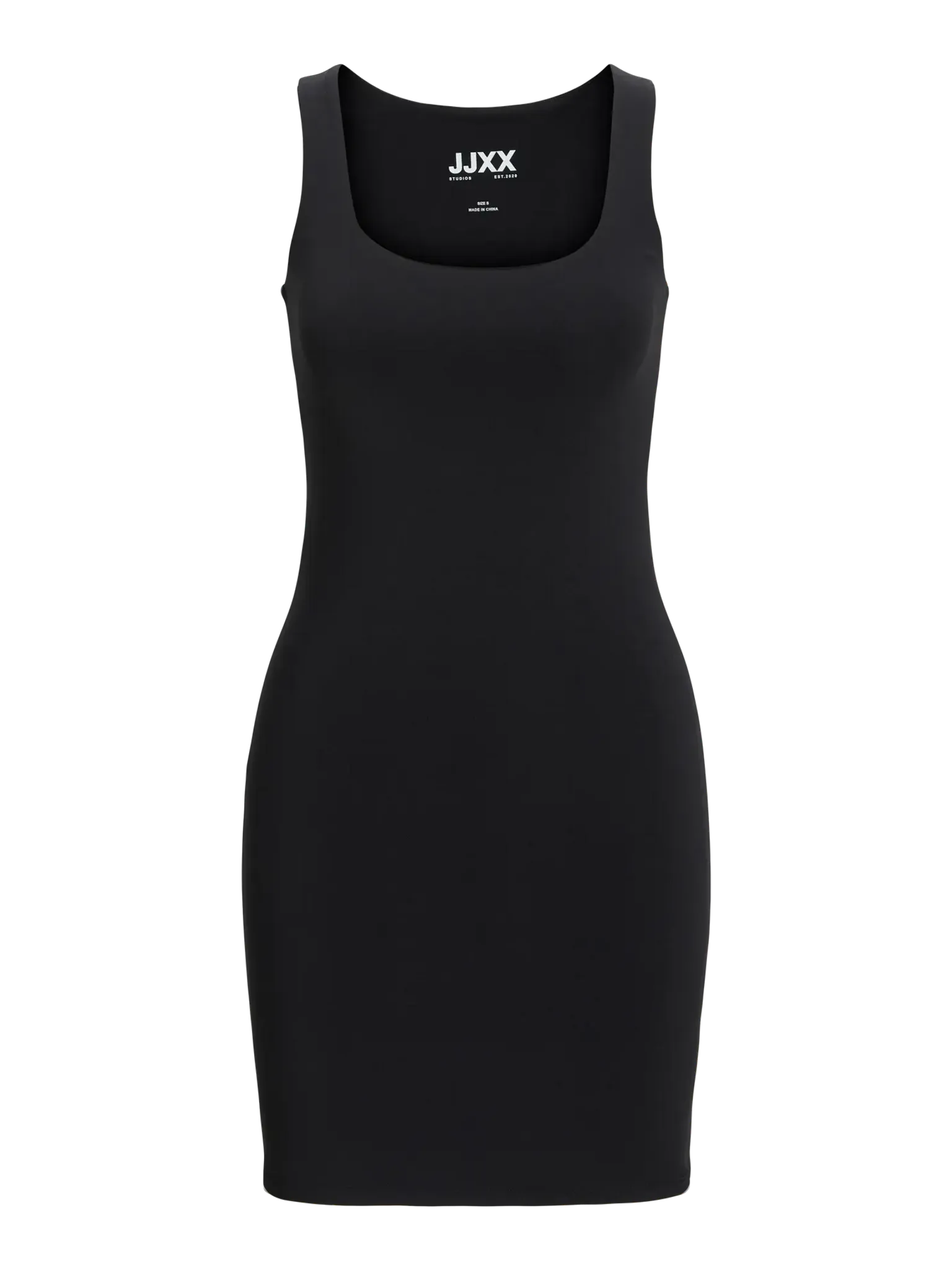 Klänningen har en fyrkantig halsringning och är ärmlös, vilket ger en modern och minimalistisk känsla. Den korta längden gör att den passar perfekt för festliga sammanhang.