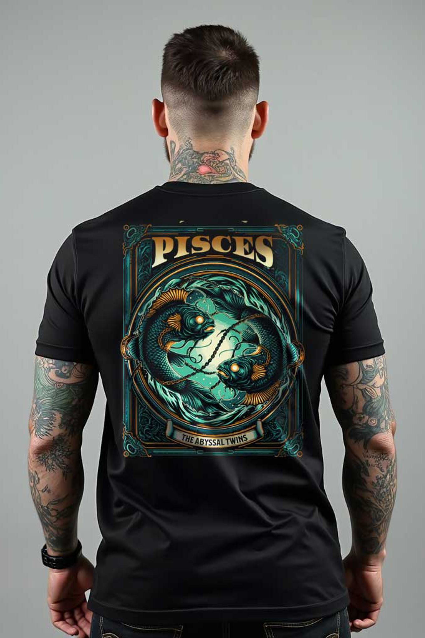 Denna snygga T-shirt är ett måste för alla som är födda i stjärntecknet Fiskarna. Med ordet "Pisces" stilfullt tryckt på bröstet och ett detaljerat motiv på ryggen som föreställer två abyssala fiskar i ett harmoniskt flöde, speglar plagget precis den djupkänslighet och kreativitet som kännetecknar Fisken.