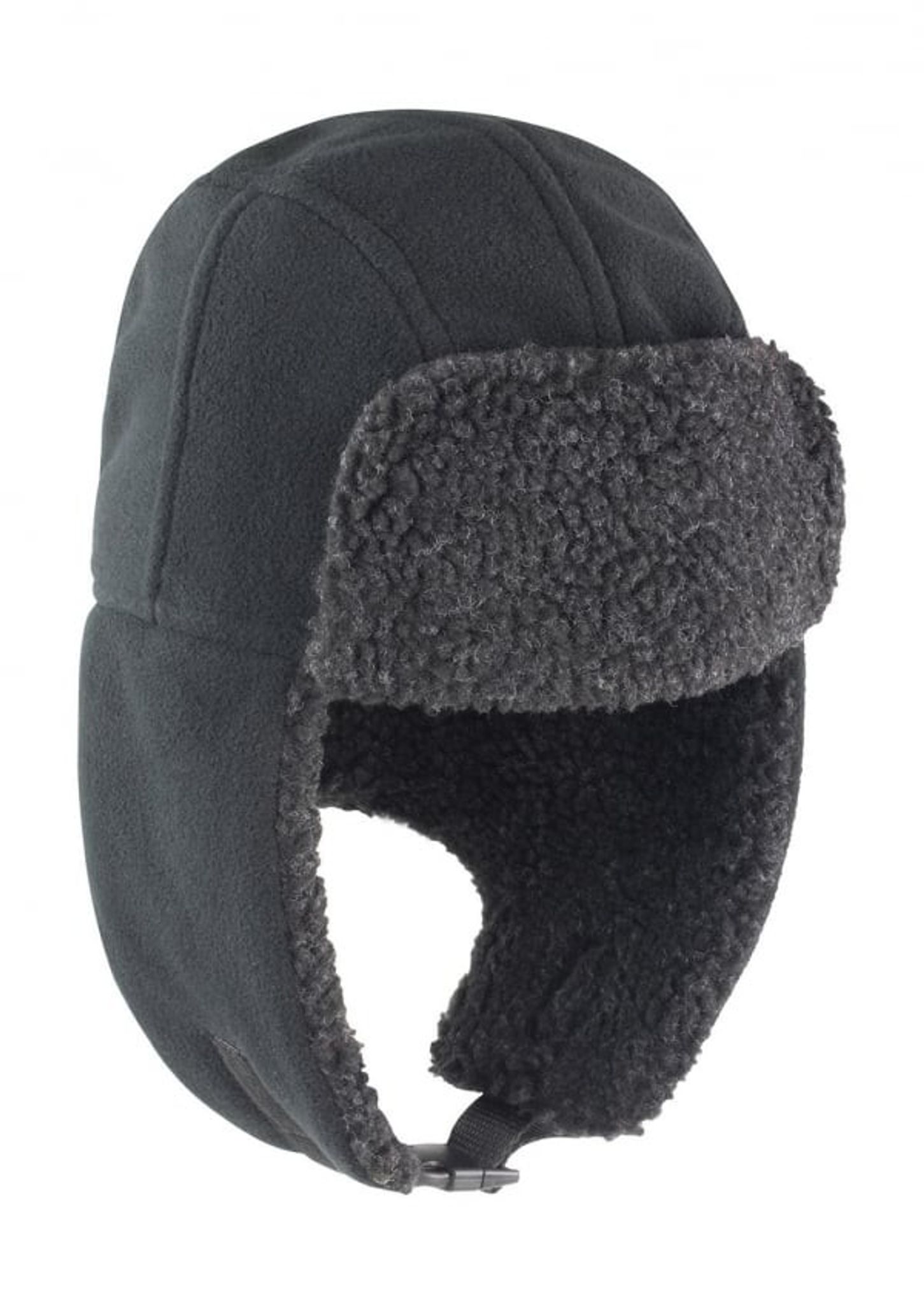 The hat has flexible ear flaps that can be clipped under the chin to keep it in place. The ear flaps can also be folded up and snapped over the head.