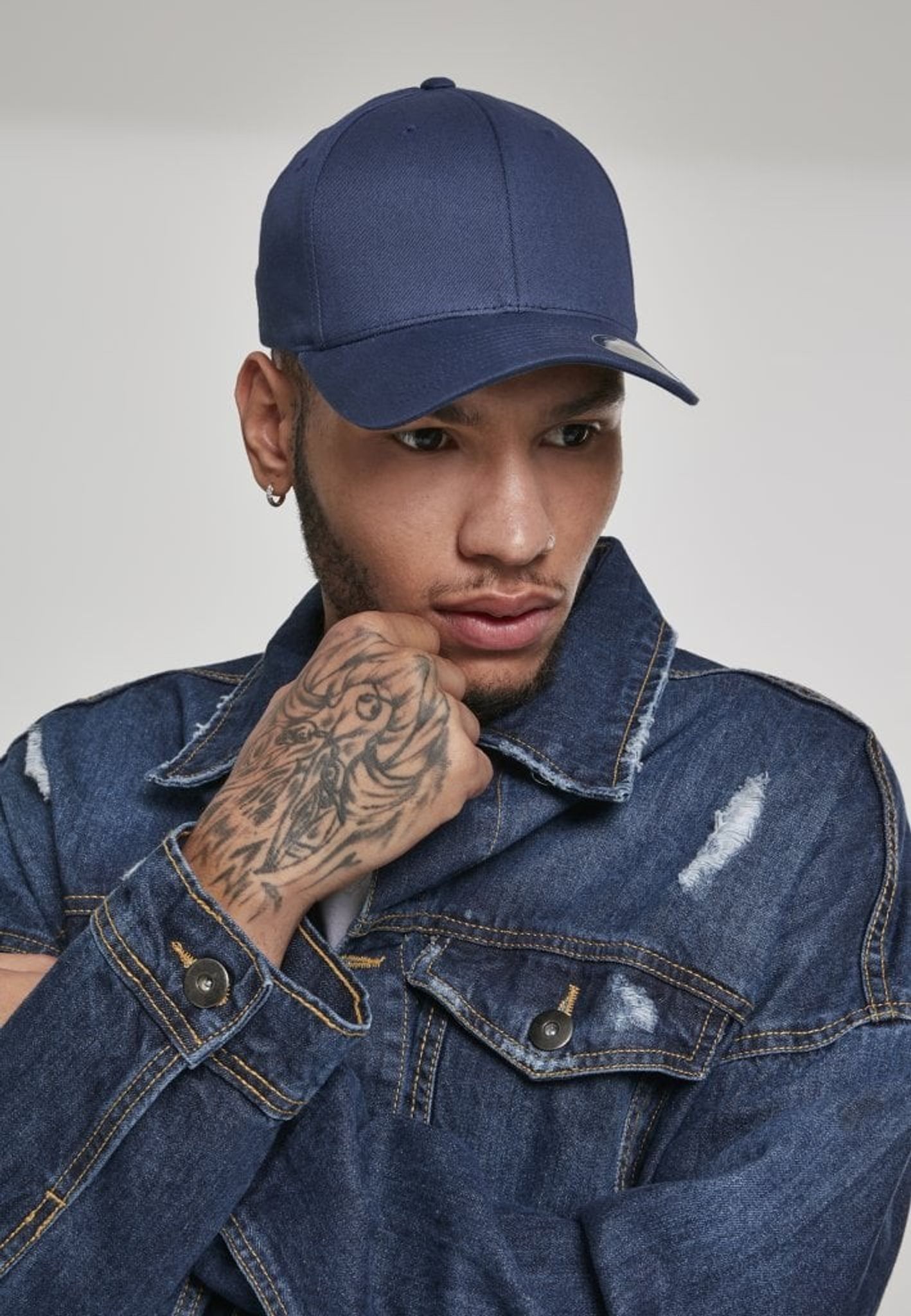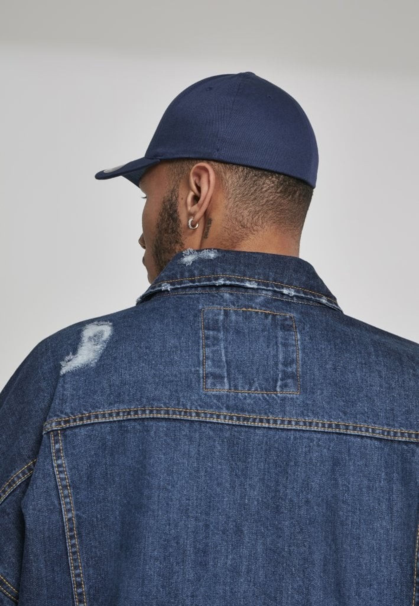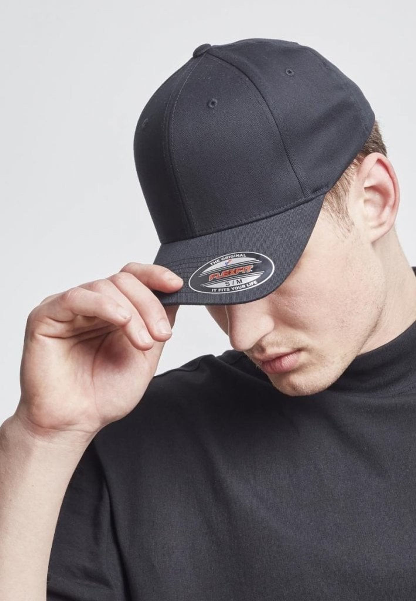 A five-panel cap in the flexfit model. Flexfit means that the cap has a rubber pad that gives a comfortable fit.