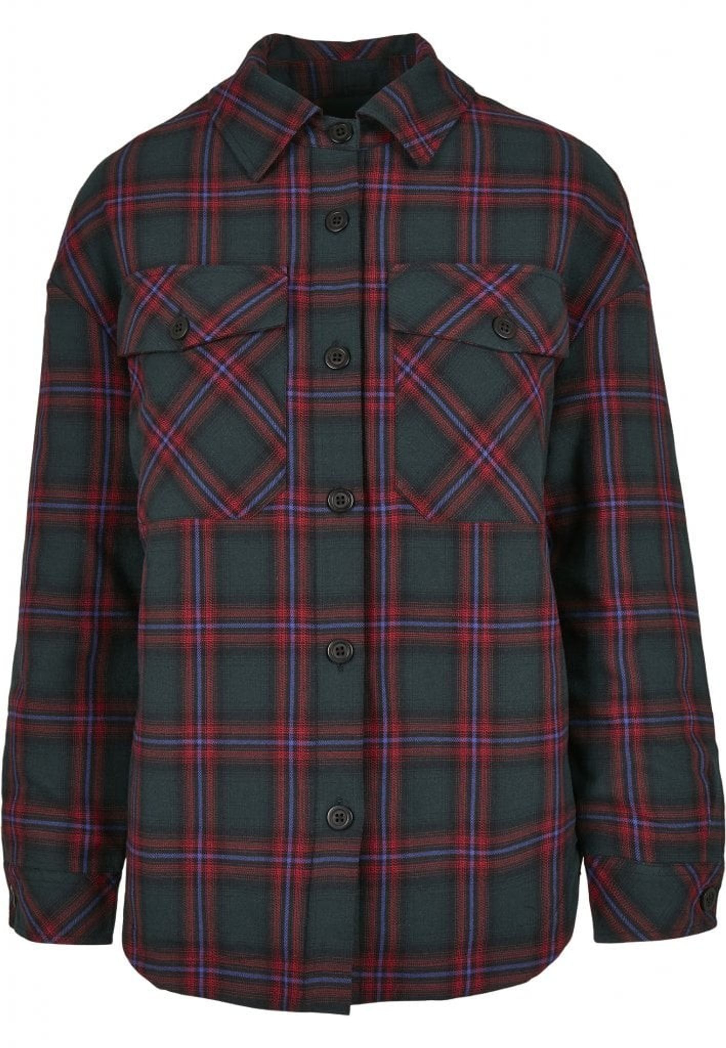 The shirt is buttoned forward with buttons and has two large pockets on the chest with a button.