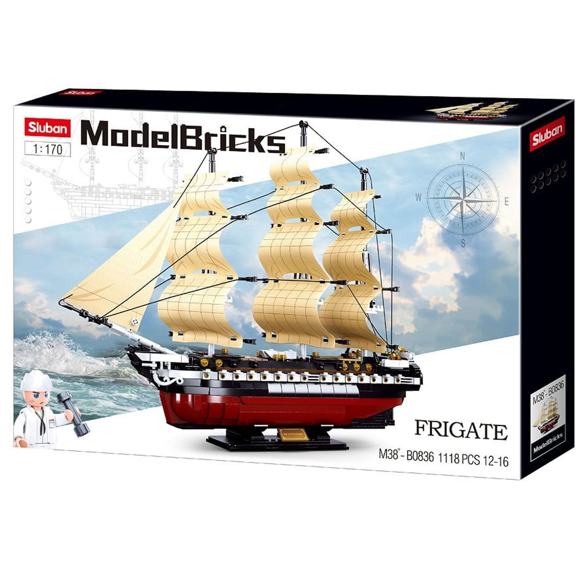 The product is a detailed building kit representing a frigate, designed for both children and adults with an interest in building blocks. It is part of Sluban's Model Bricks range and contains a total of 1118 pieces, making it a challenging and exciting project for the 12 to 16 age group.