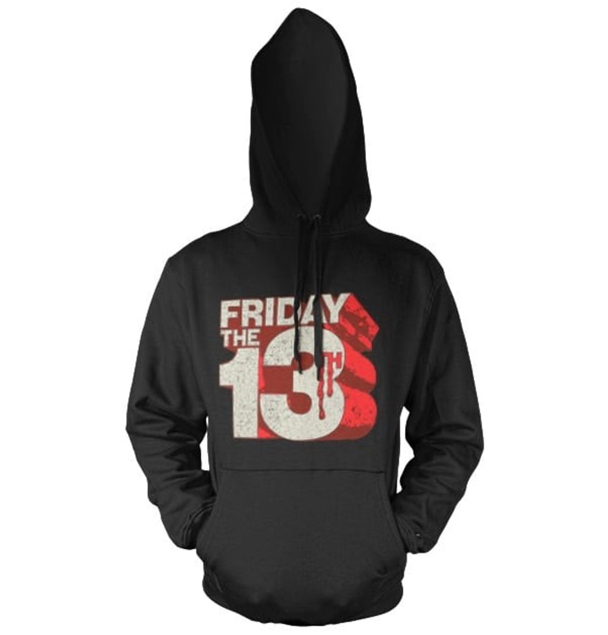 A nice hoodie with a donut pocket and a large motif on Friday the 13th logo in 3D blocks.