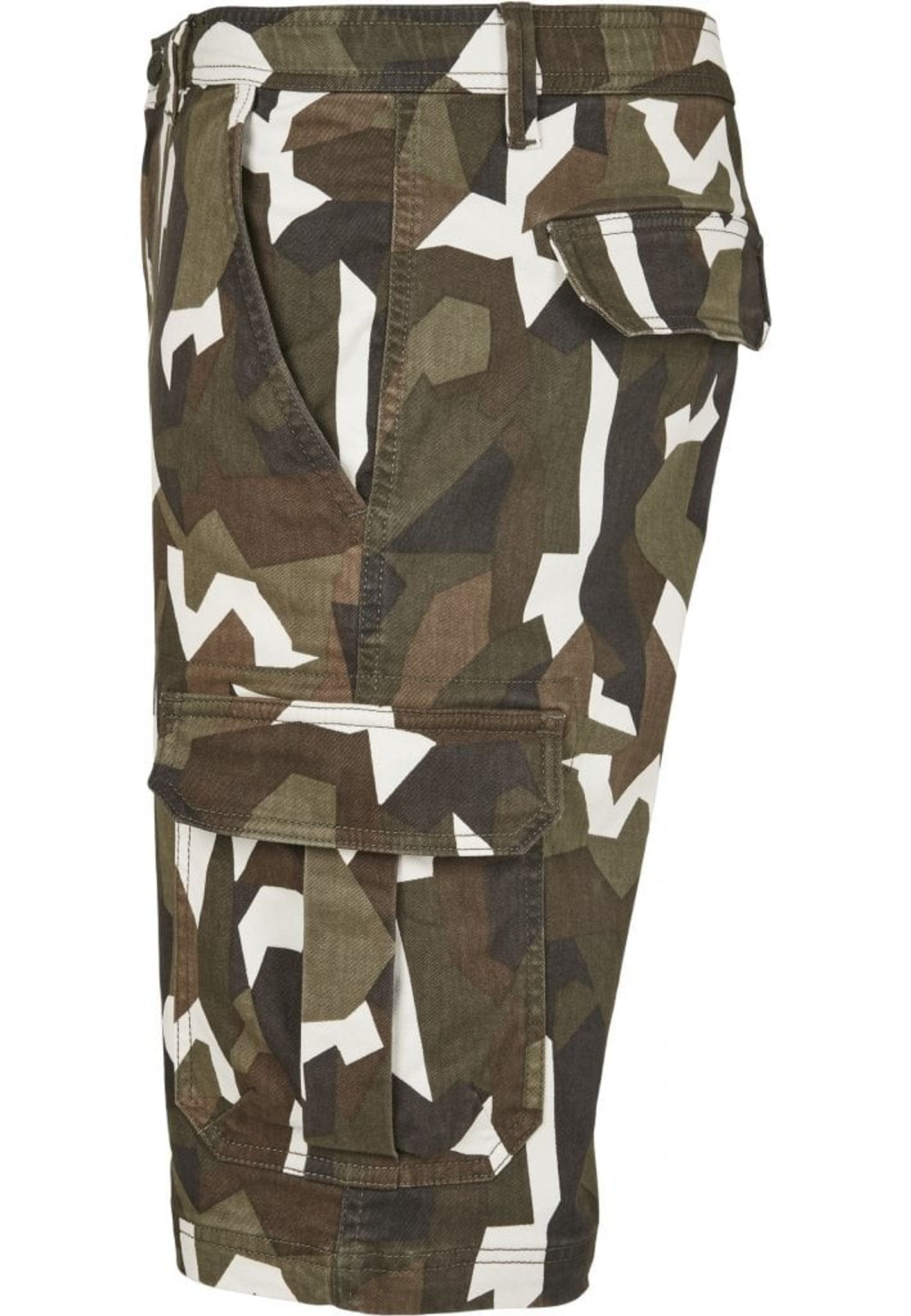 A pair of comfortable cargo shorts with stretch fabric. The shorts have a geometric camouflage pattern.