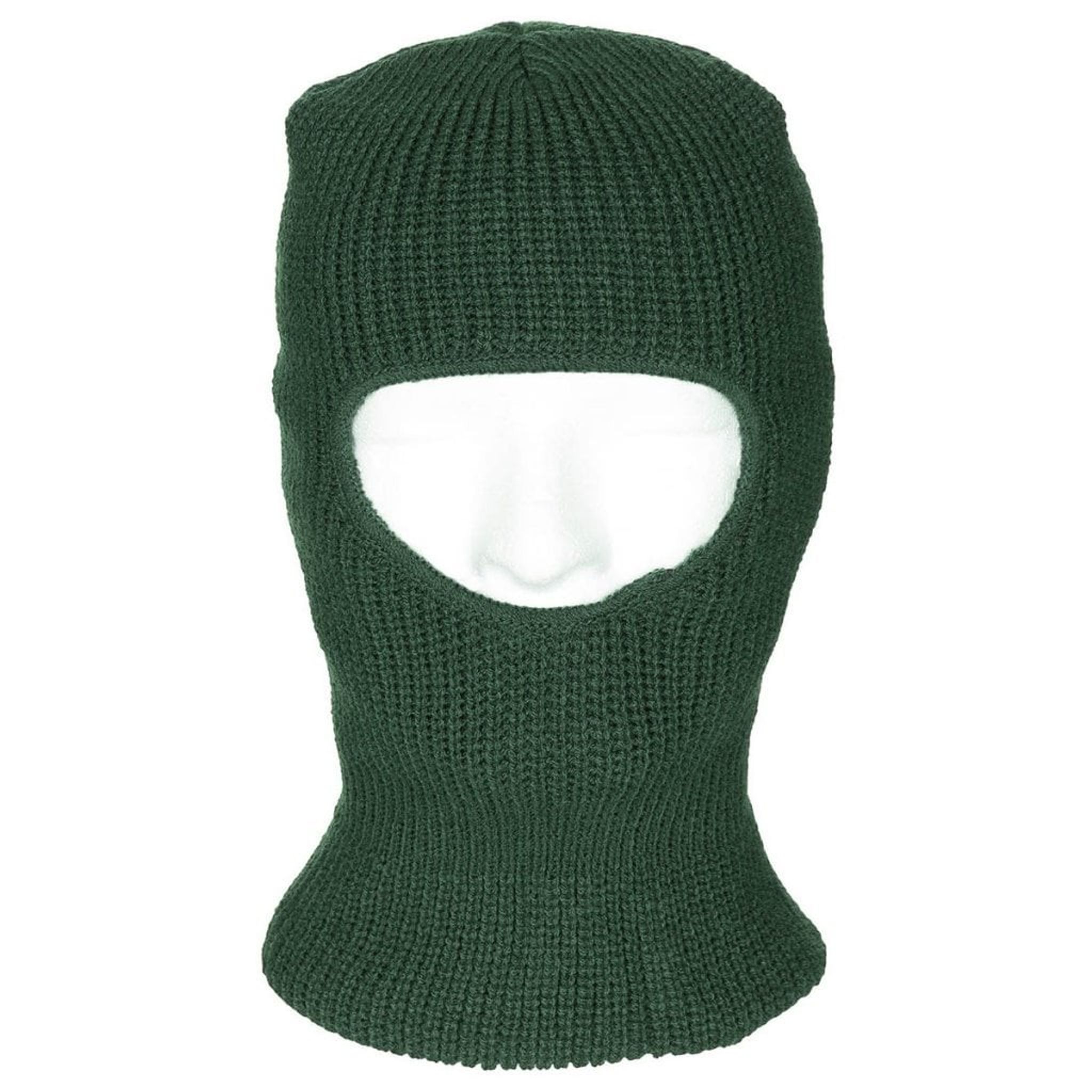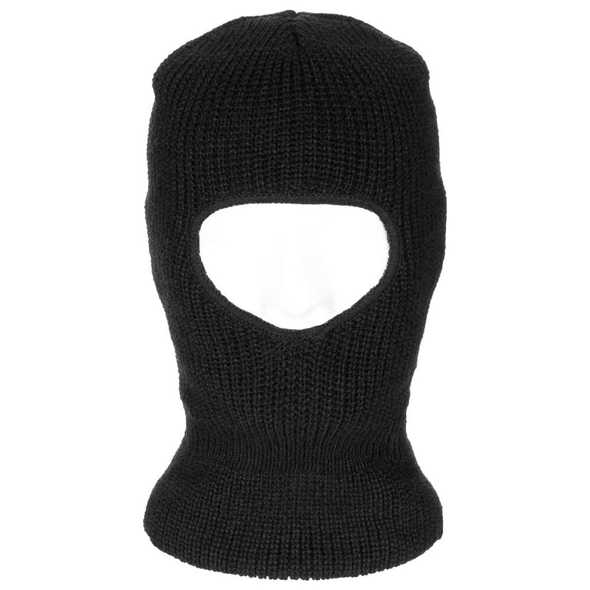 A balaclava with a large hole and double layers of coarse knitted acrylic yarn.