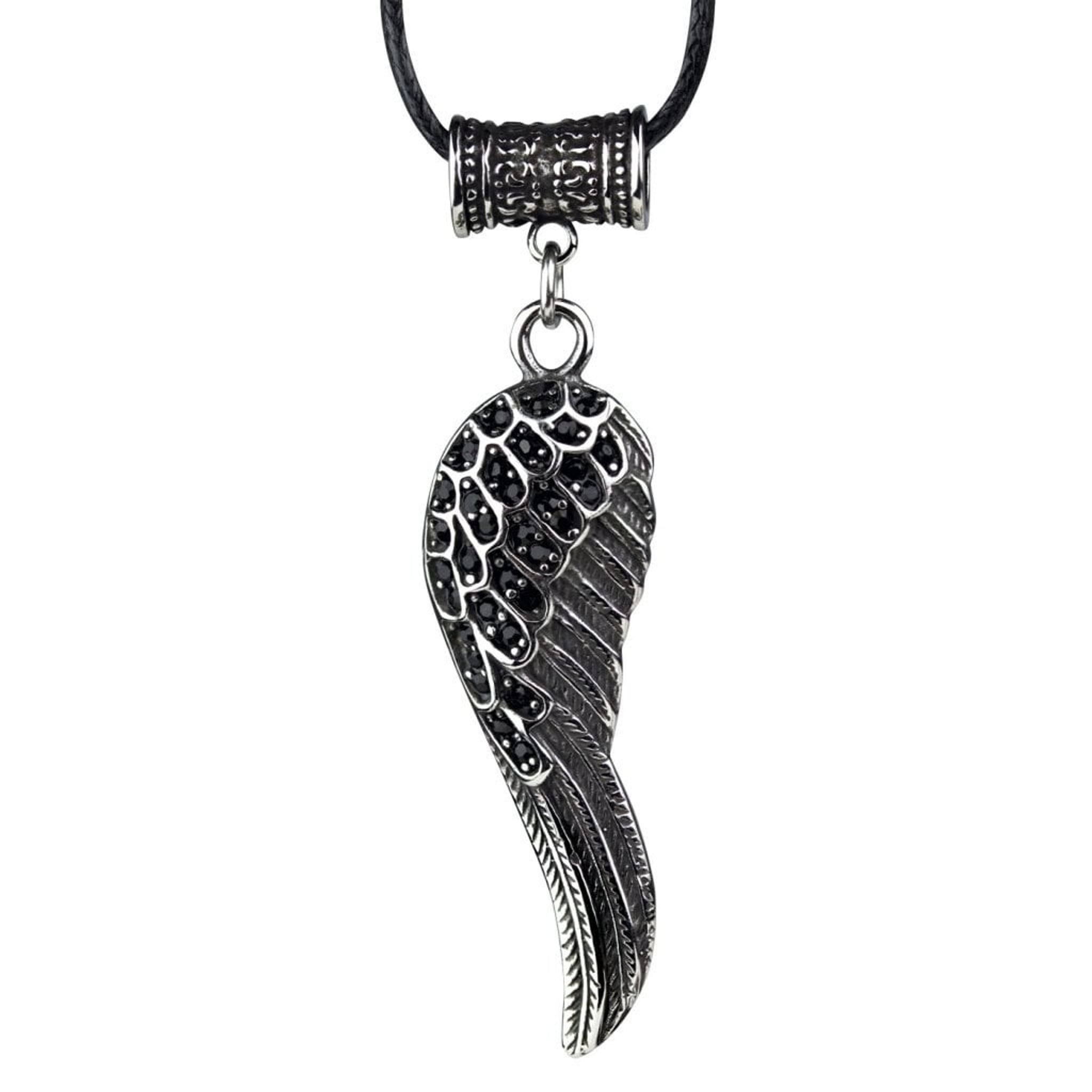 A pendant on a black leather strap. It is a small pearl that hangs in the leather strap and in it hangs a wing.