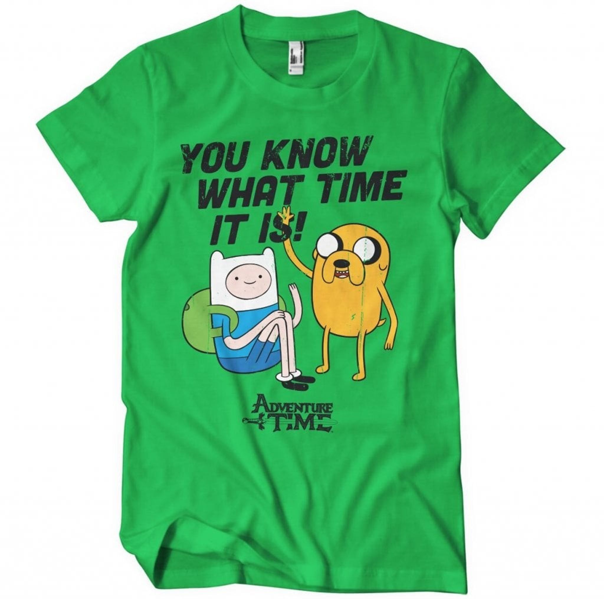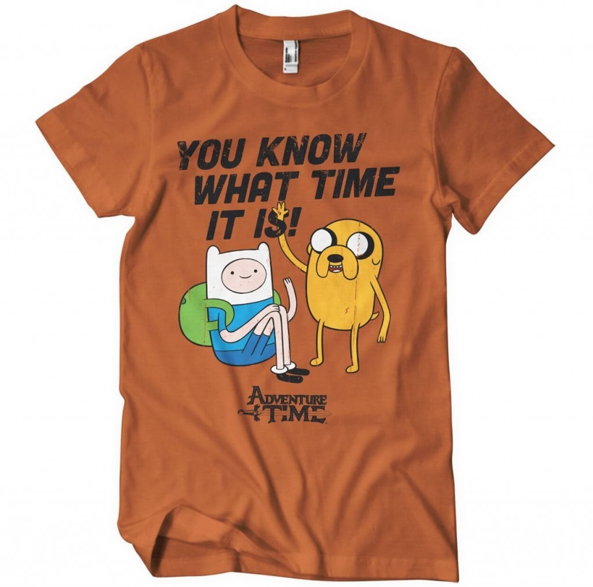 This Adventure Time T-shirt serves a large portion of nostalgia with a side of humor. The motif shows two figures that seem to be taken directly from a child's drawing block. One figure is a good -natured dog -like figure with big eyes and a single, prominent tooth, while the other is an adventurous figure dressed in blue tunic and white cap. The text "You know what time it is!" Playfully proclaims what this is about. It is a picture that suggests adventure, friendship and the special time of the day when everything seems possible.