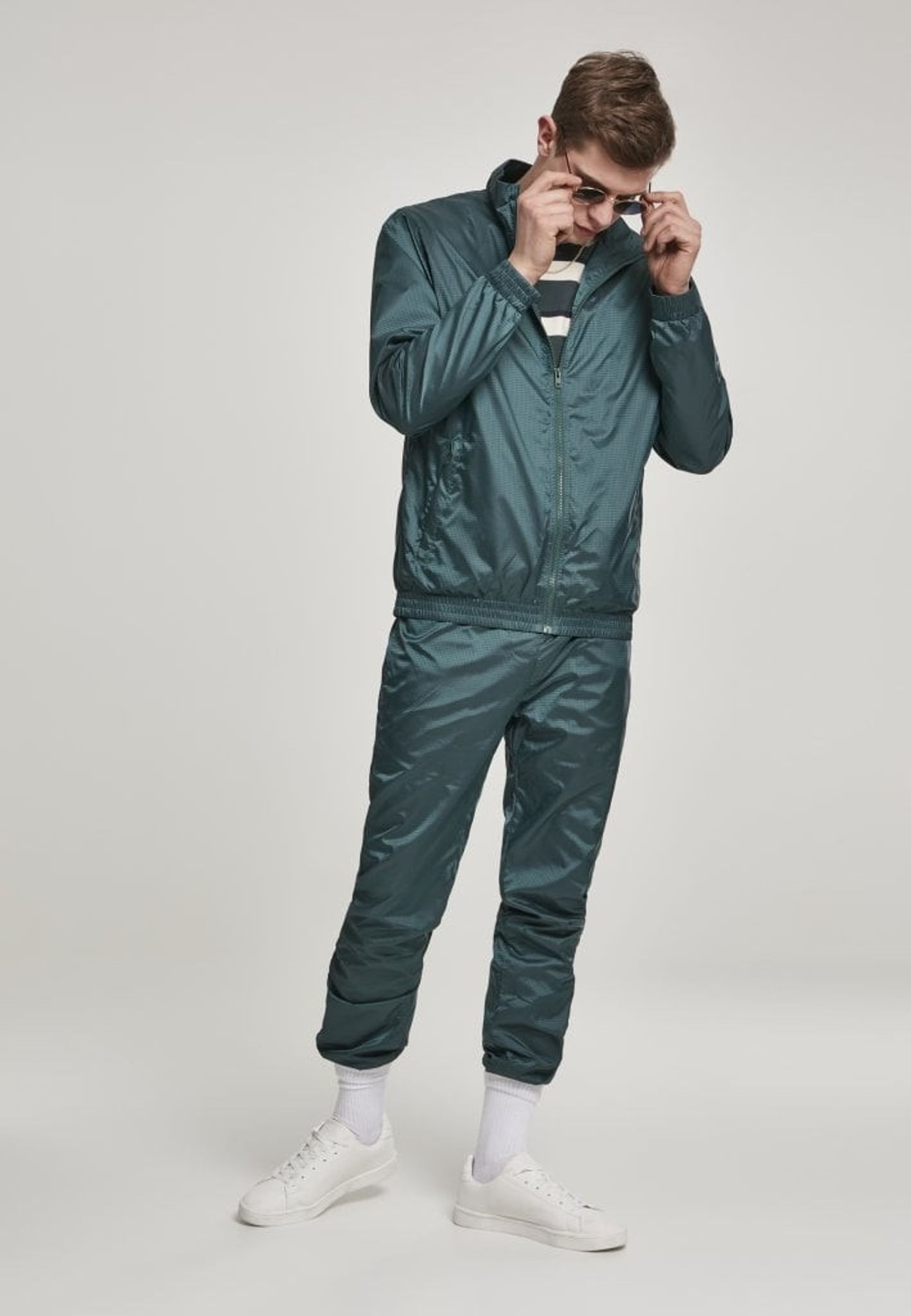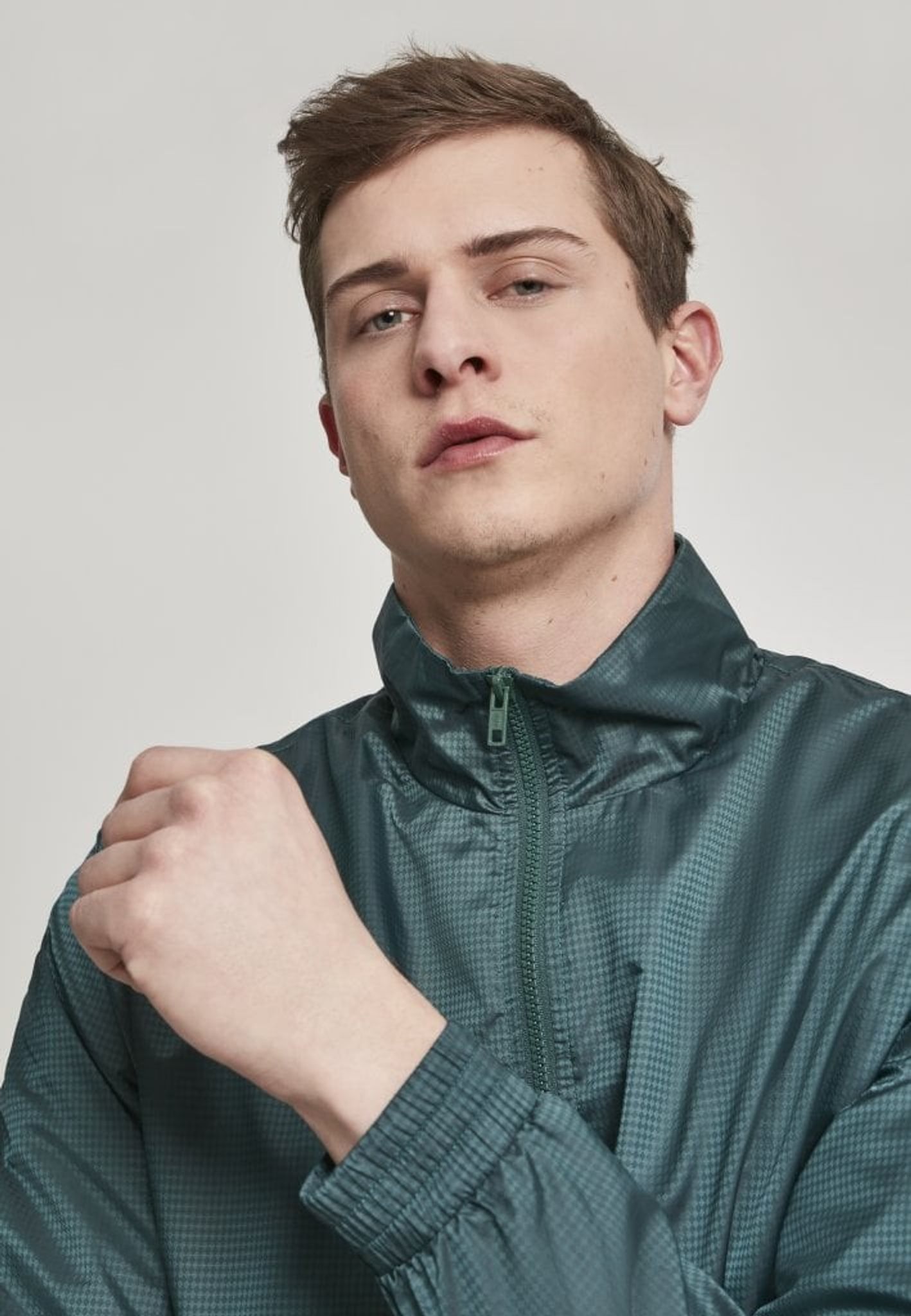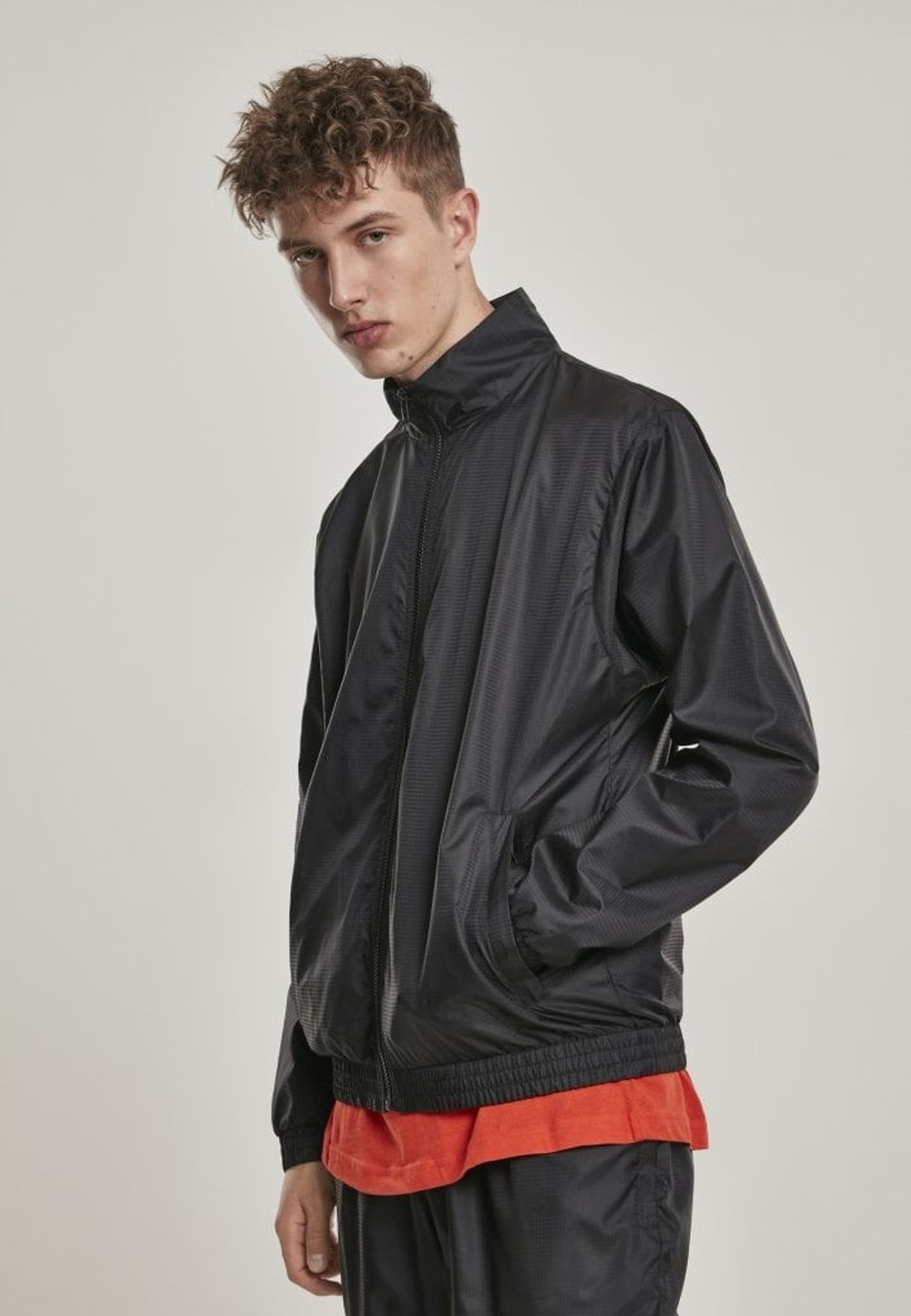 A thin tracker jacket with a pattern that makes the fabric look woven. The jacket has a glossy fabric.