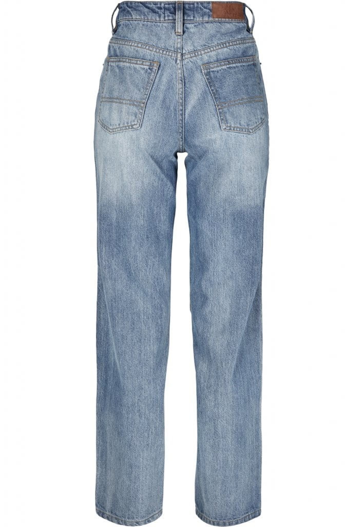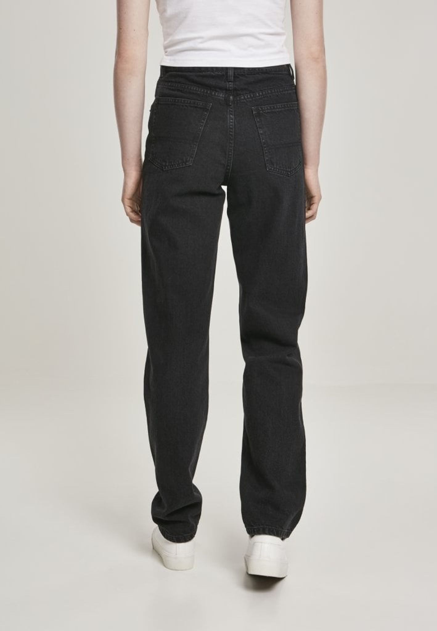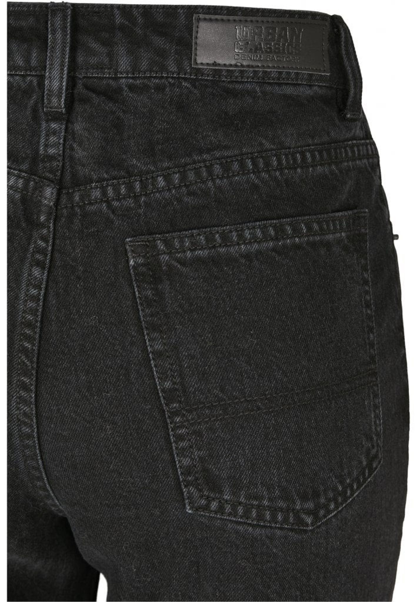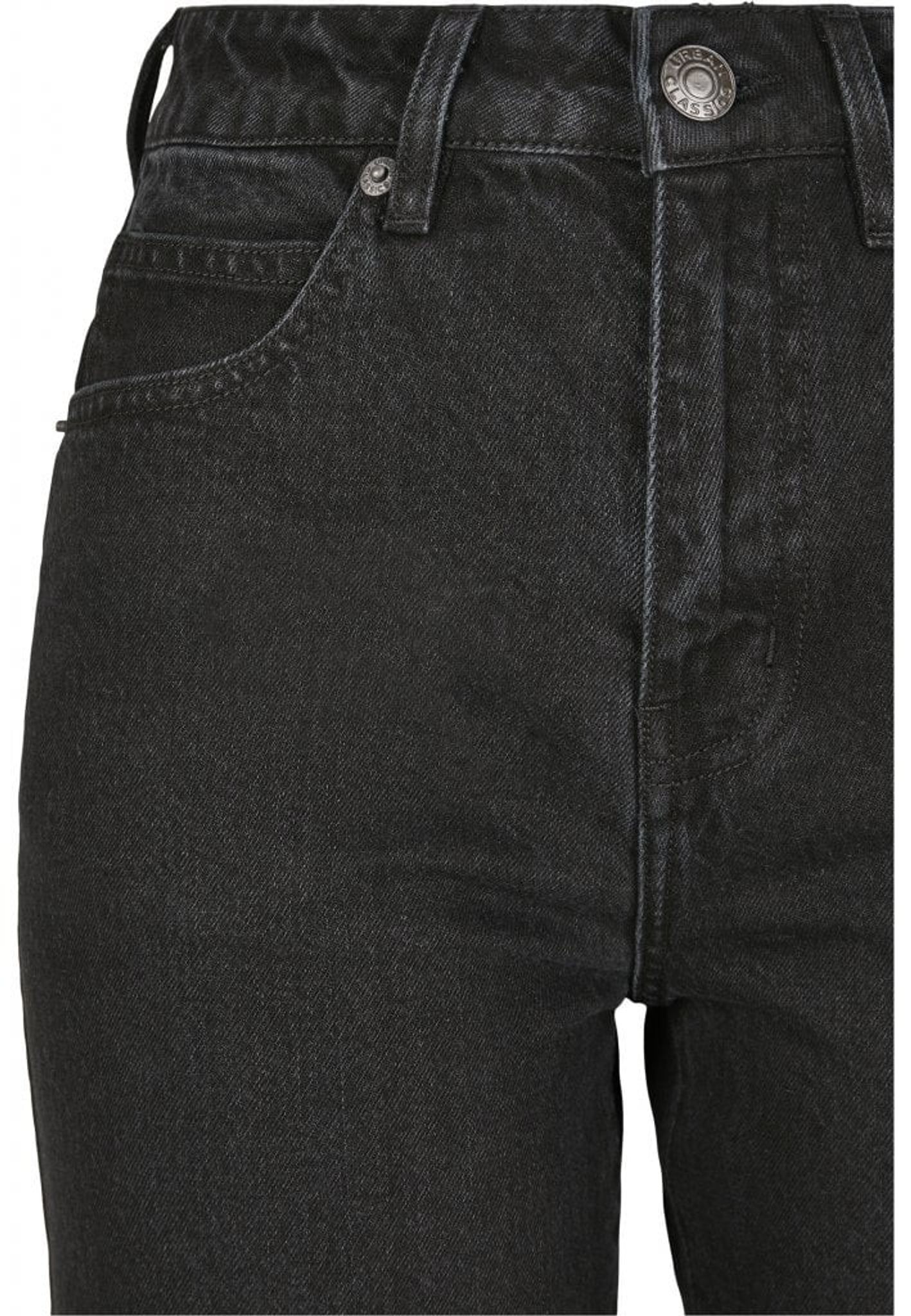 A pair of jeans with high waist and straight fit.