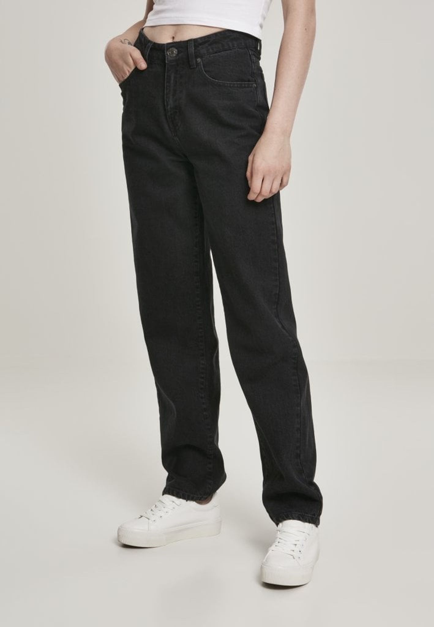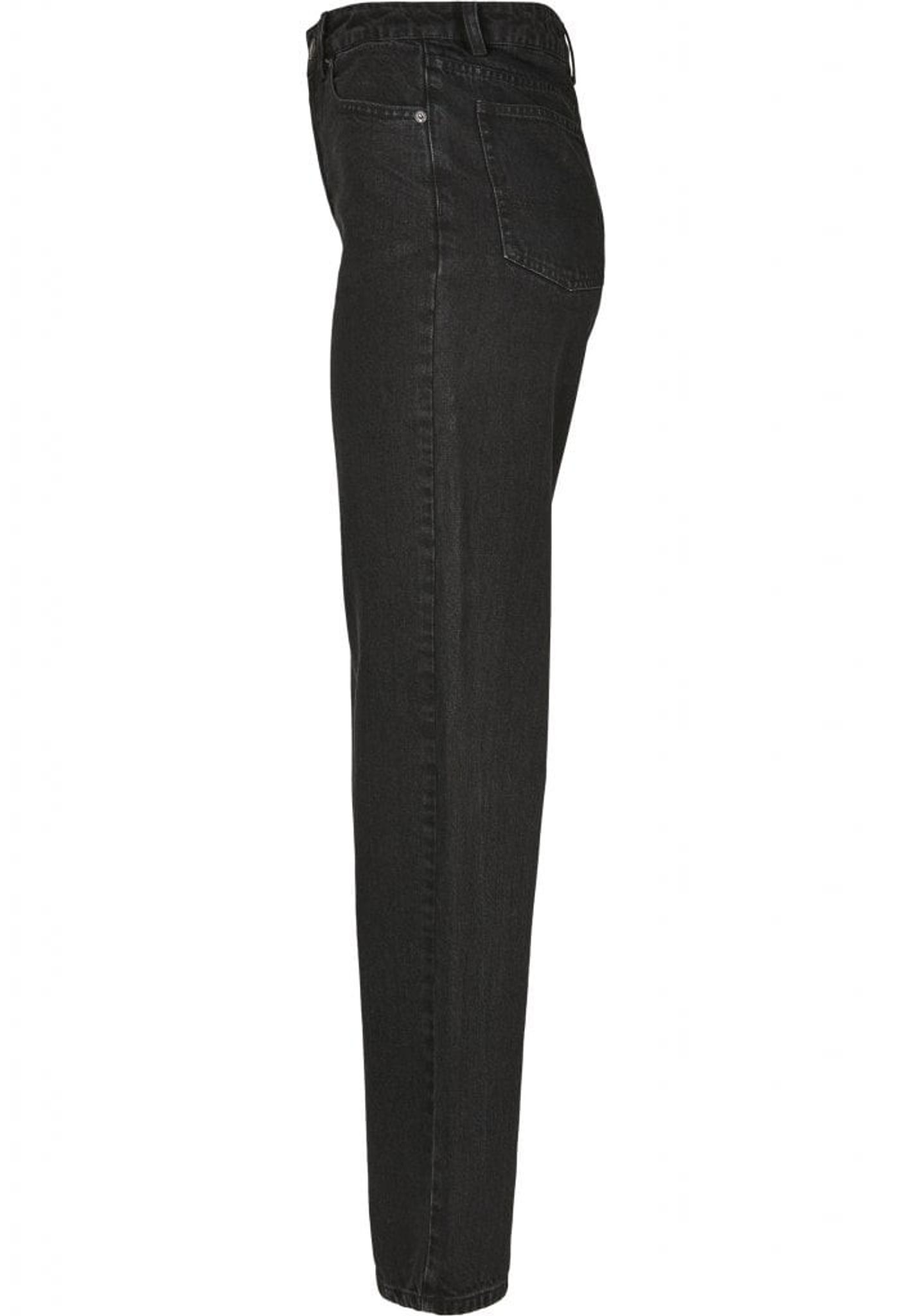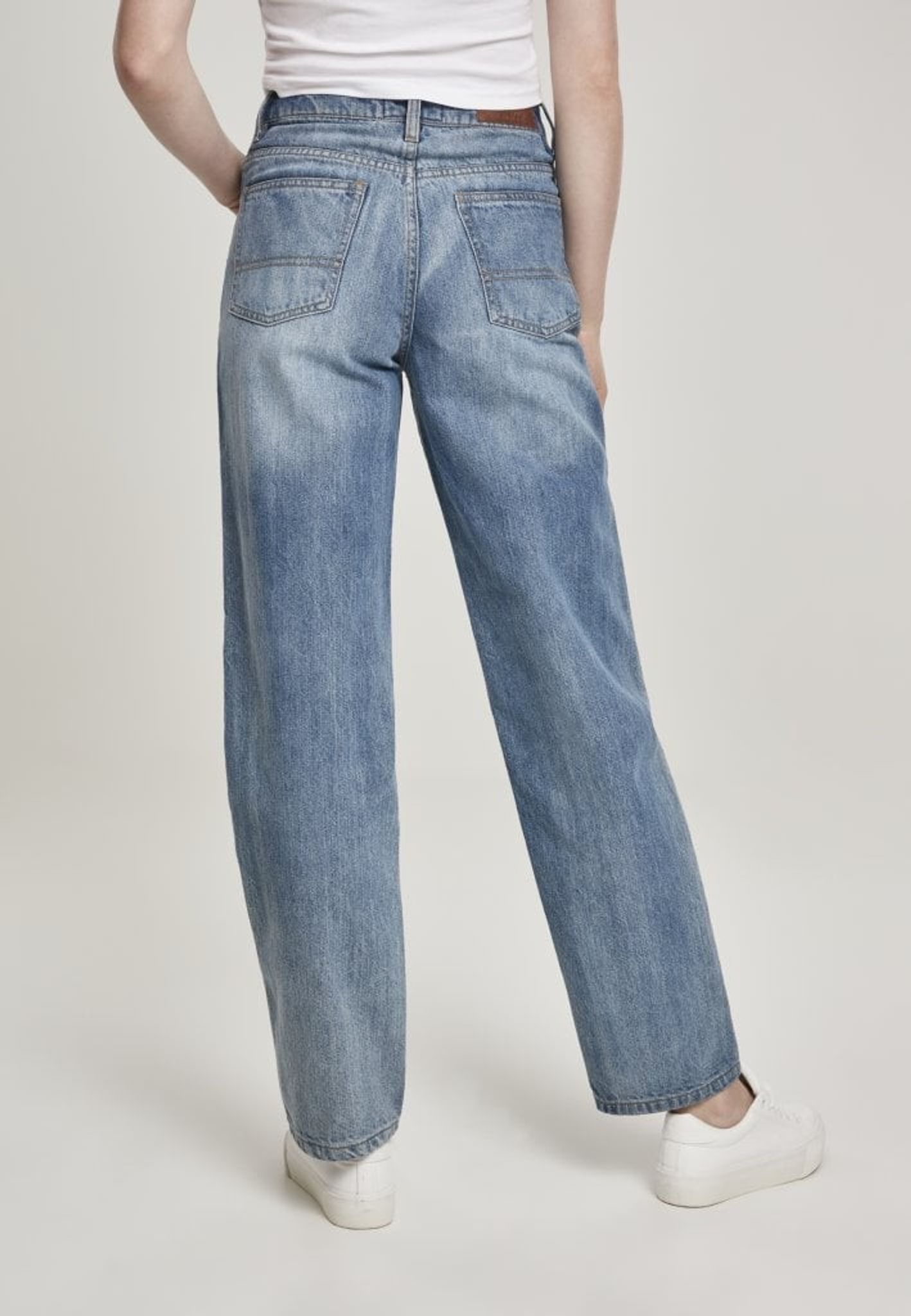 A pair of jeans with high waist and straight fit.