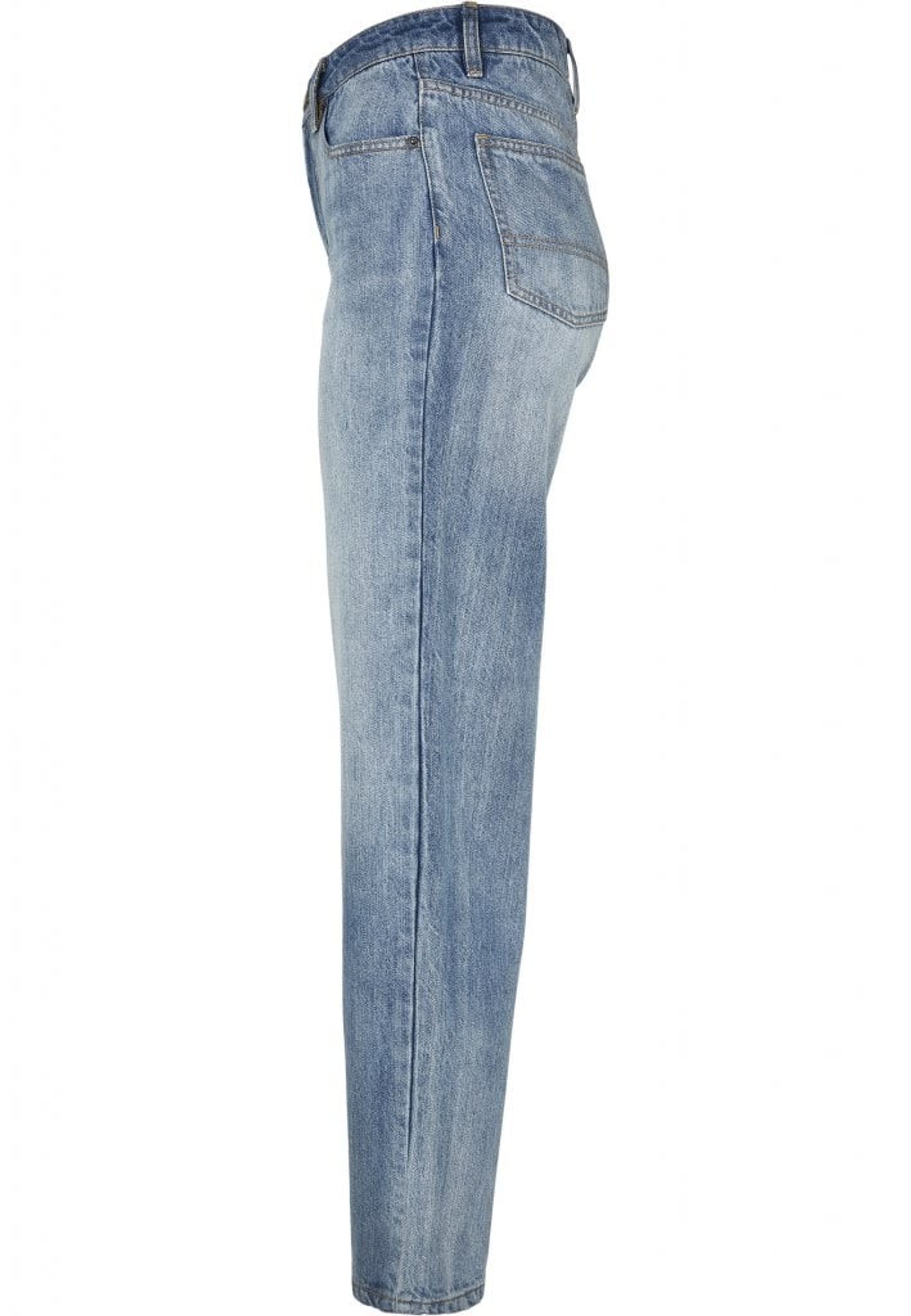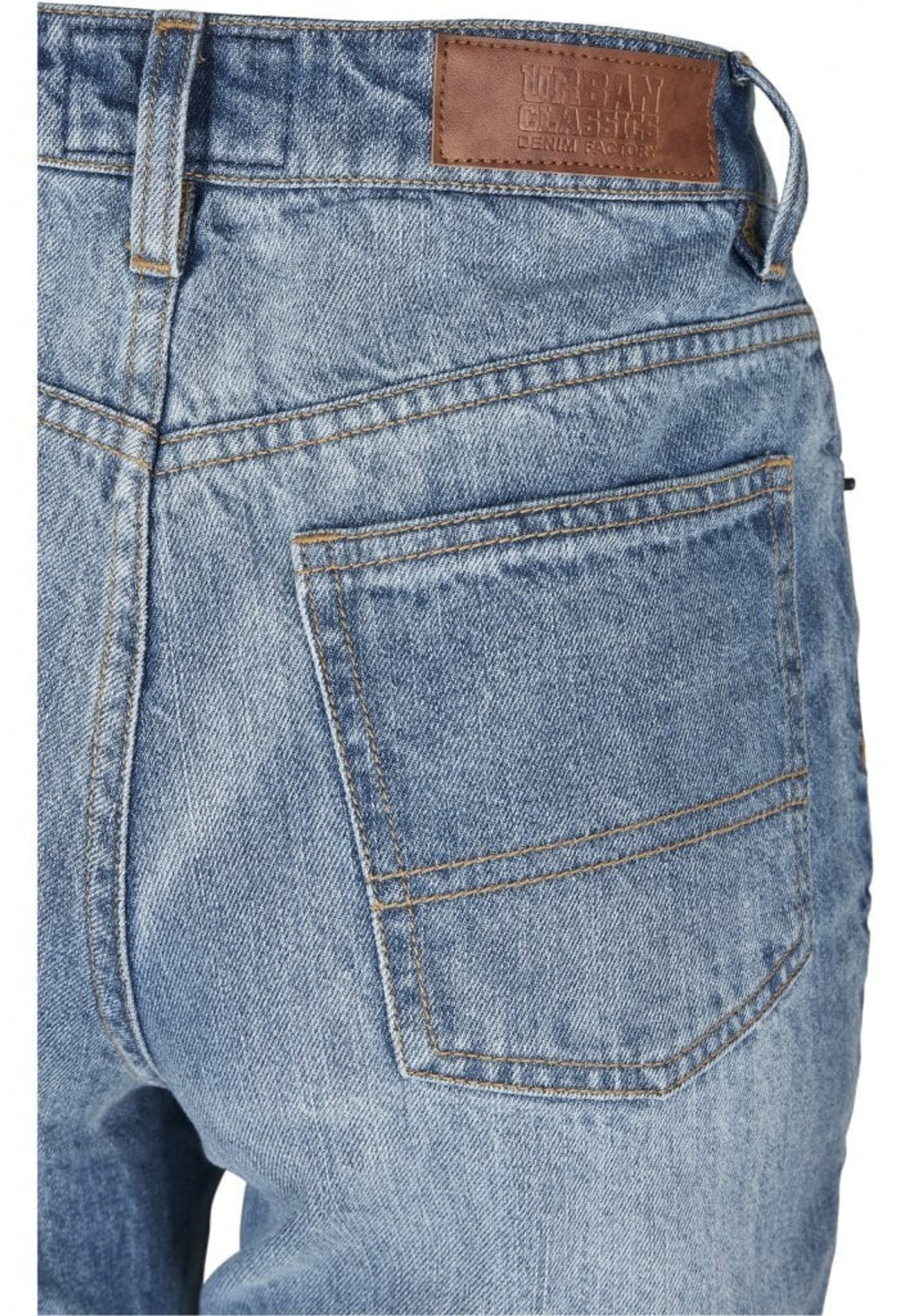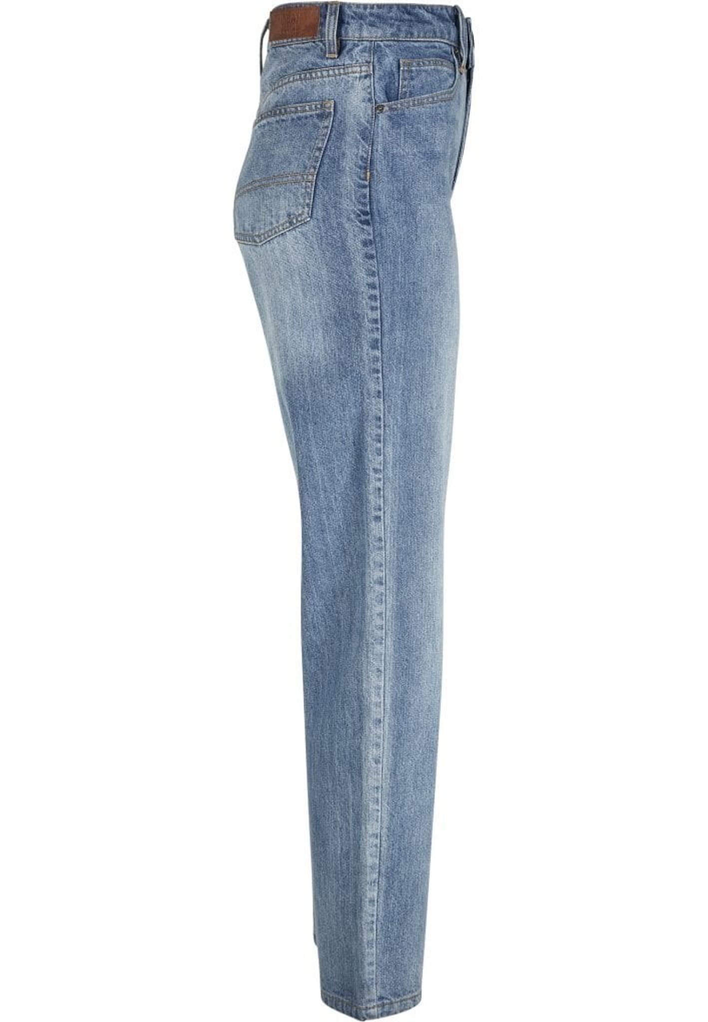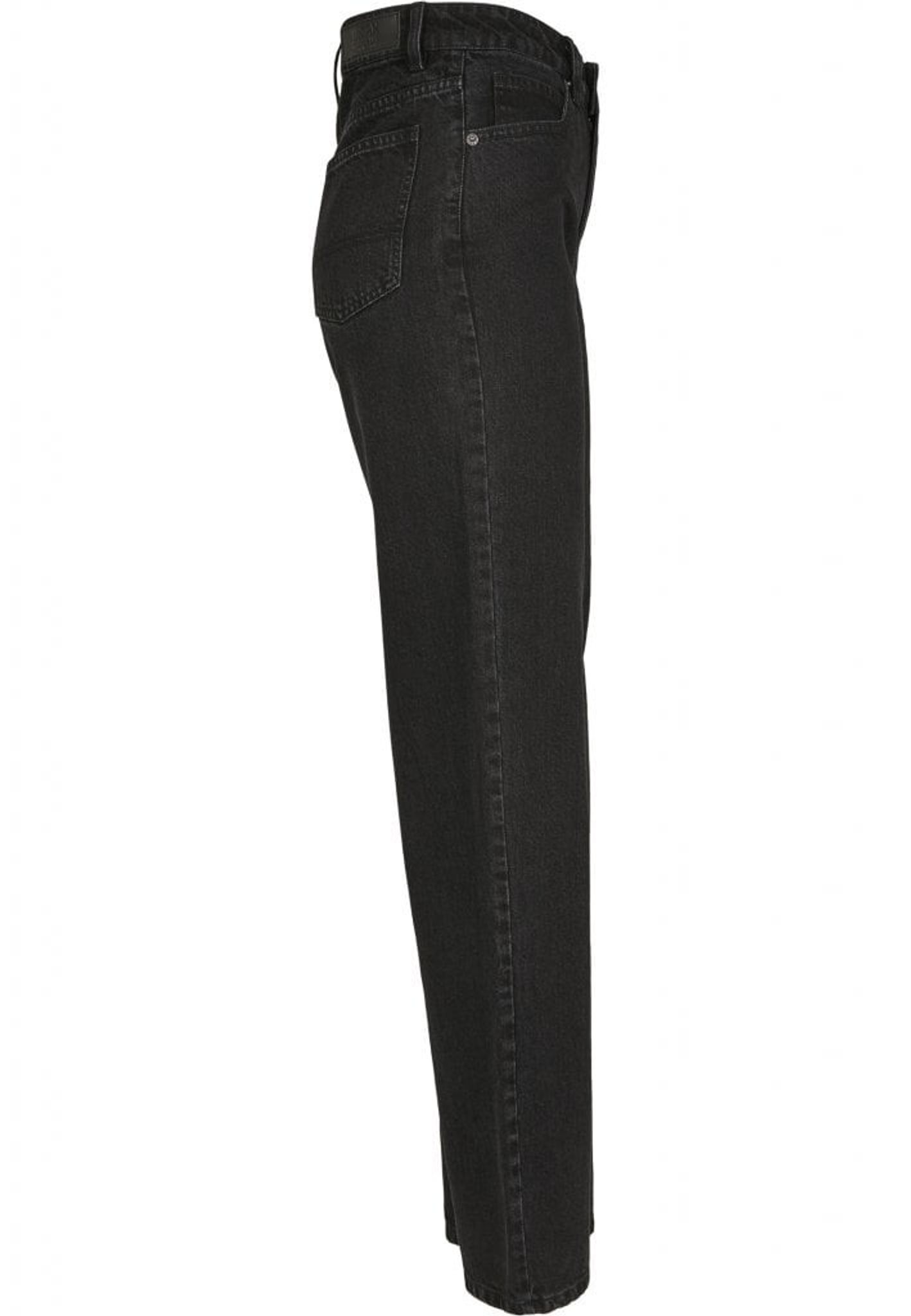 A pair of jeans with high waist and straight fit.