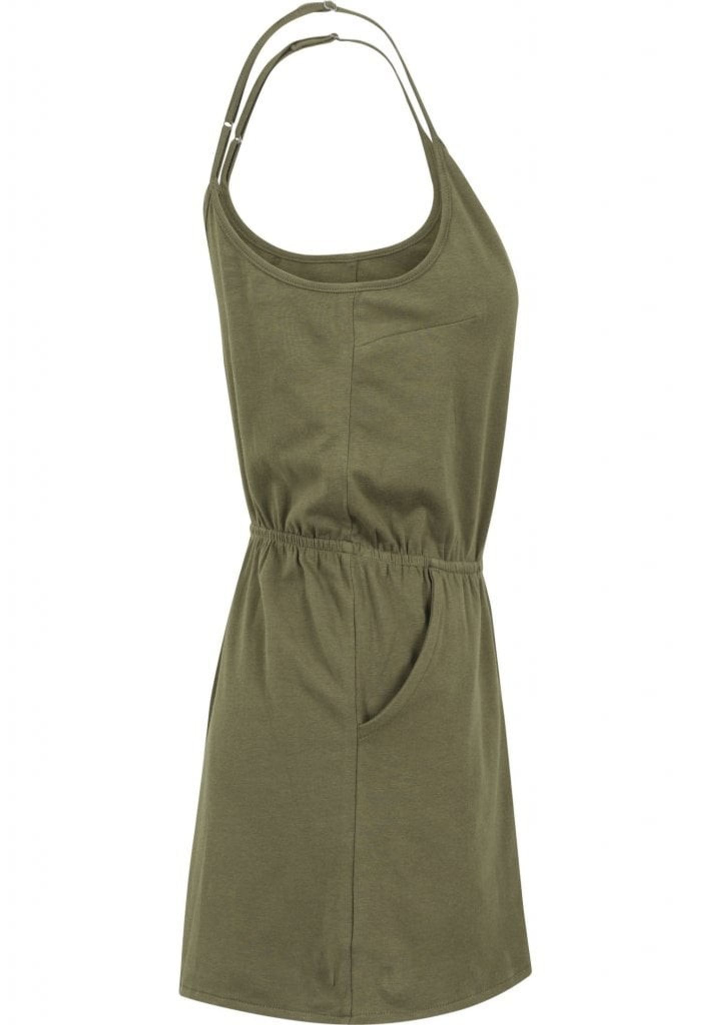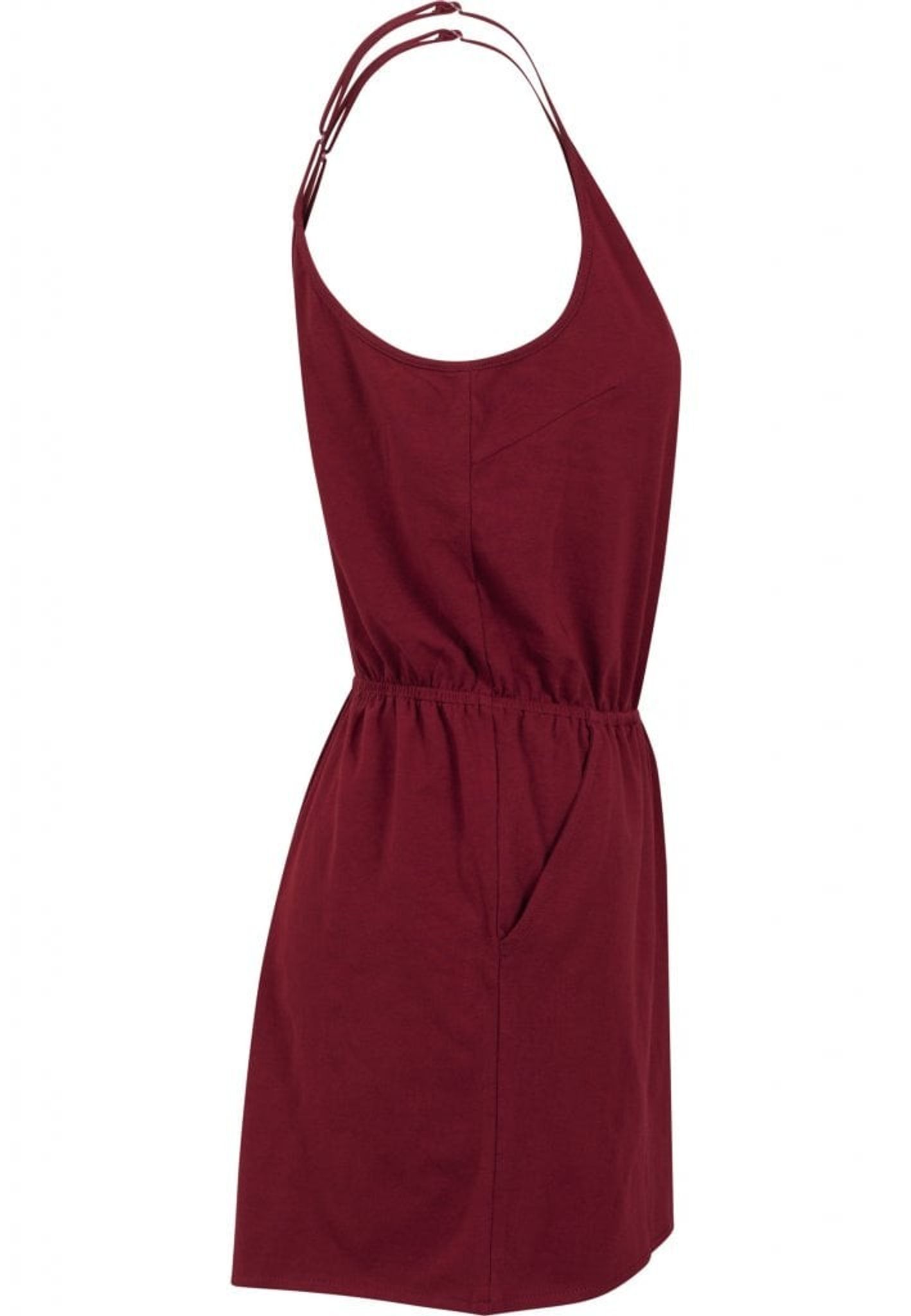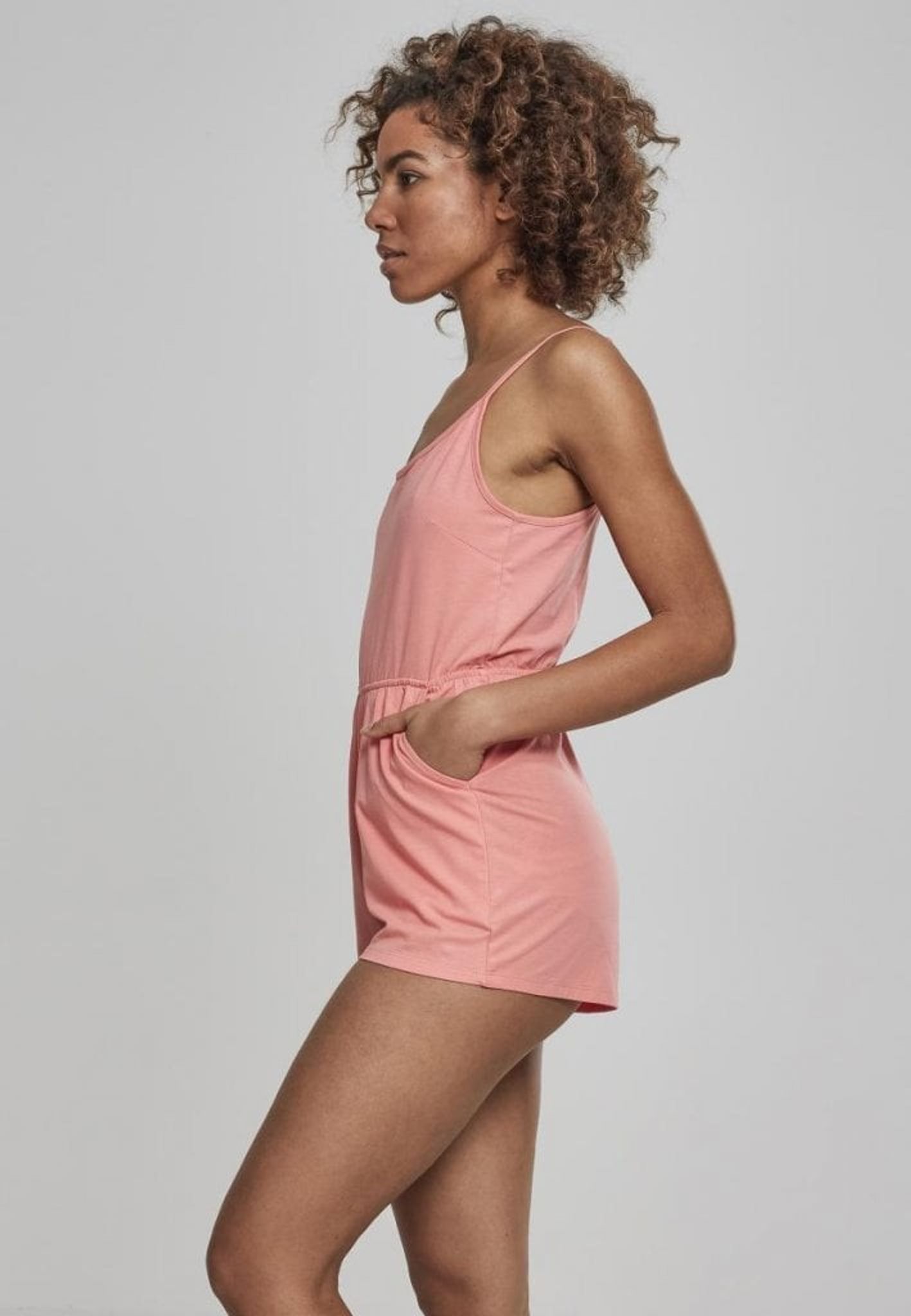 This jumpsuit features narrow adjustable shoulder straps and a deep V-shaped back.