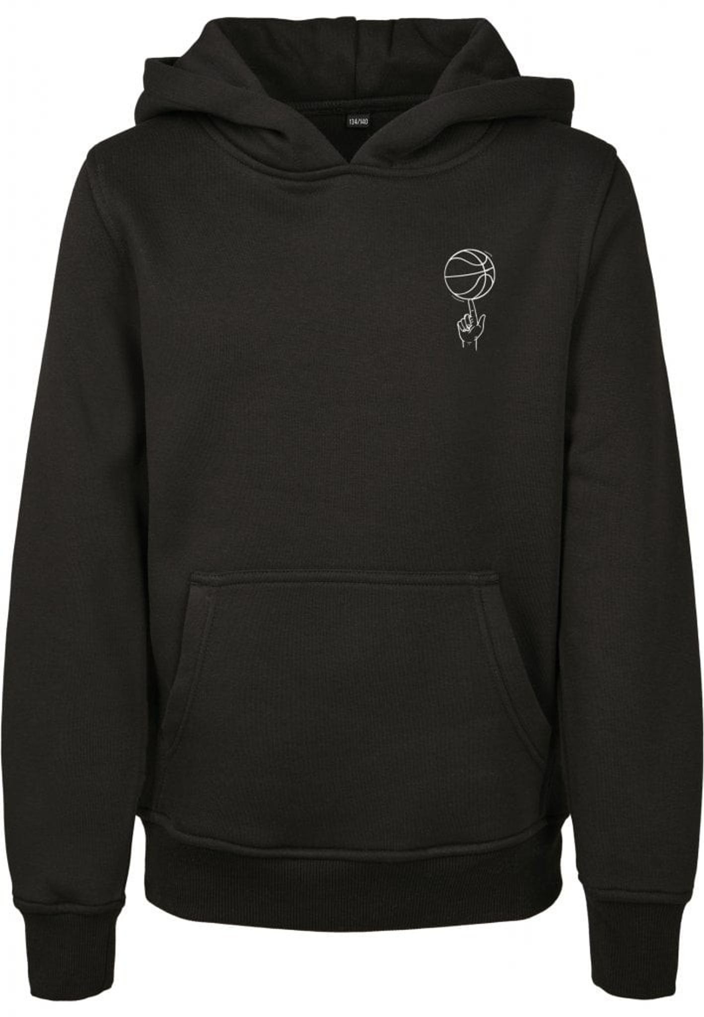 Black hoodie for children from Mister Tee with wide cuffs. Comfortable with kangaroo pocket and a chest print with basketball. On the back a back pressure with tips on team tactics for the basketball court.