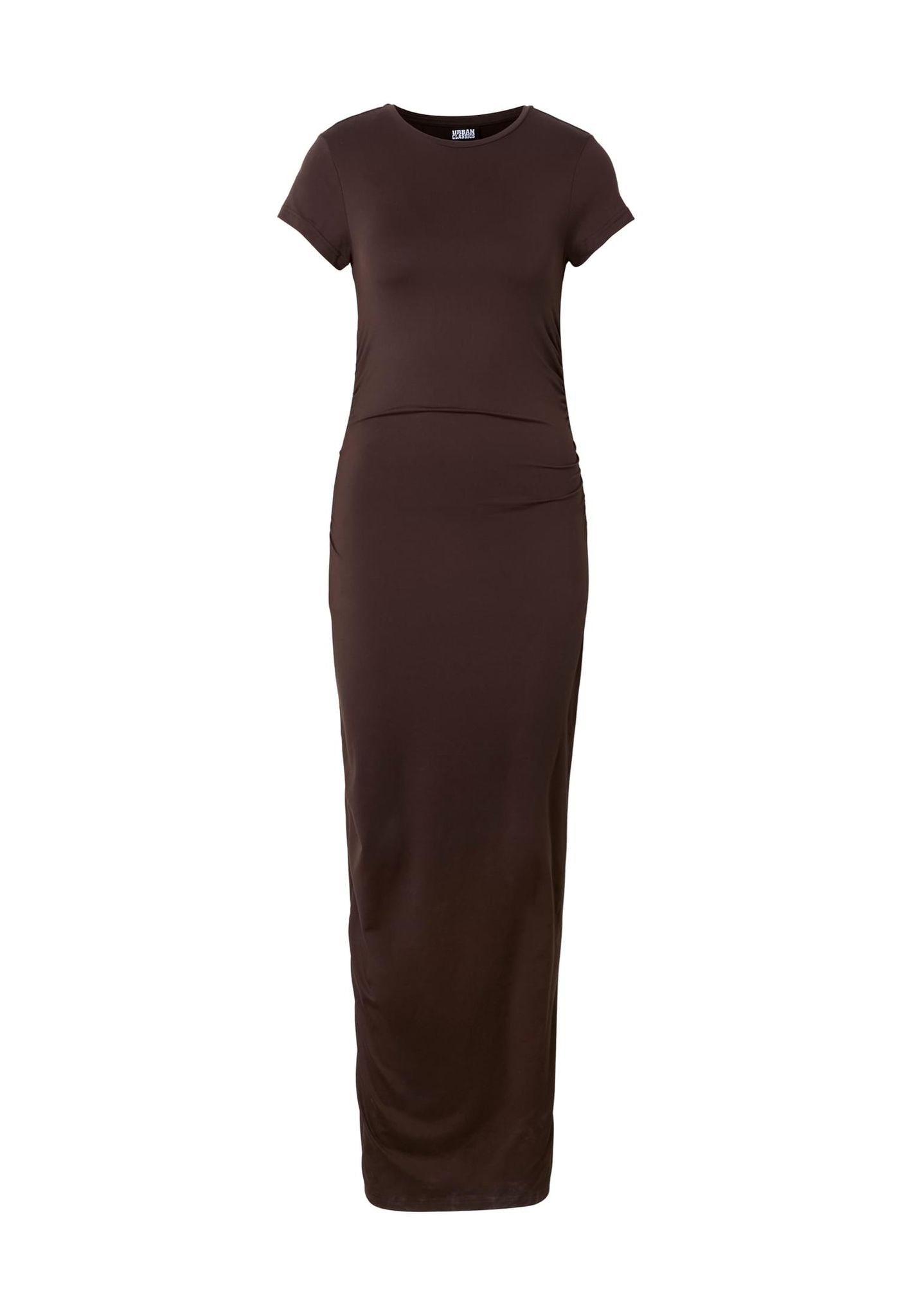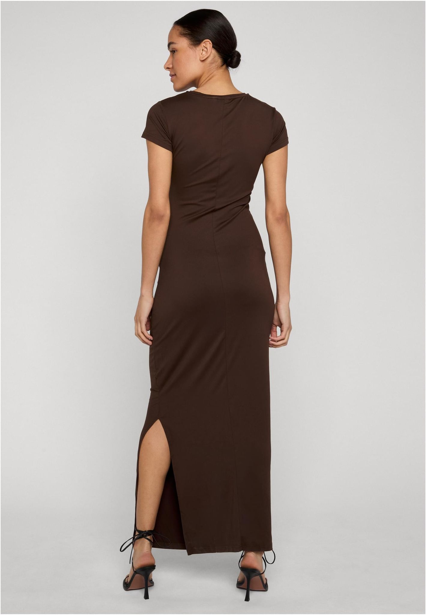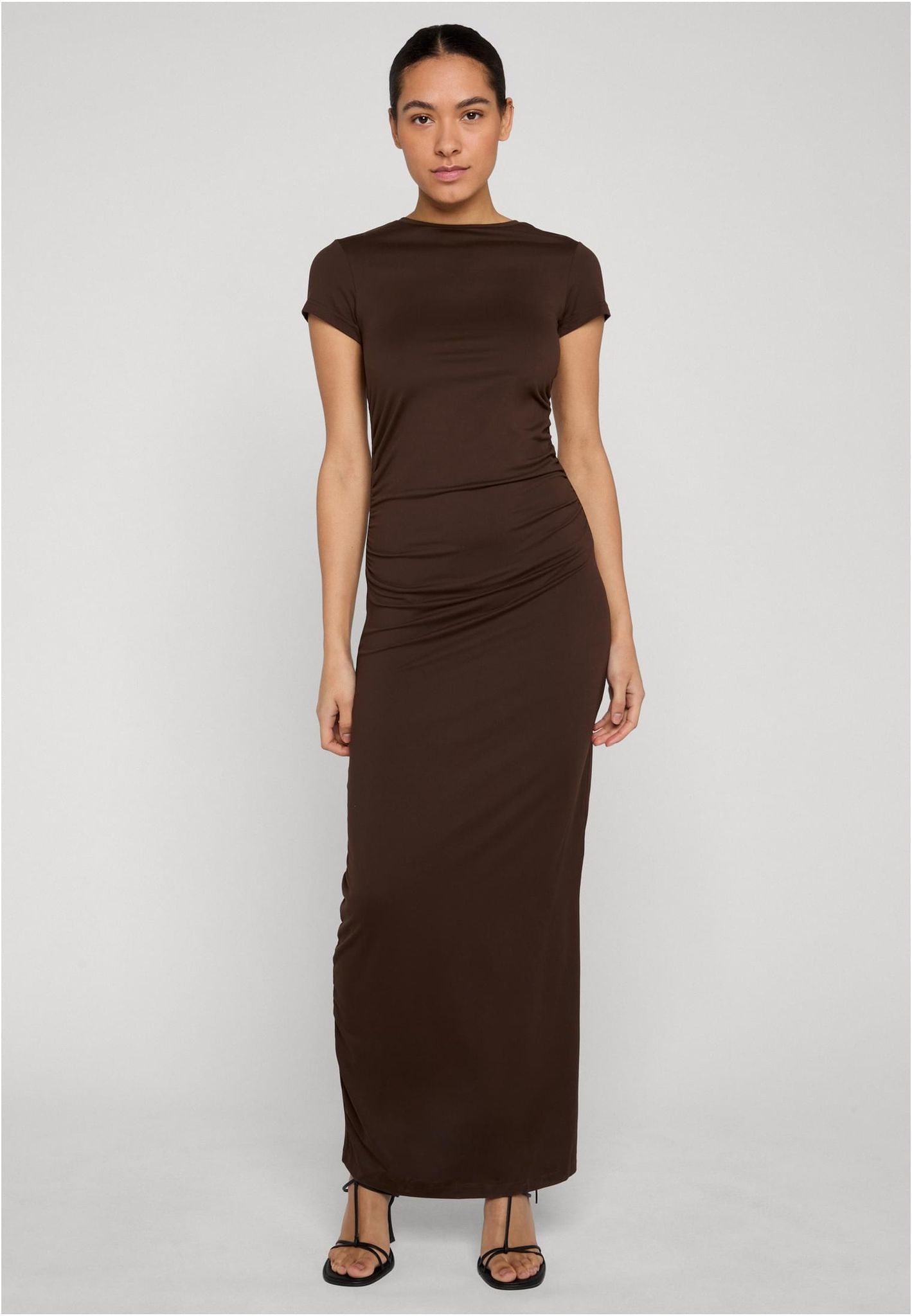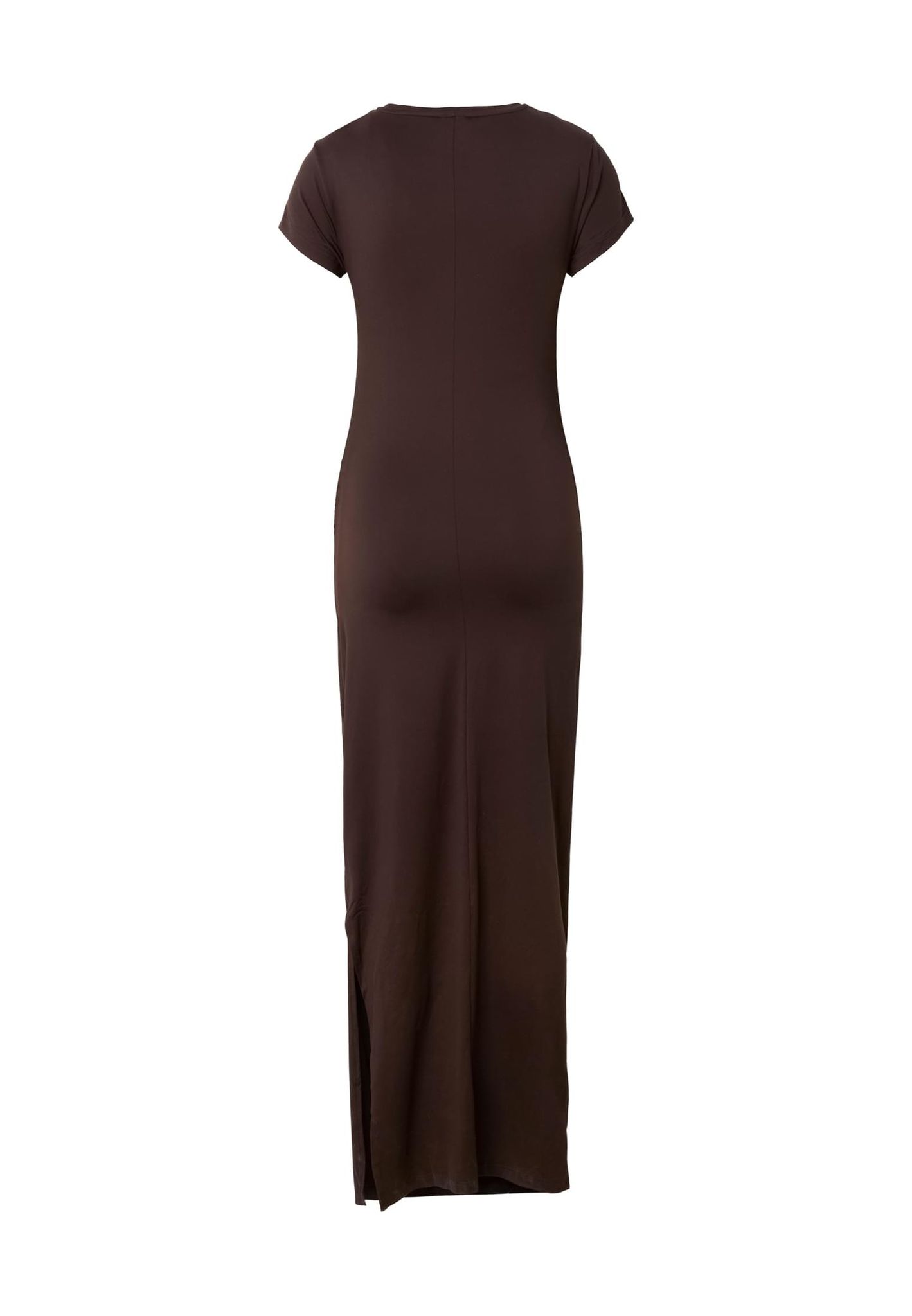 Klänningen är designad för damer och kommer i en vacker brun nyans. Den har en stilren rund skärning och en slits vid benen som ger en lekfull touch, perfekt för både vardag och fritid.