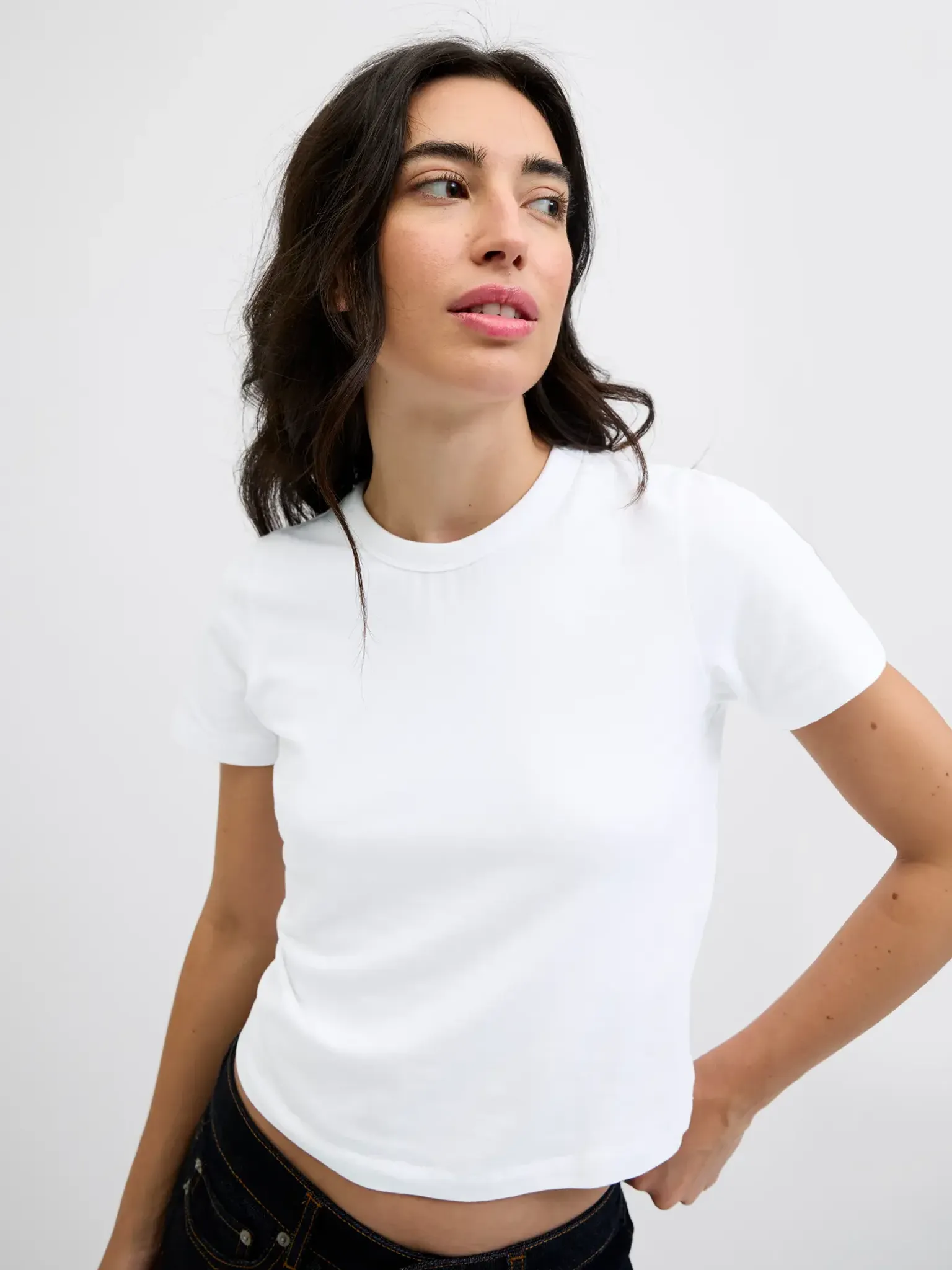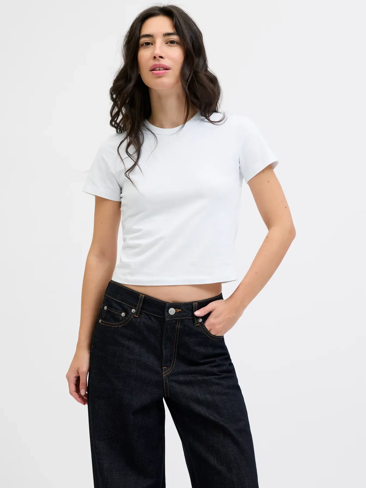 T-shirten har en rund hals och korta ärmar, vilket ger en klassisk och tidlös stil.