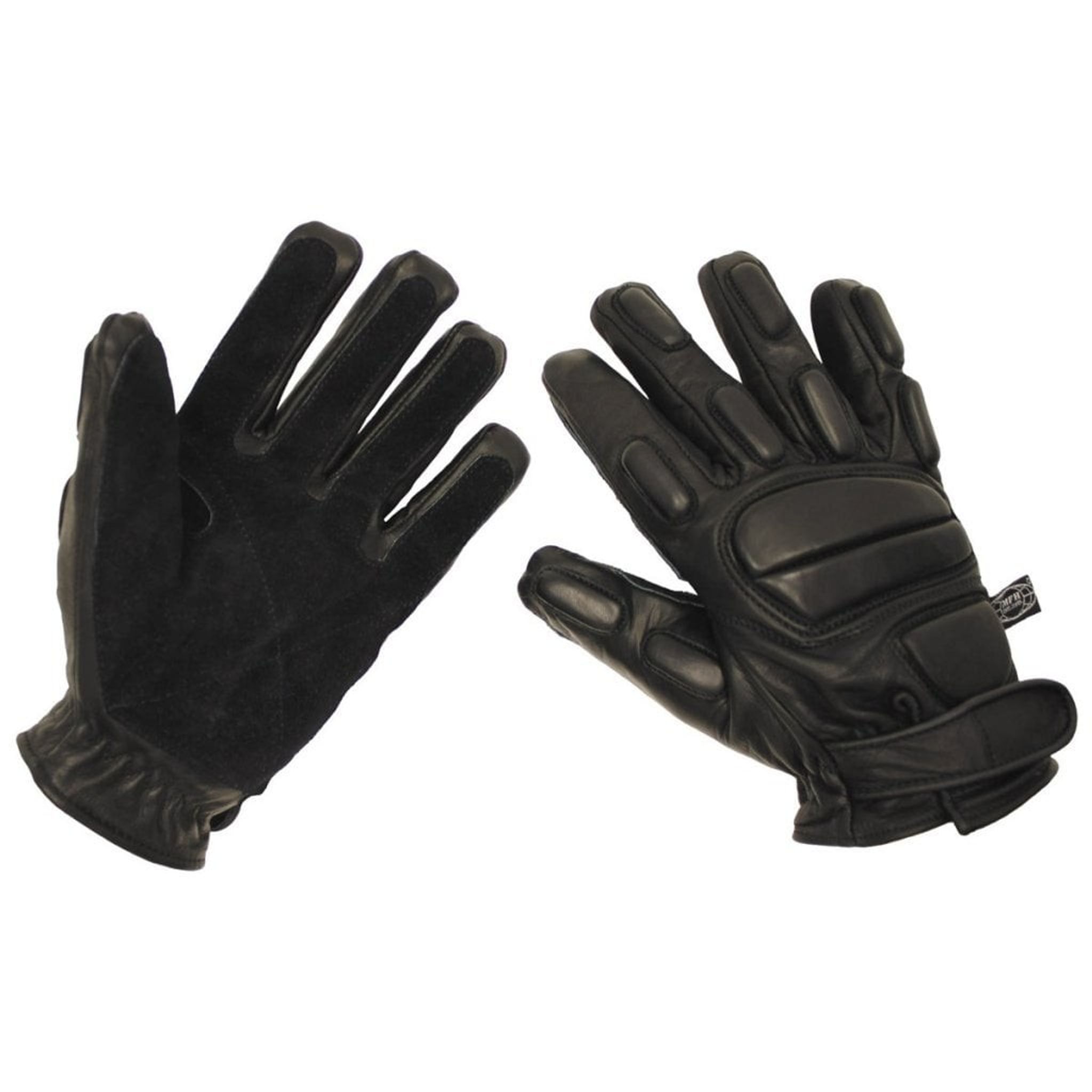 A pair of functional protective gloves with padding on knuckles and fingers. The palms are covered in suede. The upper is made of leather with rubber padding.