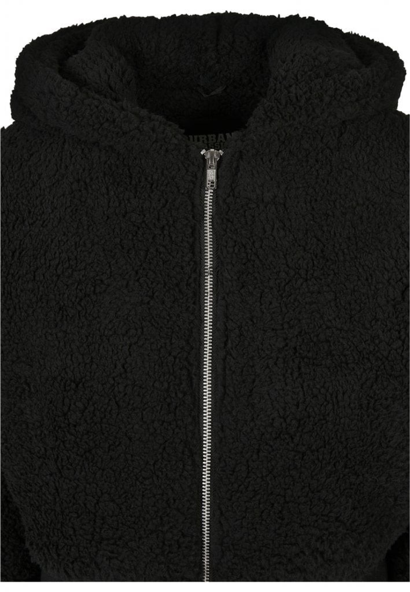 A tough teddy jacket in a short model and with an oversize model in the fit with its loose shoulders and large hood. The jacket is framed by large cuffs at the cuffs and waist.
