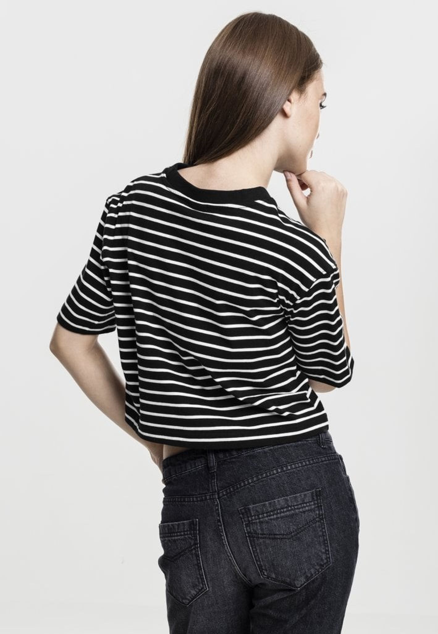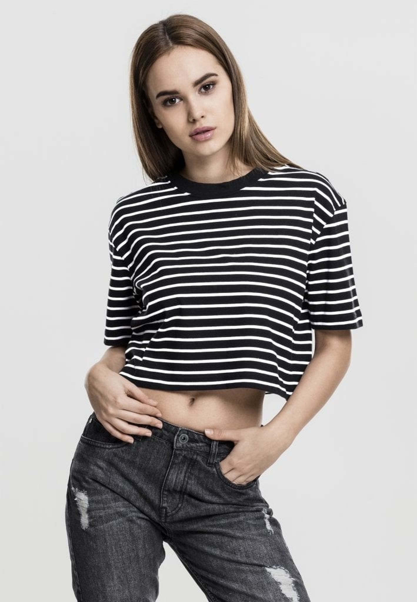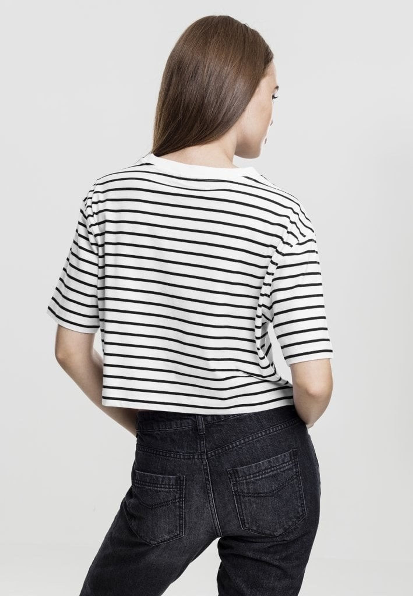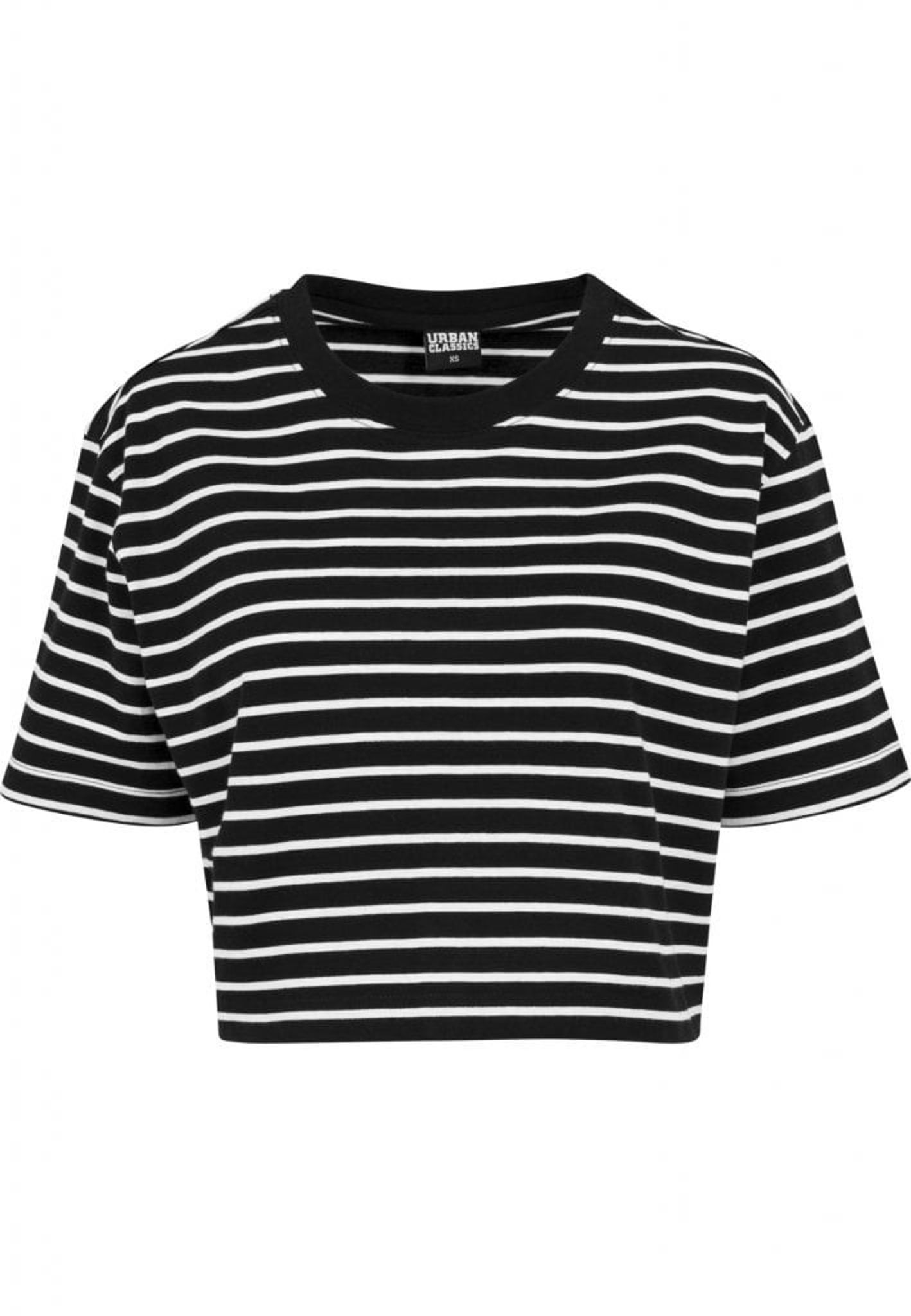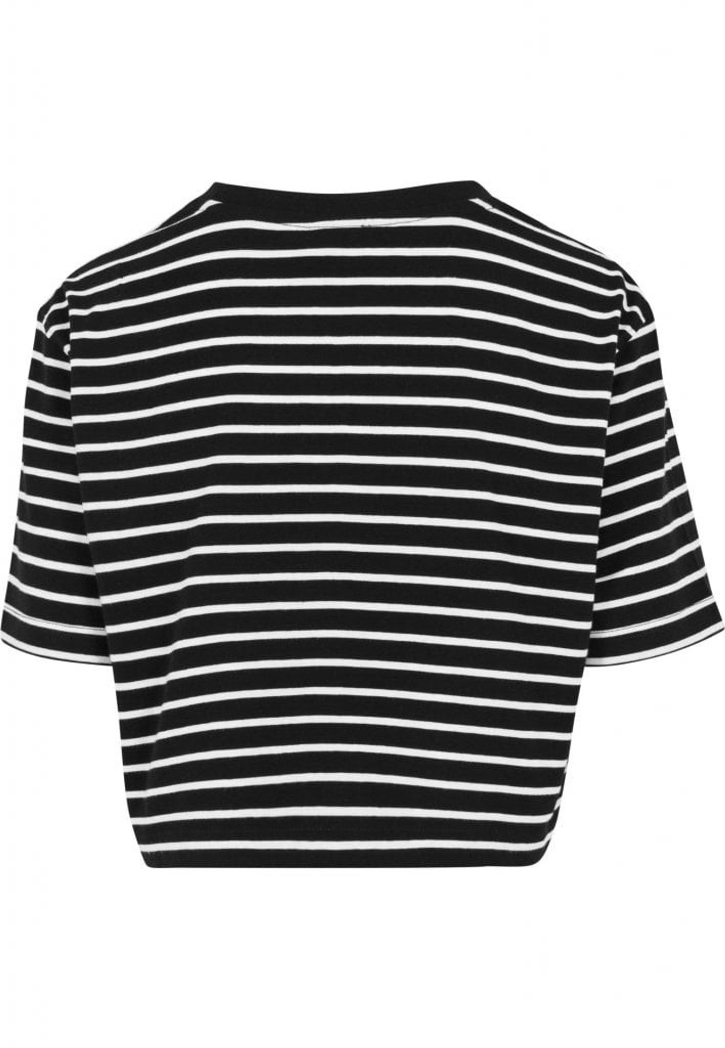 This t-shirt is short and oversized with stripes in two color settings, black / white and white / black.