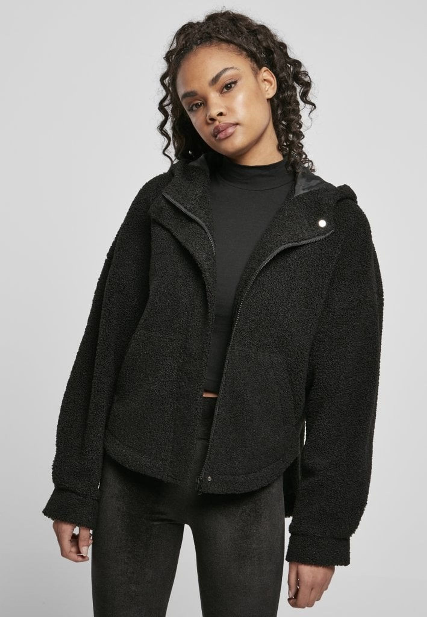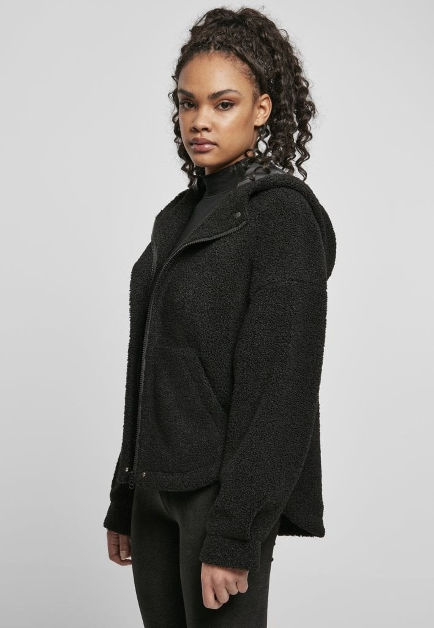 The arms are wide and long and the bottom edge of the jacket is rounded and further back.