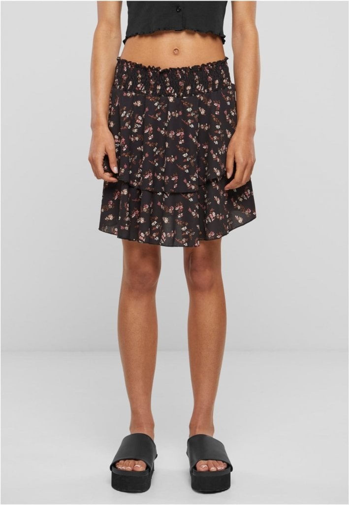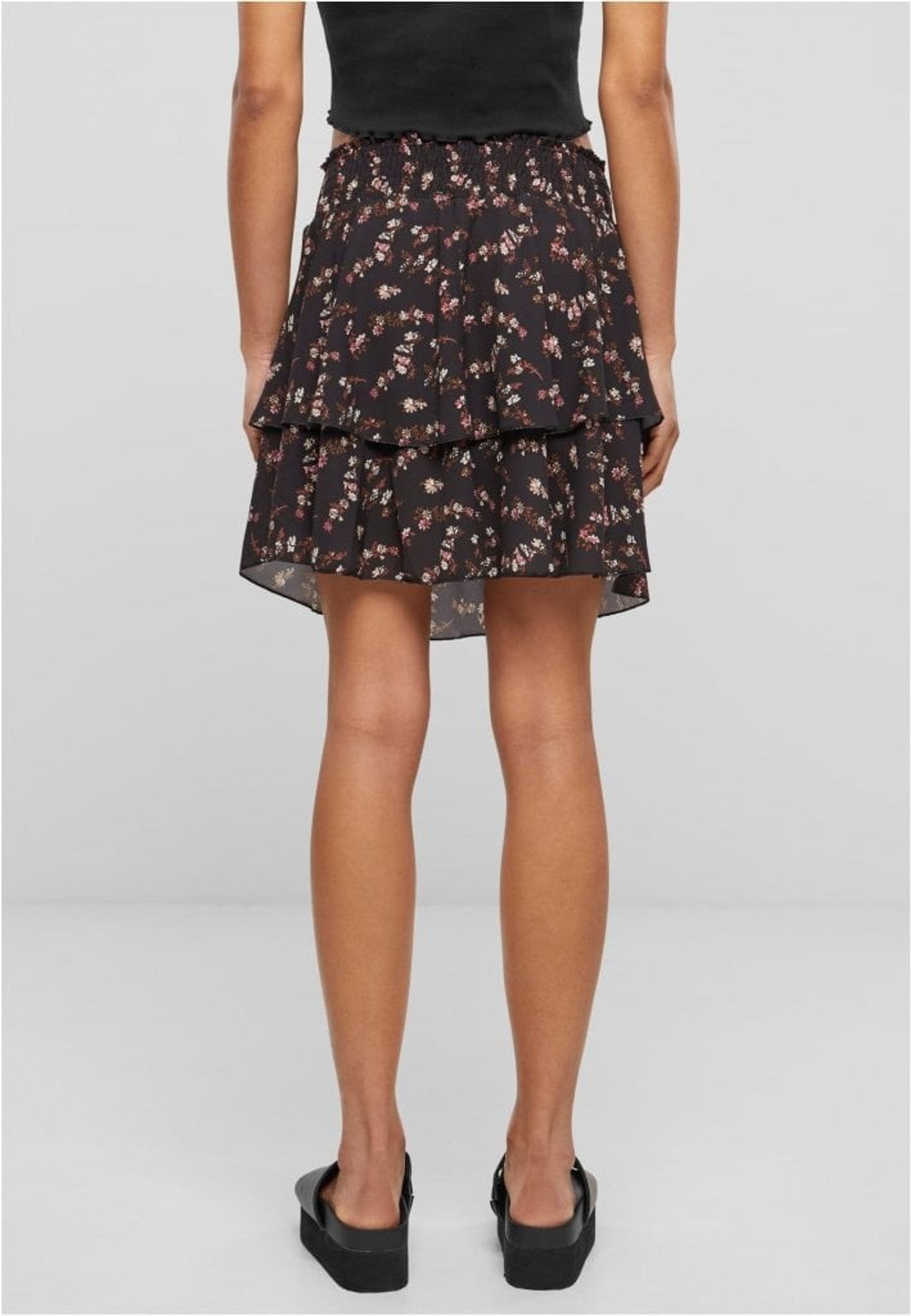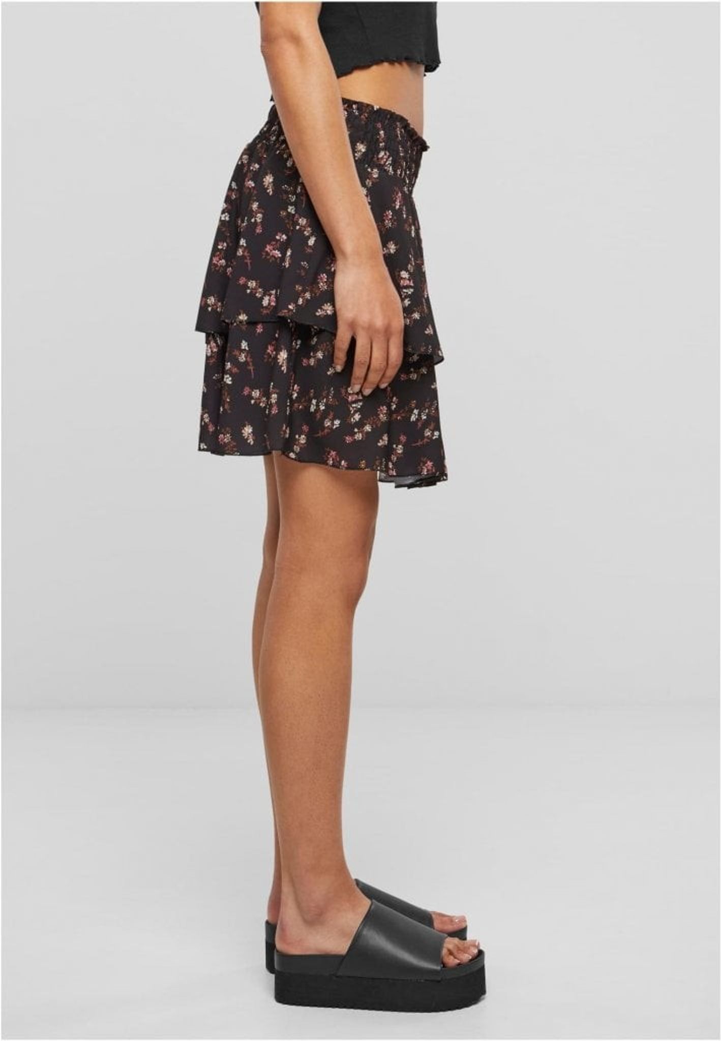 A stunning floral patterned skirt with layers of ruffles. The skirt has a dark base color, probably black, with intricate floral patterns in pink, white and yellow. The elastic waistband makes the skirt easy to wear and comfortable, making it a perfect choice for all-day wear.