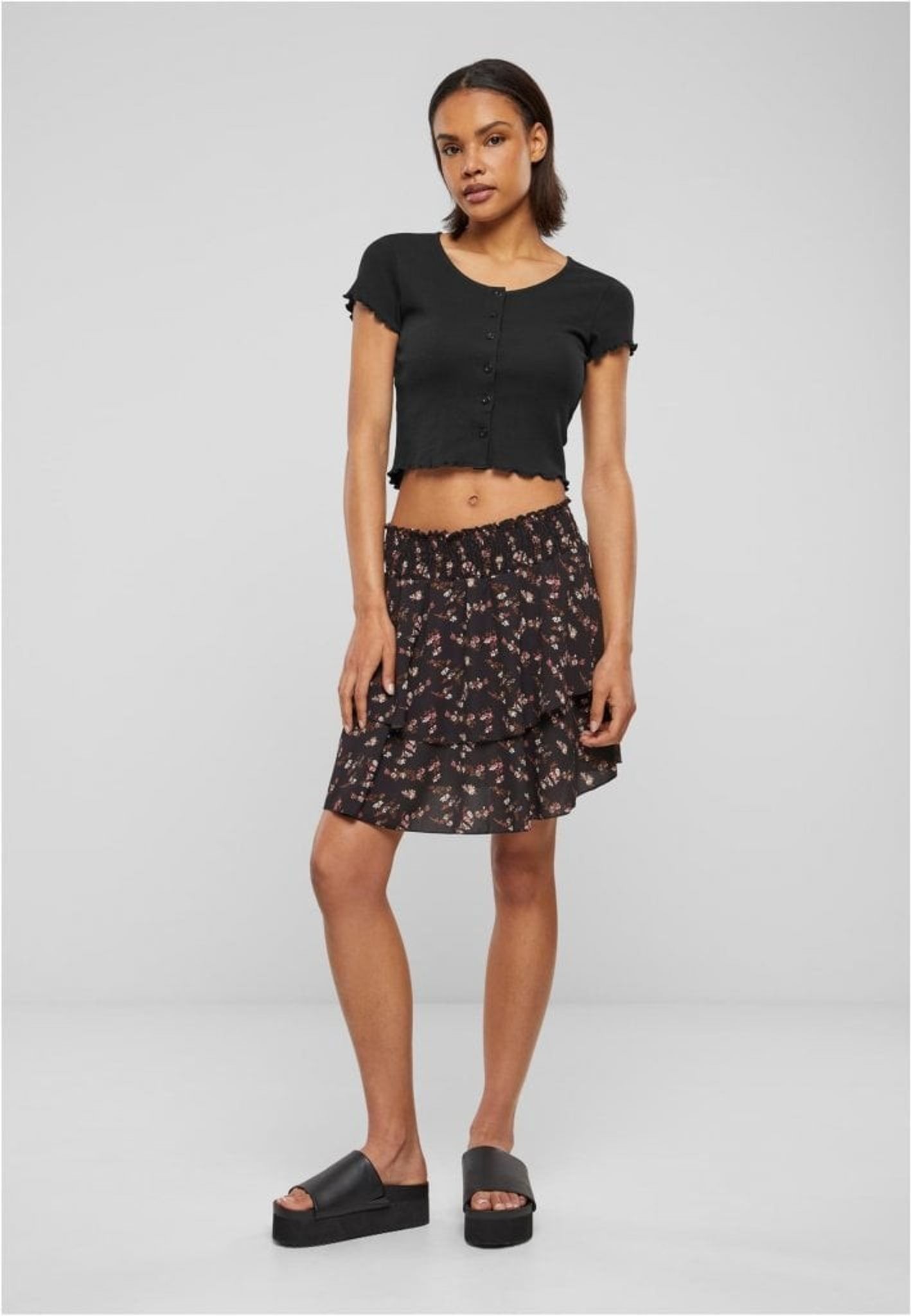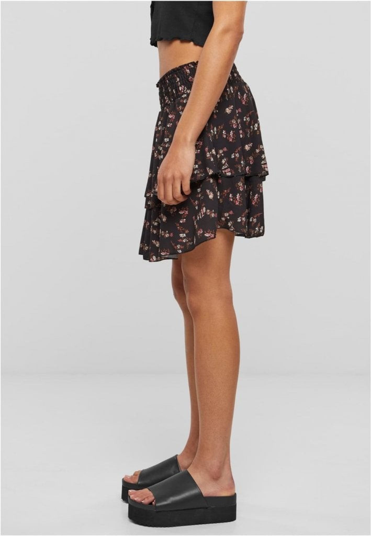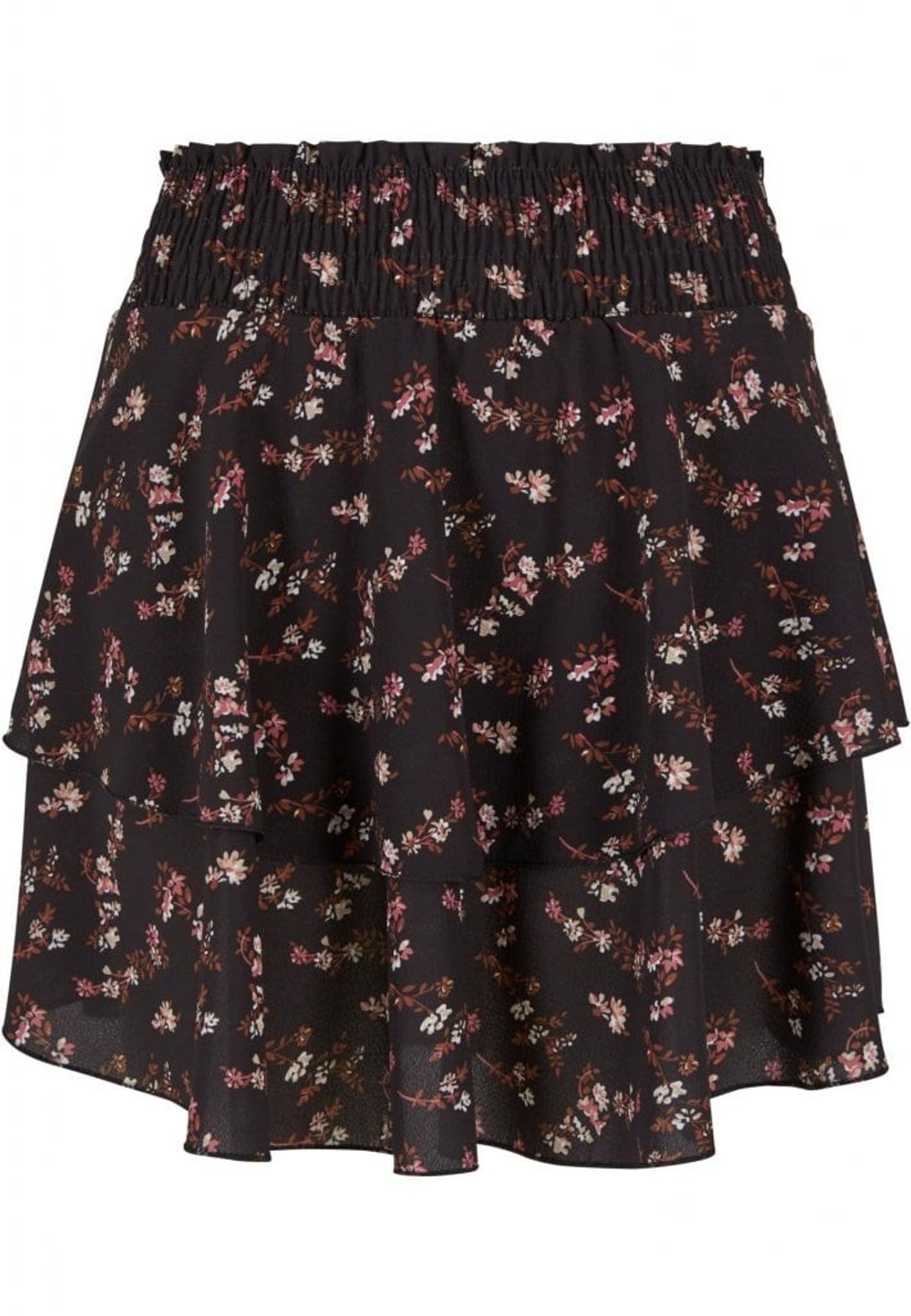A stunning floral patterned skirt with layers of ruffles. The skirt has a dark base color, probably black, with intricate floral patterns in pink, white and yellow. The elastic waistband makes the skirt easy to wear and comfortable, making it a perfect choice for all-day wear.