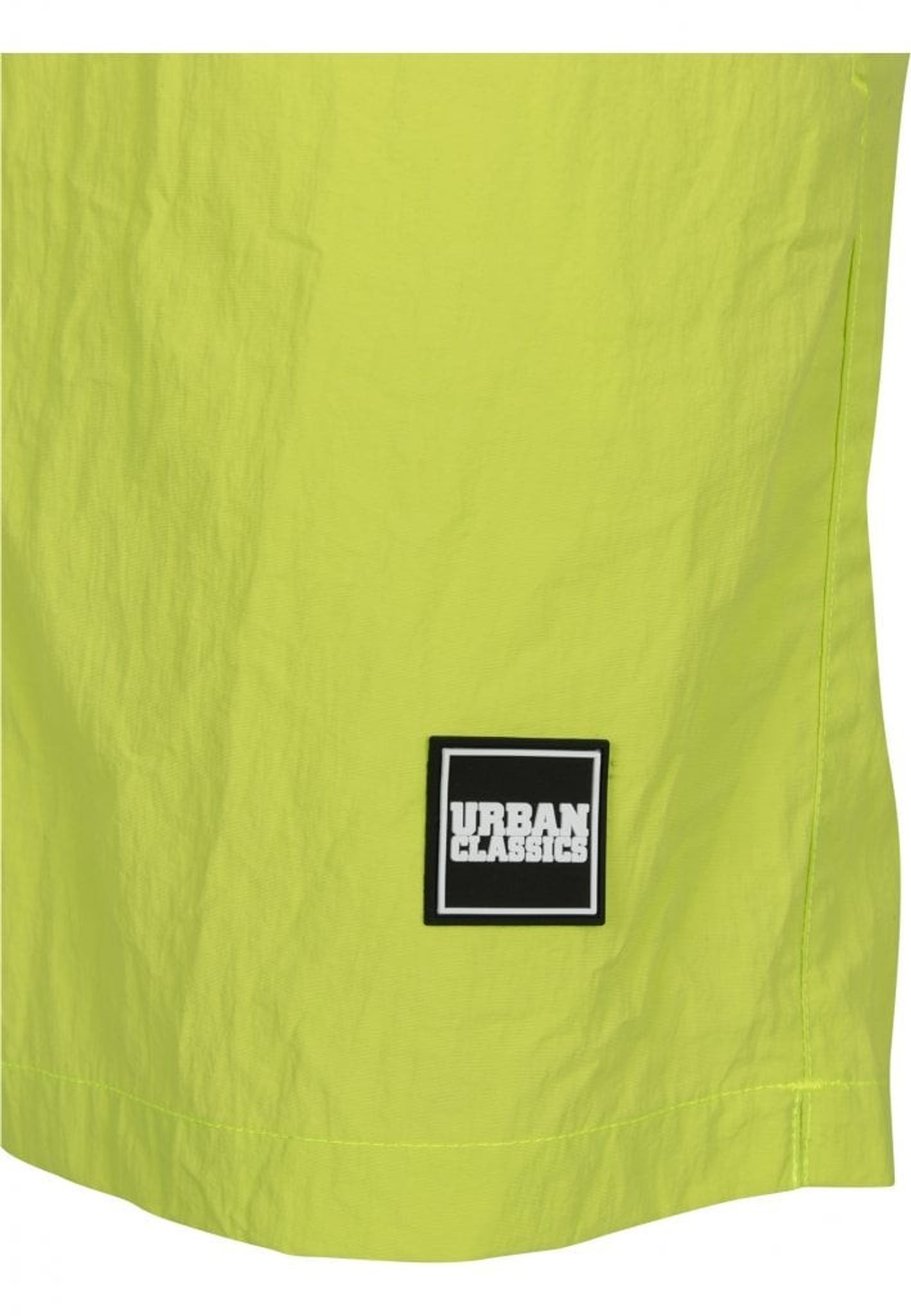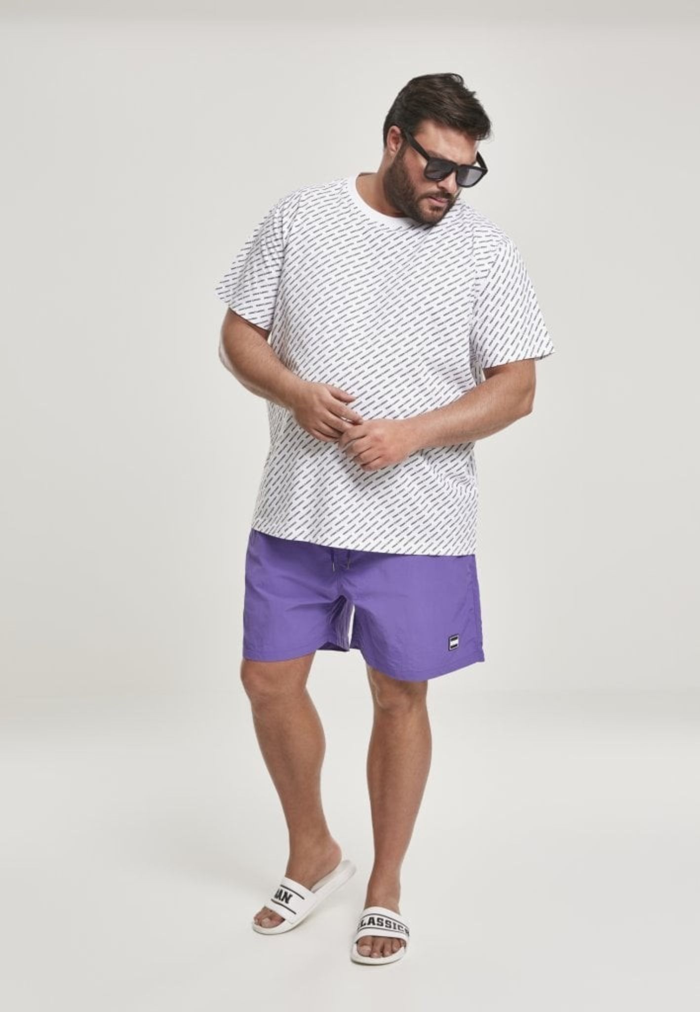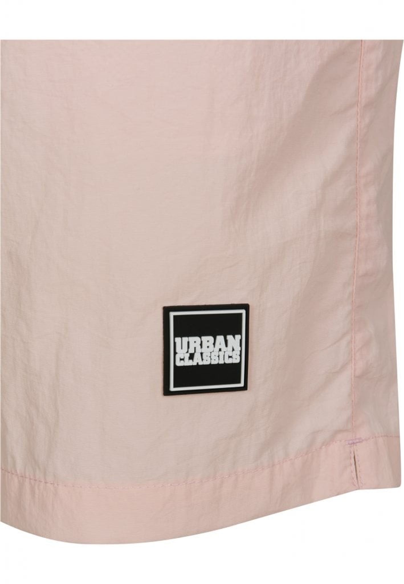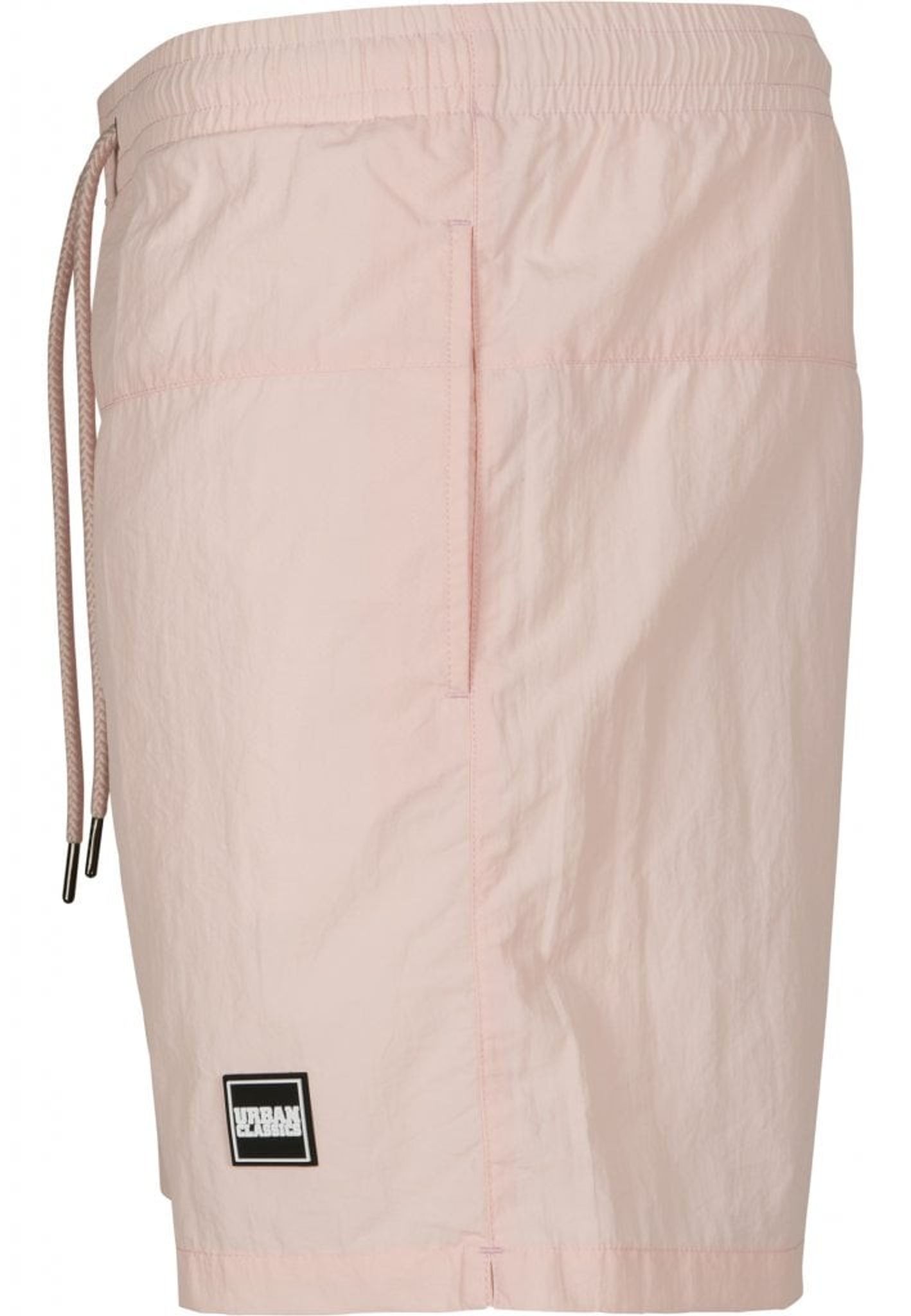 A pair of single color bathing shorts with double side pockets and a back pocket with zipper.