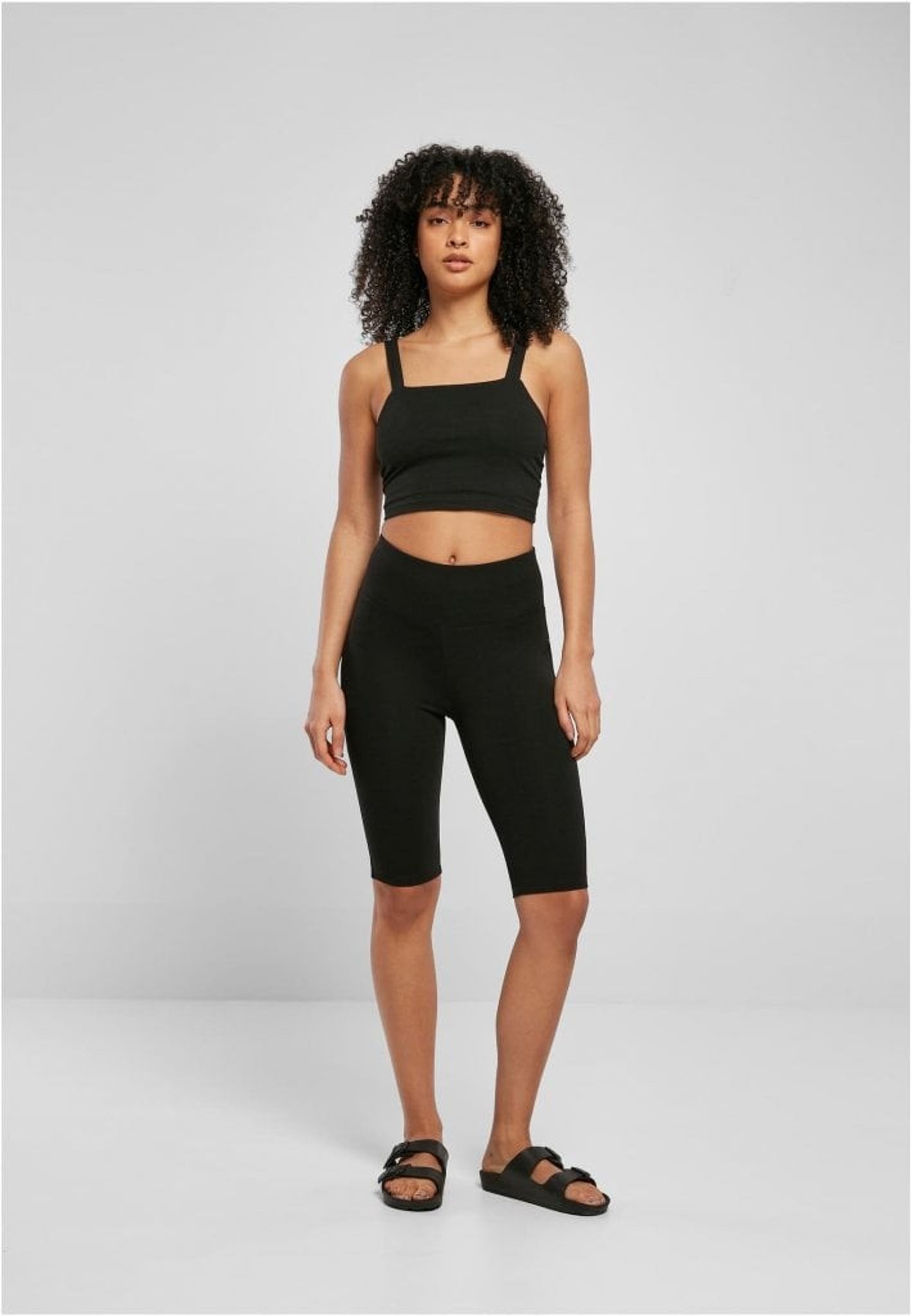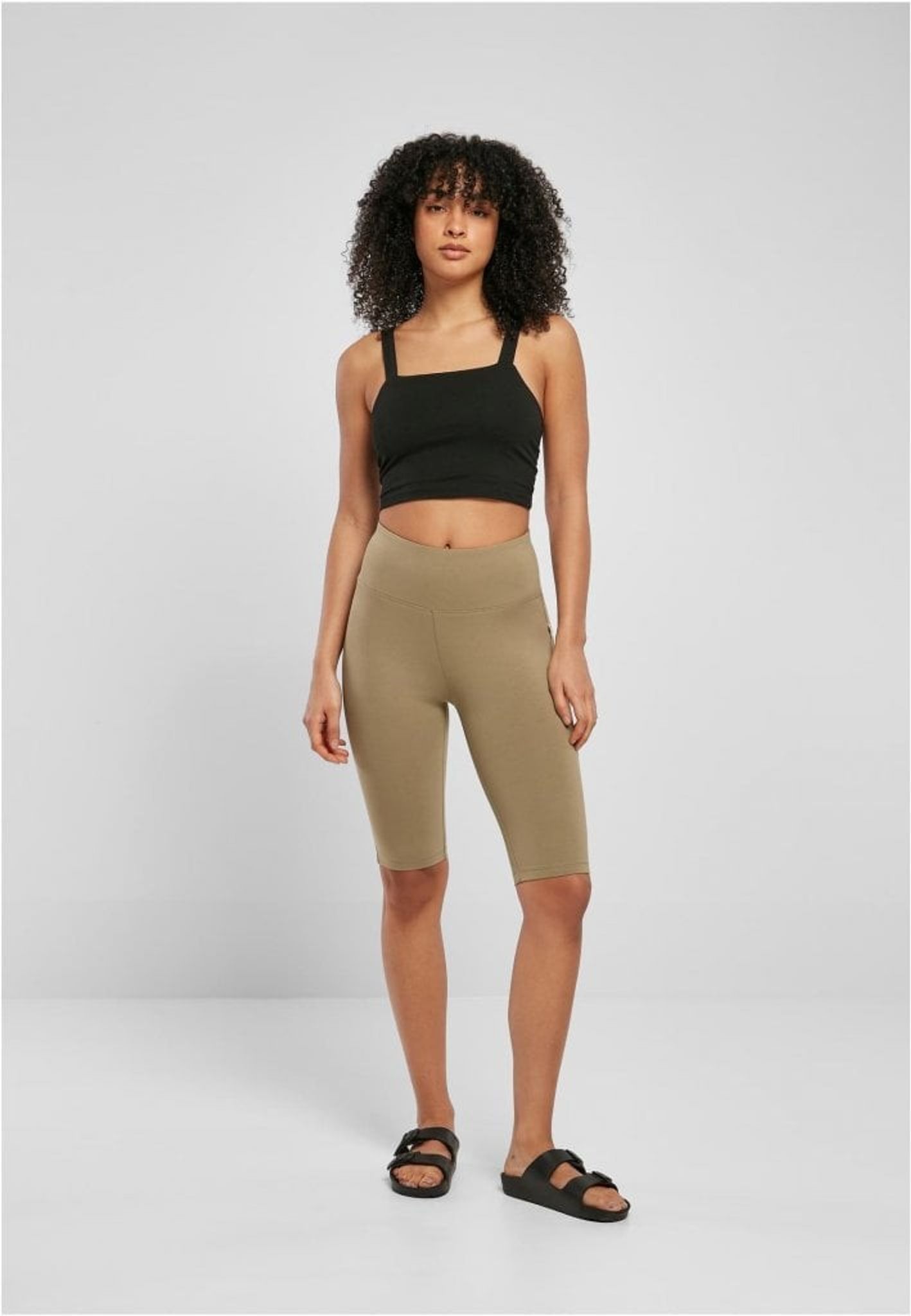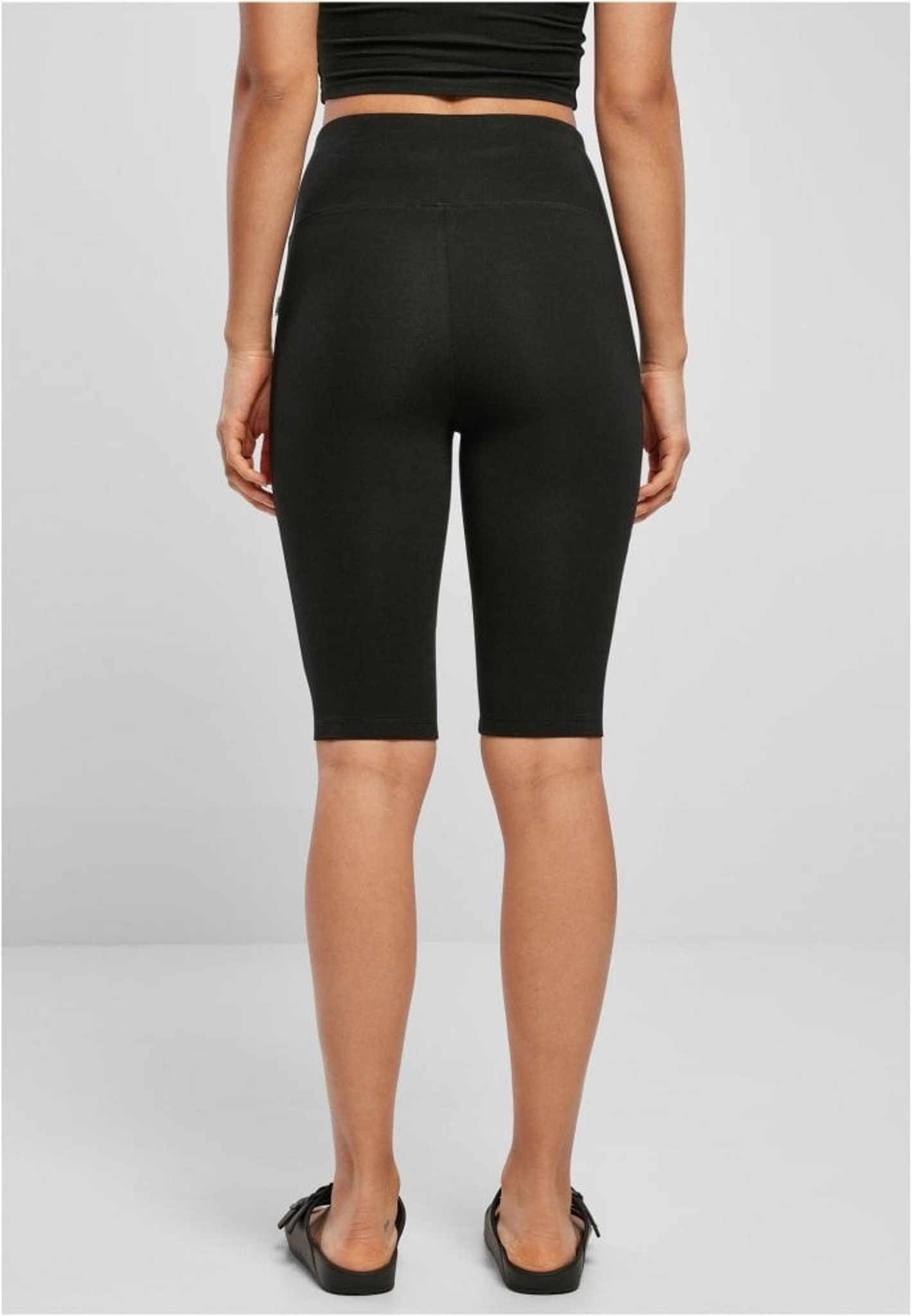 The cycling shorts have a high waist with a wide cuff.