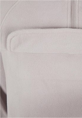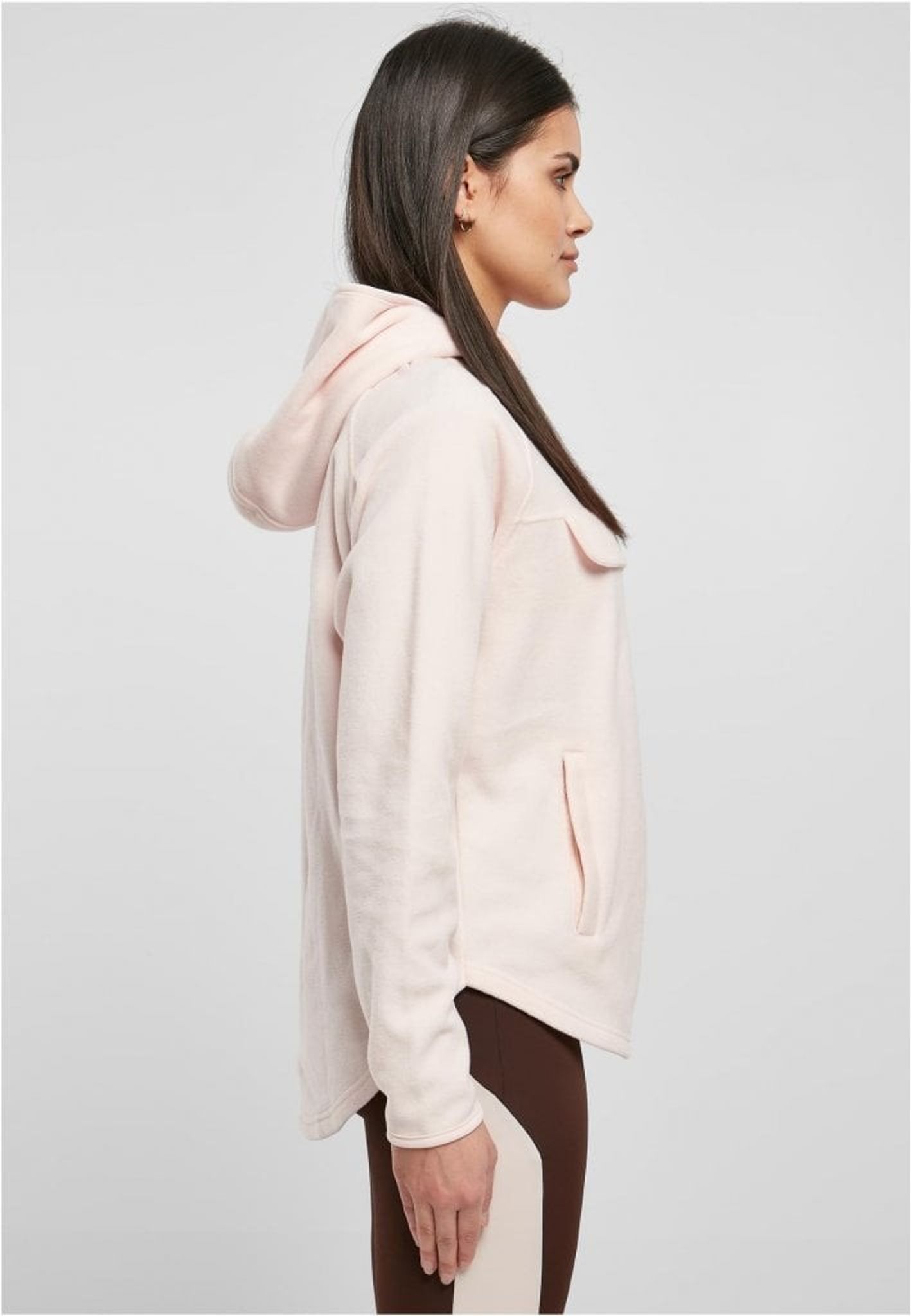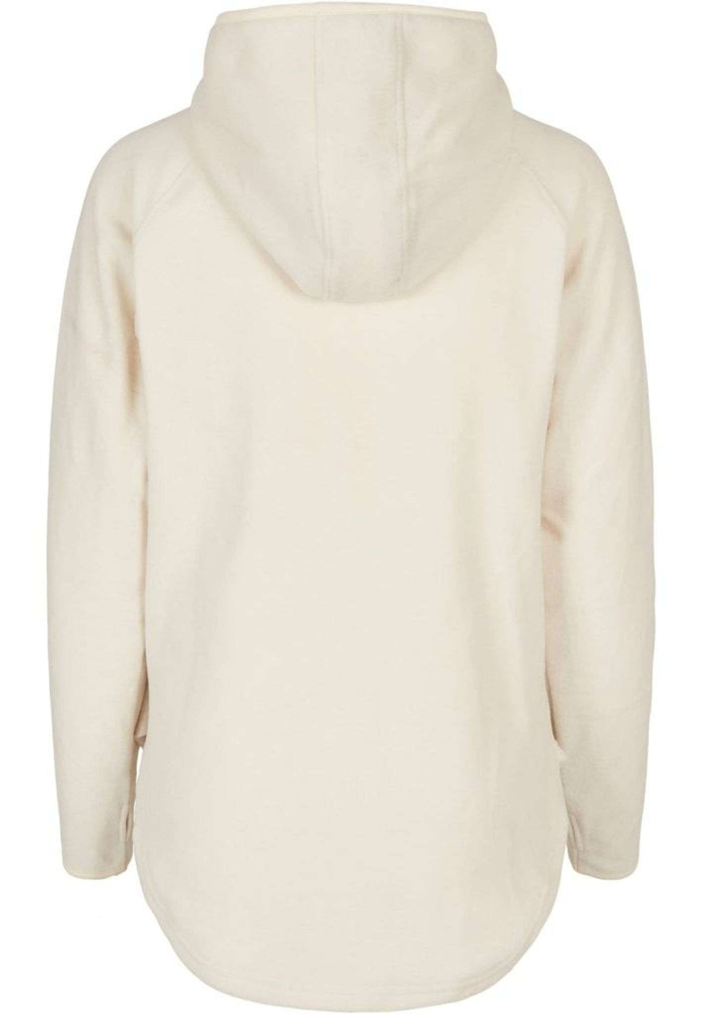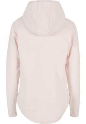 This women's hoodie is a hybrid of a hoodie and a pullover jacket. The hood has a zipper on the lapel and a chin guard. Below, a simple flap runs across the chest. In addition, the shirt is equipped with long sleeves and two side pockets with zippers. The front and back have generously rounded hems, with the back falling over the bum to keep it warm. Cut with raglan sleeves and using flexible microfleece material, optimal wearing comfort is guaranteed. A narrow tape on the cuffs and hood completes the style. The women's hoodie has a normal fit.