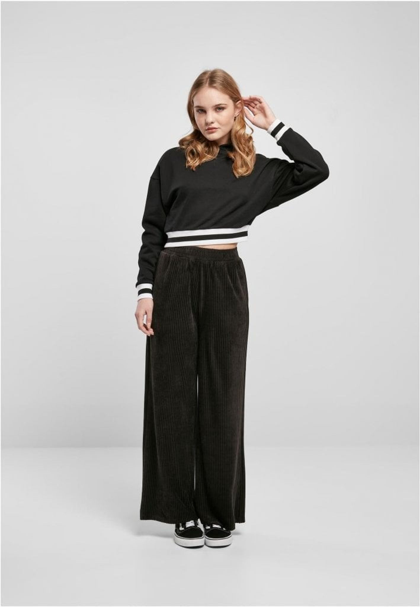 When a hoodie meets college design – the result is an absolute must! The cropped hoodie features signature college striped cuffs at the sleeves and hem and a cozy hood. The fit is oversized, with suitably dropped shoulders. The hoodie is made of cotton and polyester.