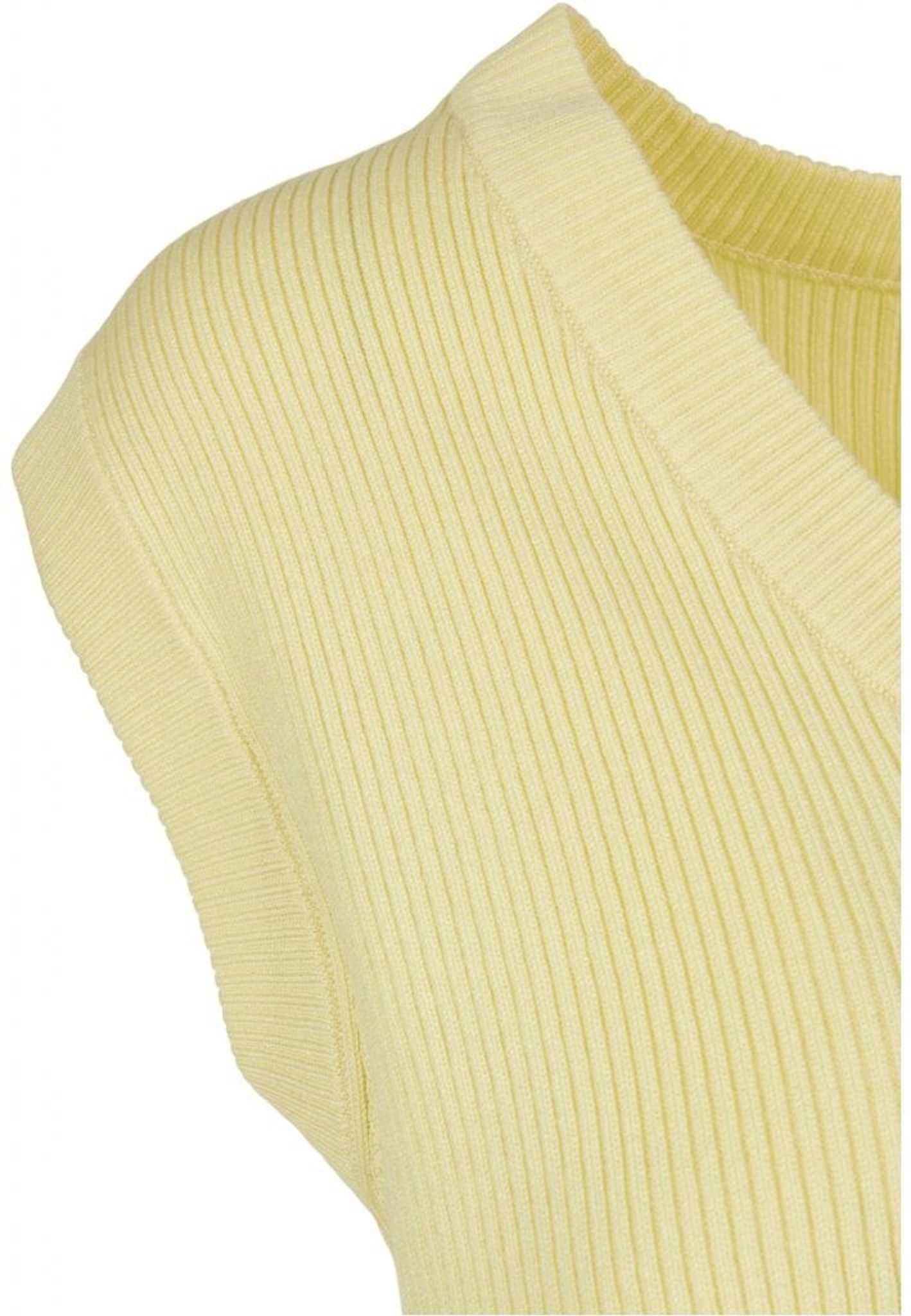 A lovely top with a deep v-neckline and slightly angled shoulders bordered by finely knitted cuffs. The waistcoat is cut short and ends at the waist with a cuffless hem. It has a loose fit.