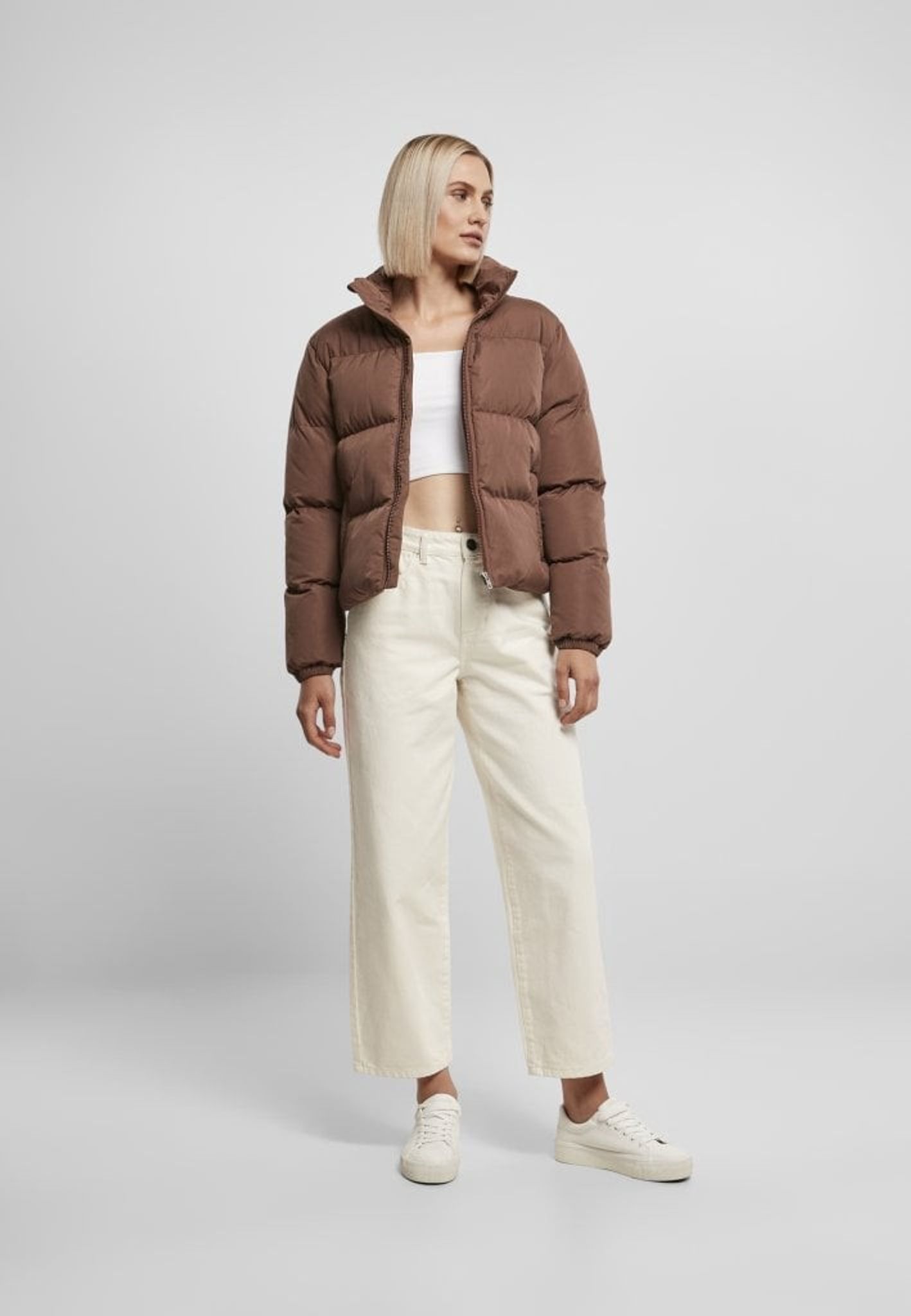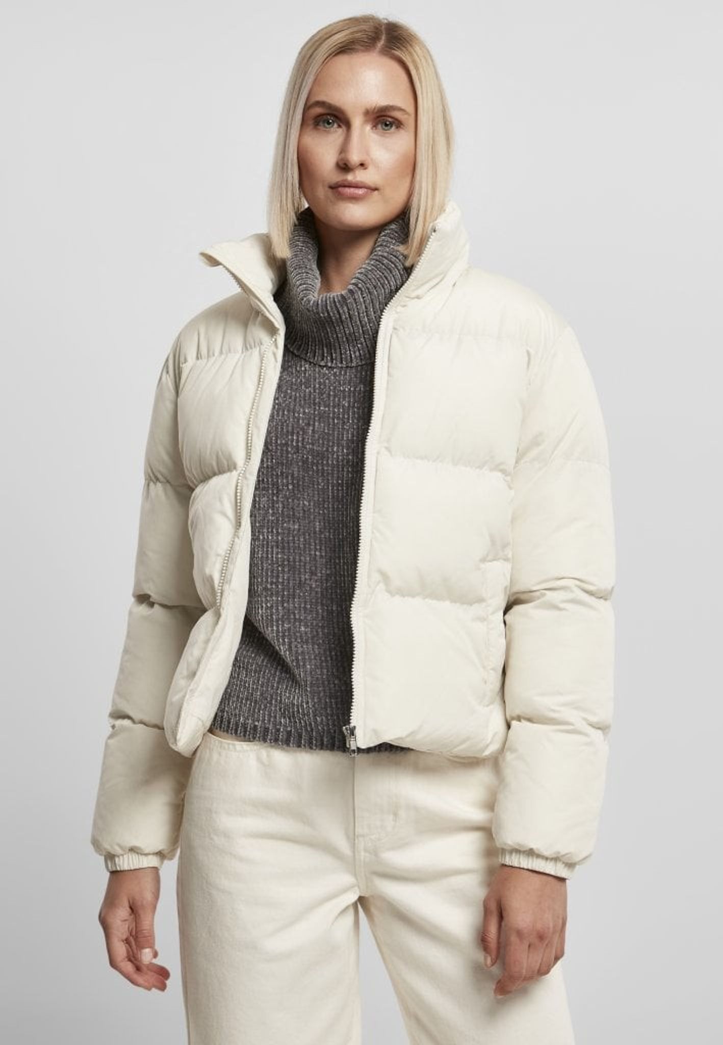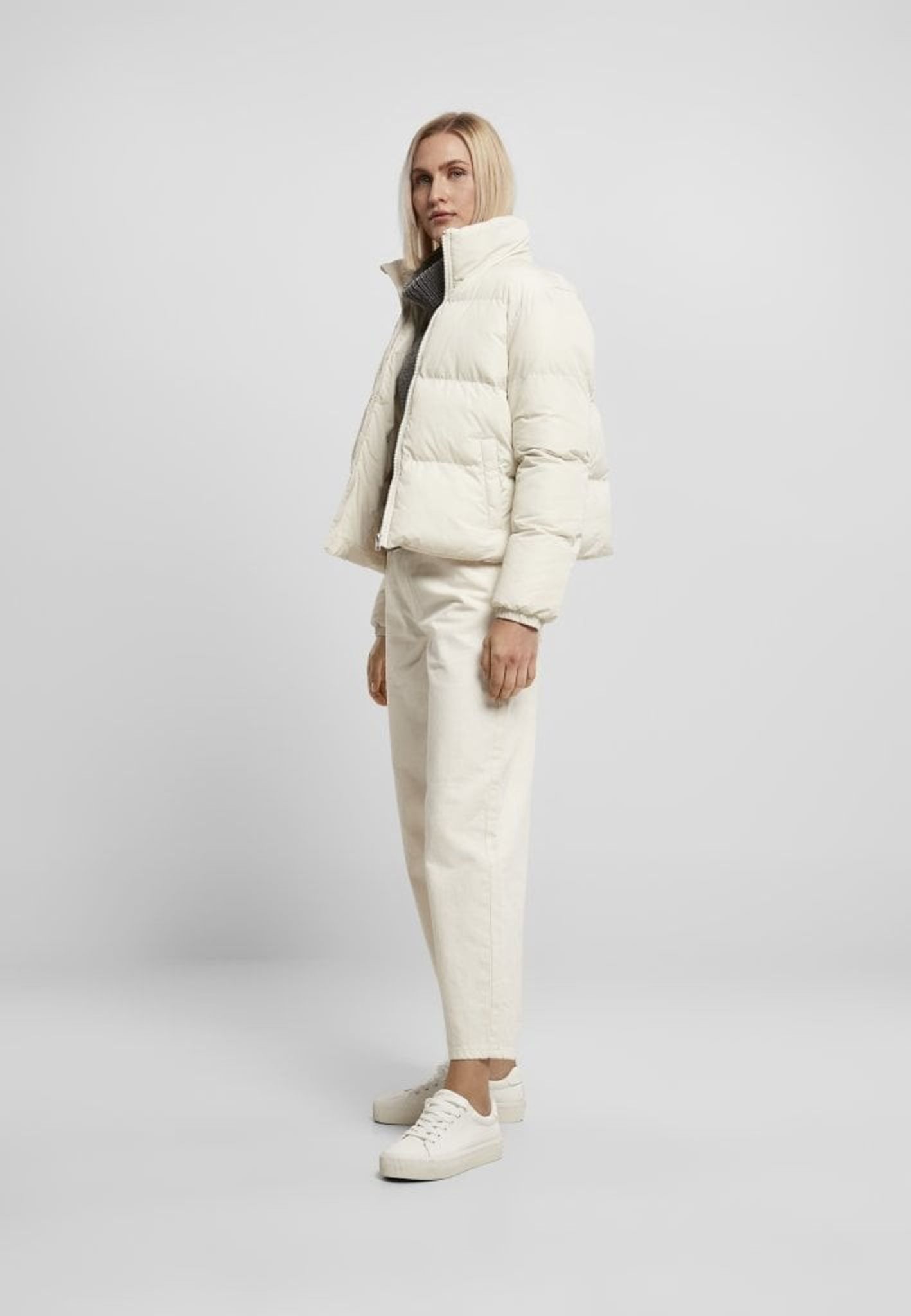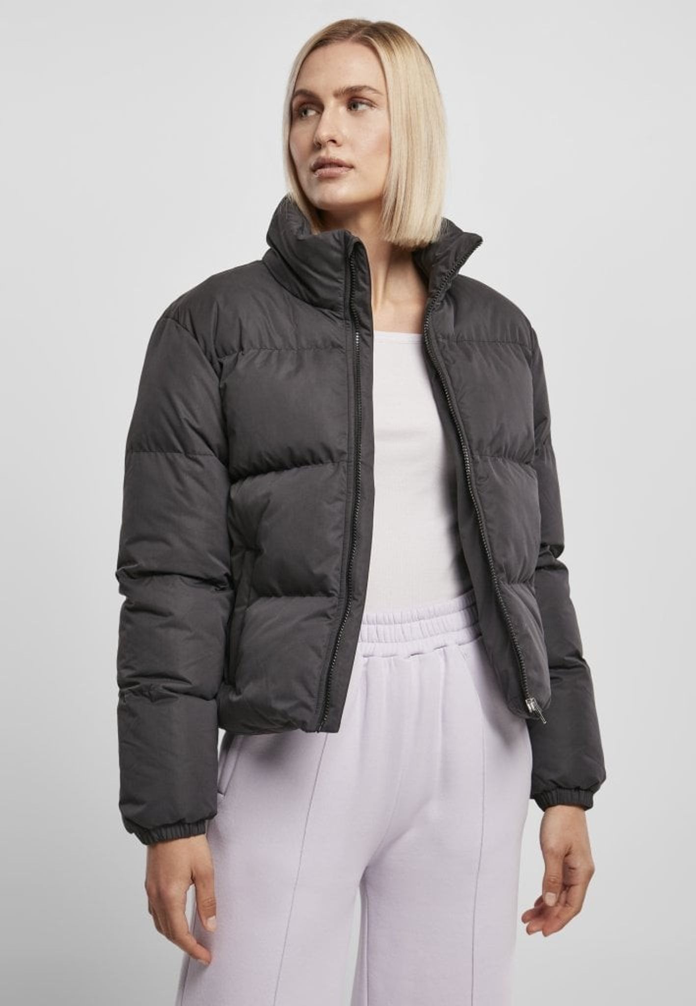 Short cut, yet with a voluminous padding – these are the effective ingredients of this women's puffer jacket that easily combines both style and comfort. Substantial cross-stitching accentuates the quilting, while narrow elasticated cuffs ensure wearing comfort. Over an elastic drawstring with stop at the hem, the puffer jacket offers a practical adjustment option. In addition, it has a cozy stand-up collar and side pockets and fastens securely with a zipper. The cut has a loose fit.