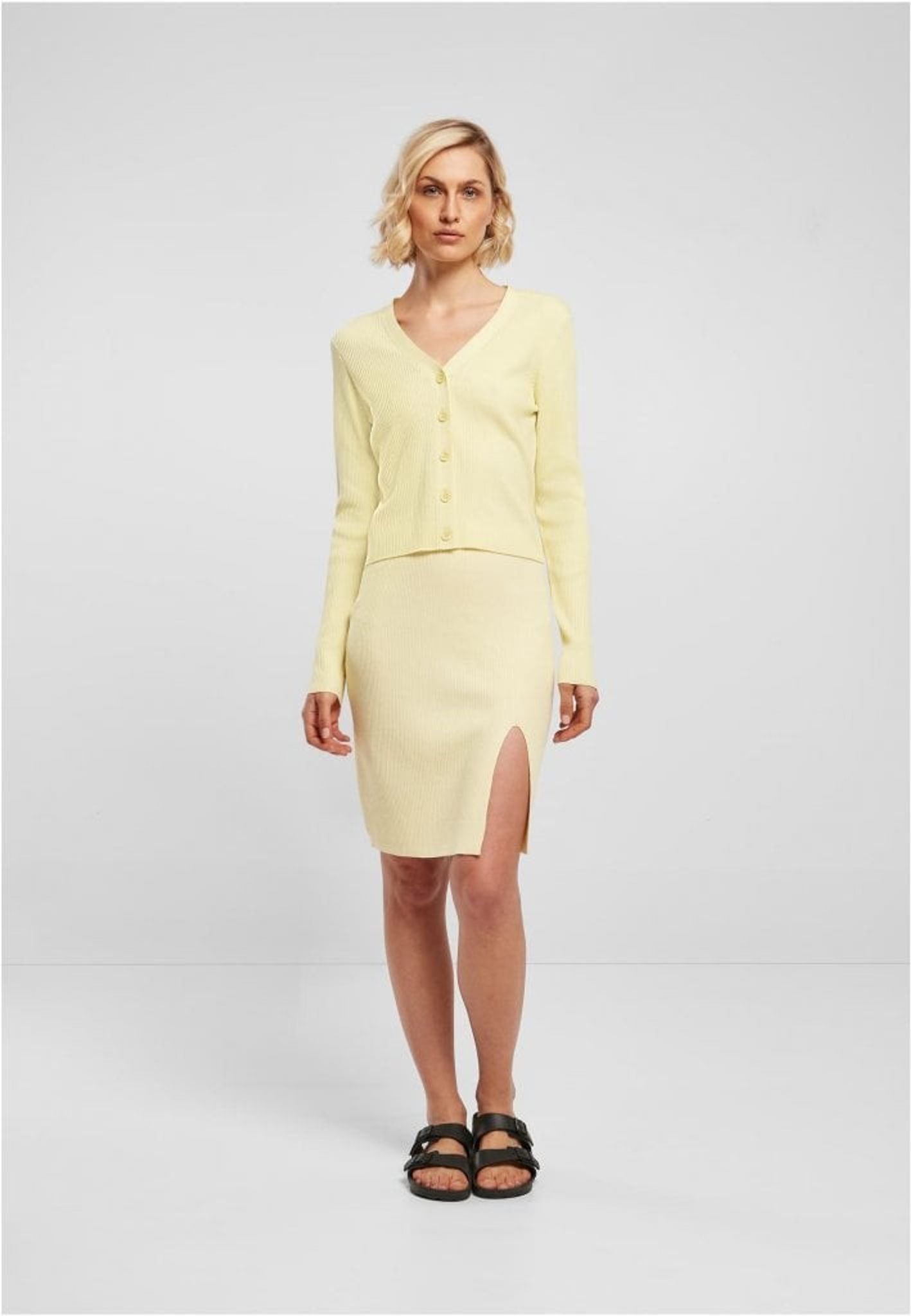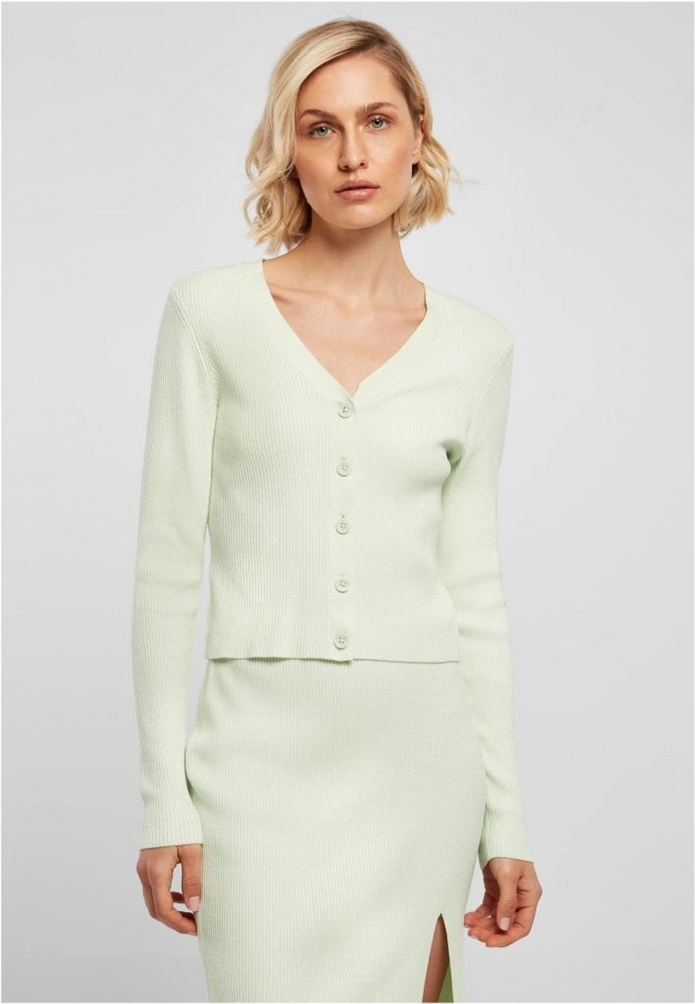 A thin knitted v-neck cardigan in a short model. The cardigan is slim and close to the body in the fit.