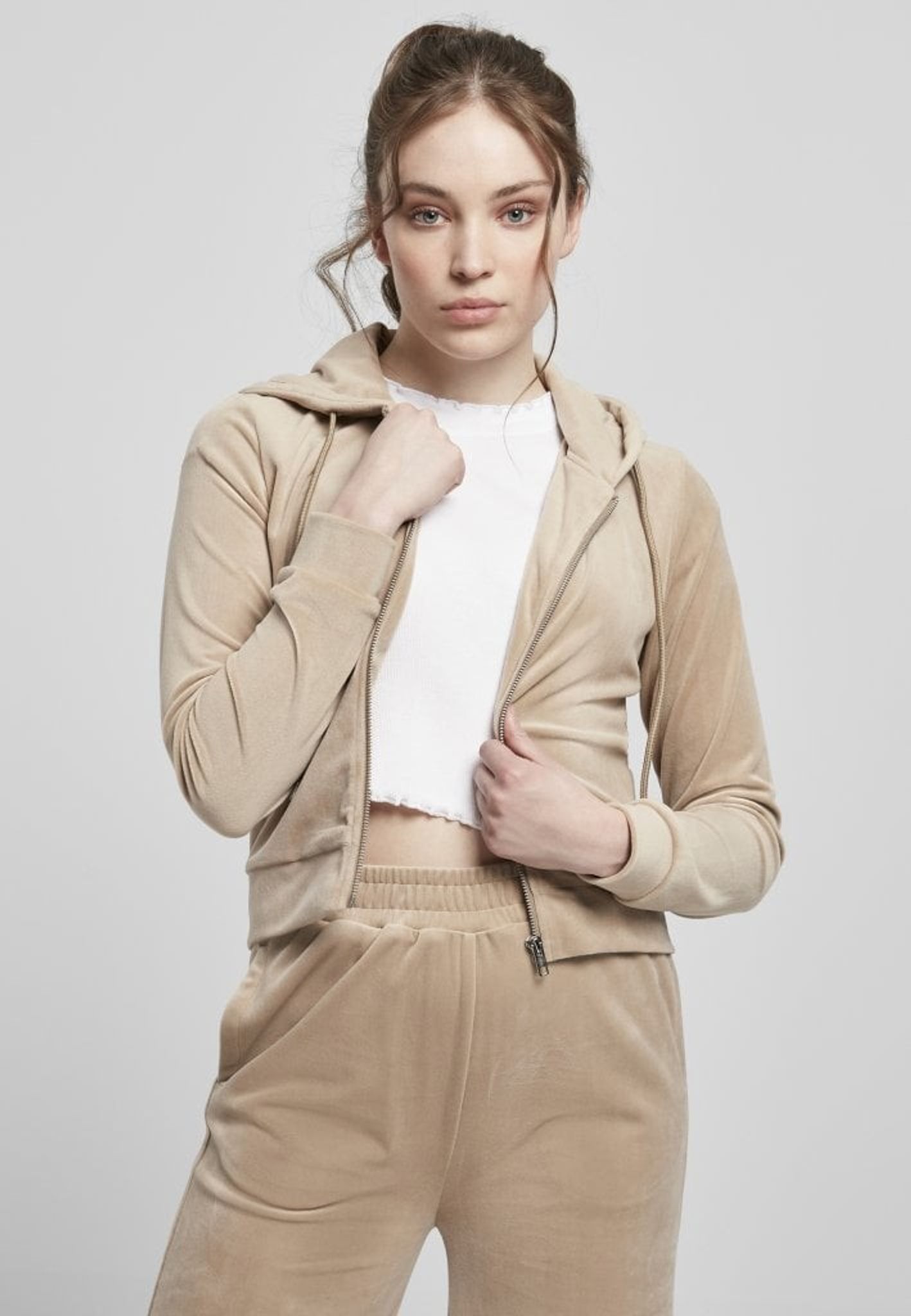 A lovely ziphoodie made of smooth stretch velvet that gives it a cozy feeling. The hoodie has elastic cuffs and is short in the model.