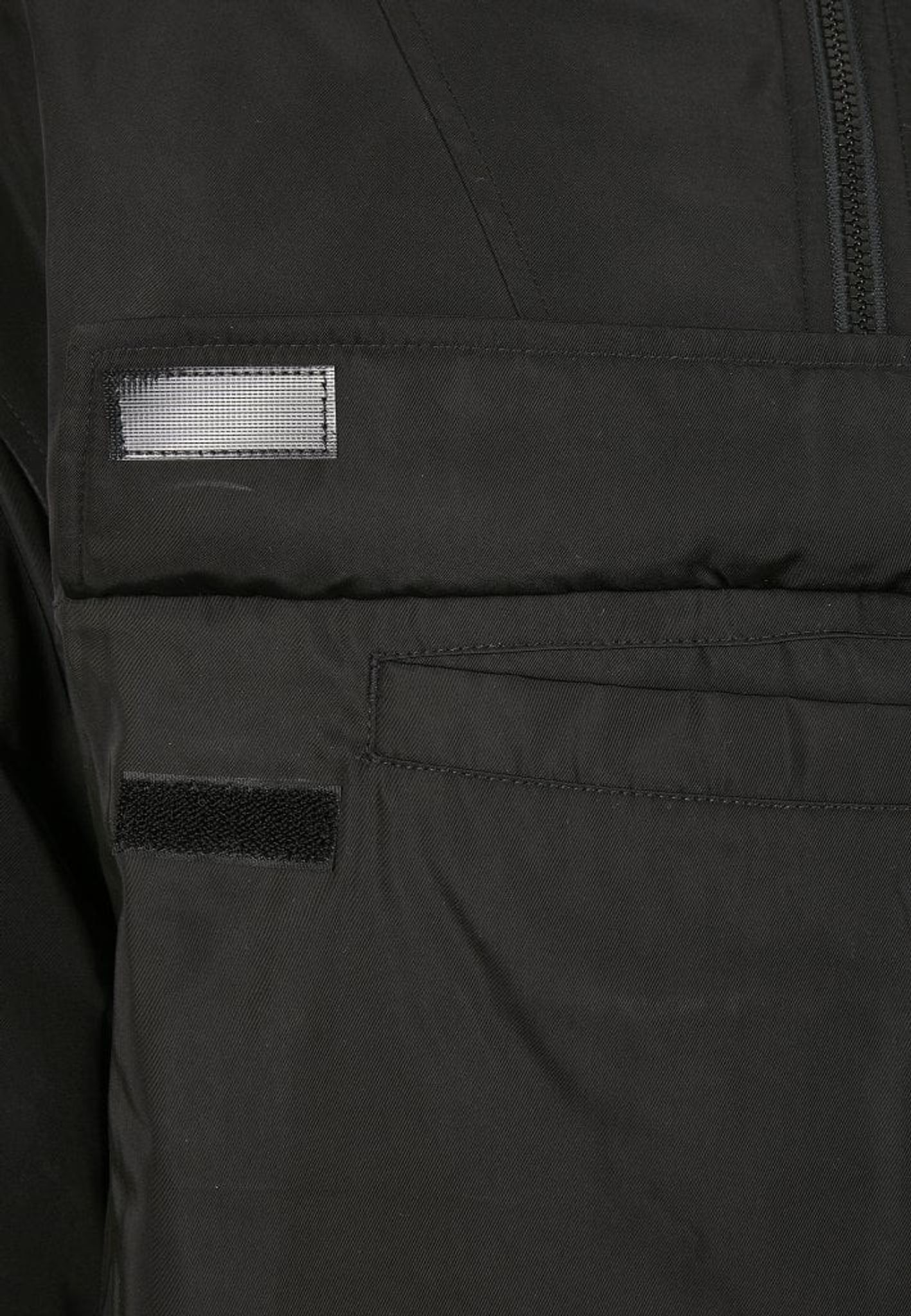 The jacket has a short zipper at the front that goes high up in the neck and on the lined hood. Under the zipper is a pocket in the middle of the chest with a lid and velcro.
